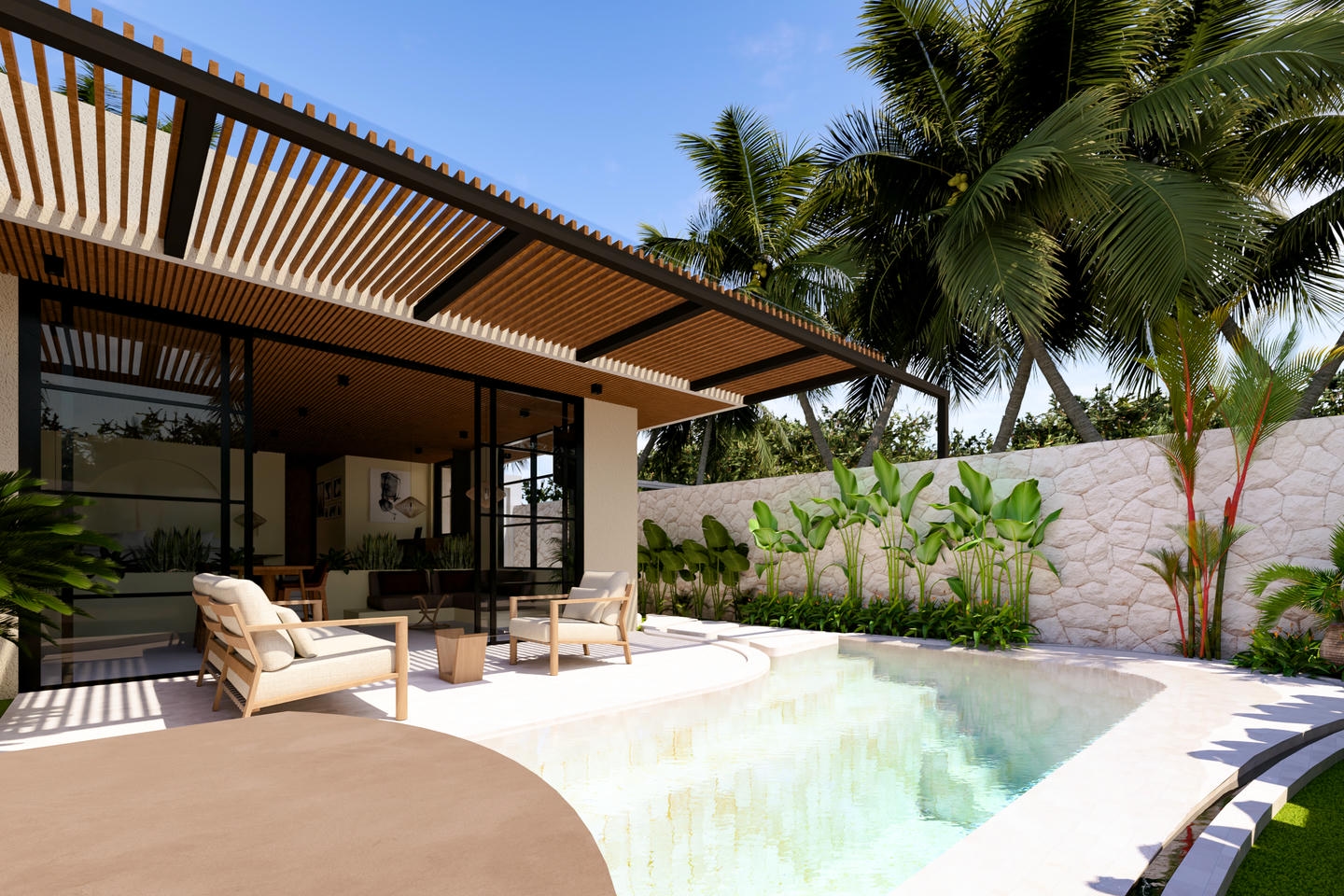 Outside, enjoy your private swimming pool with a stylish lounge area, perfect for relaxing under the Bali sun.