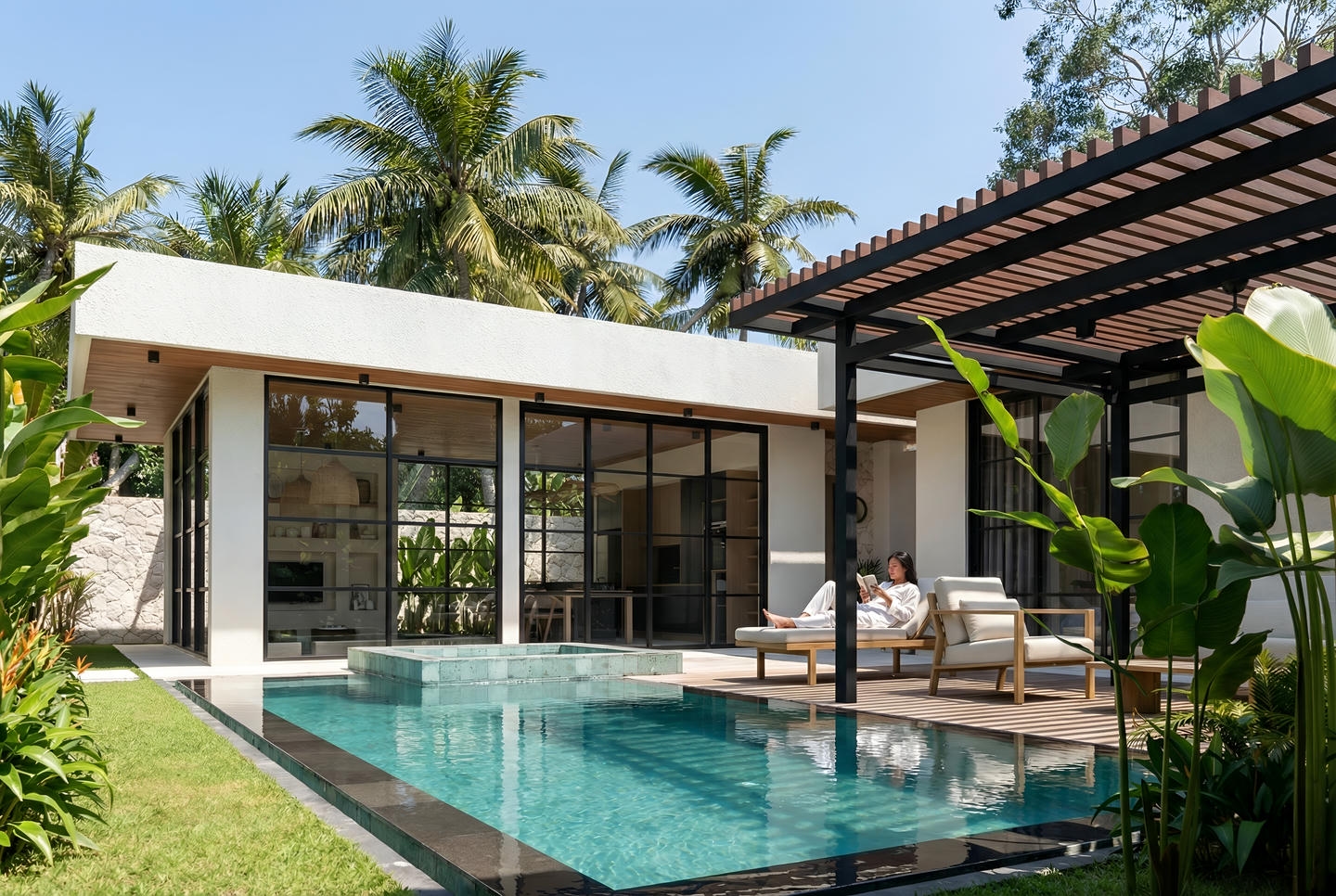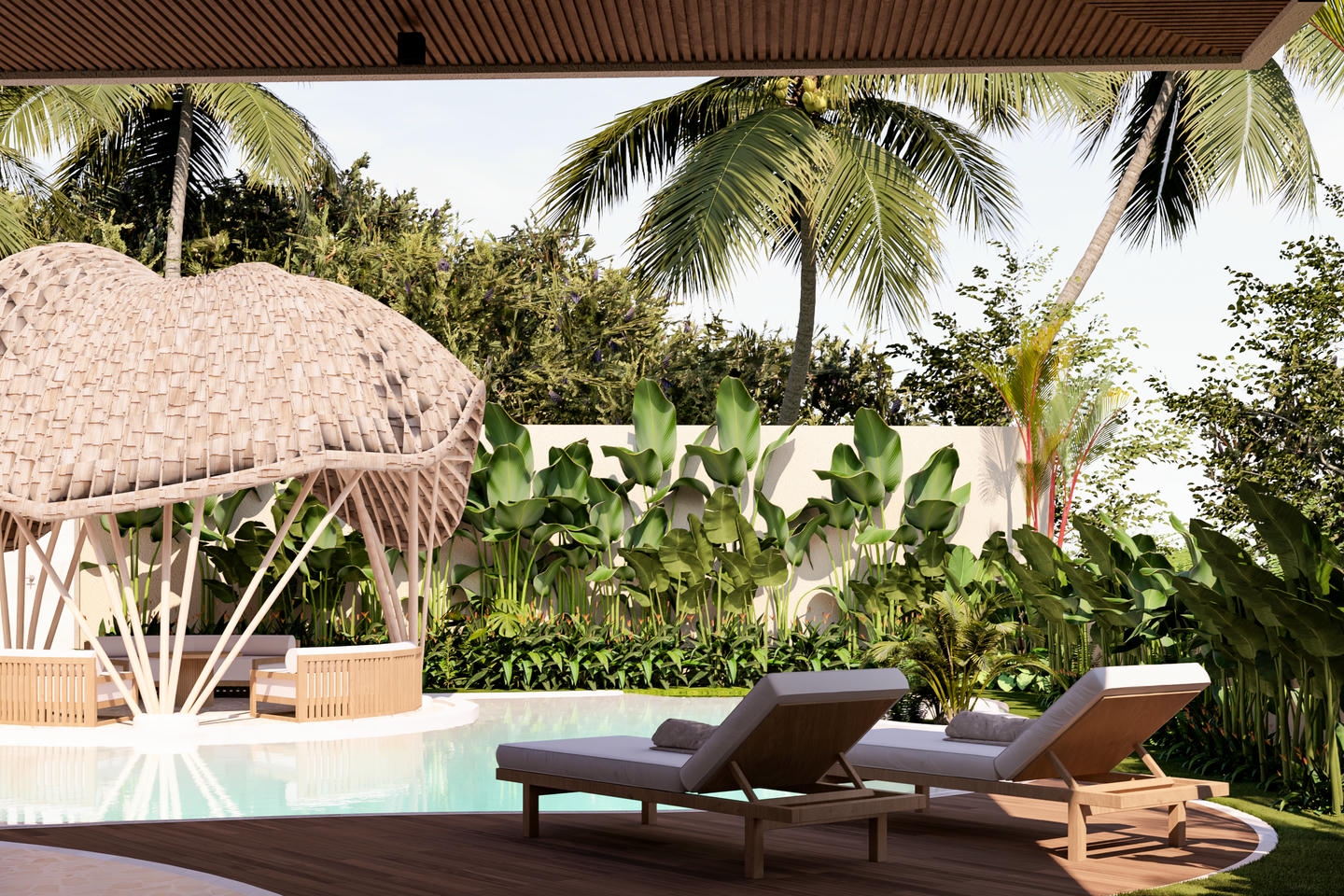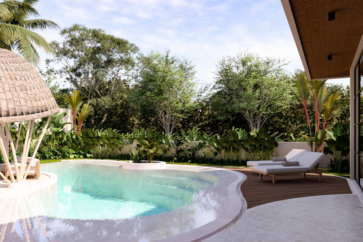 The pool, garden, and lounge area