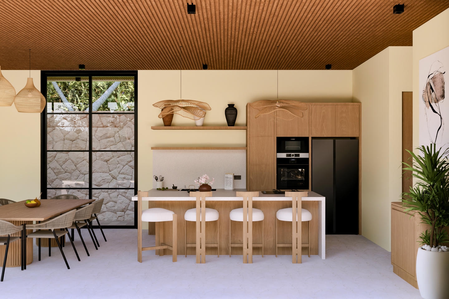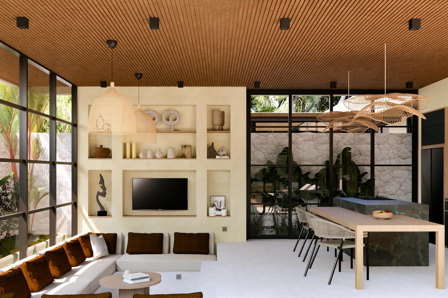 This off-plan development offers flexible options of 1, 2, or 3 bedrooms, designed with modern tropical architecture. Each villa features an enclosed living area with high-ceiling windows that create a bright and airy atmosphere. Fully furnished and thoughtfully designed, the villa includes a fully equipped kitchen, dining area, and island table — ready for comfortable living or investment.