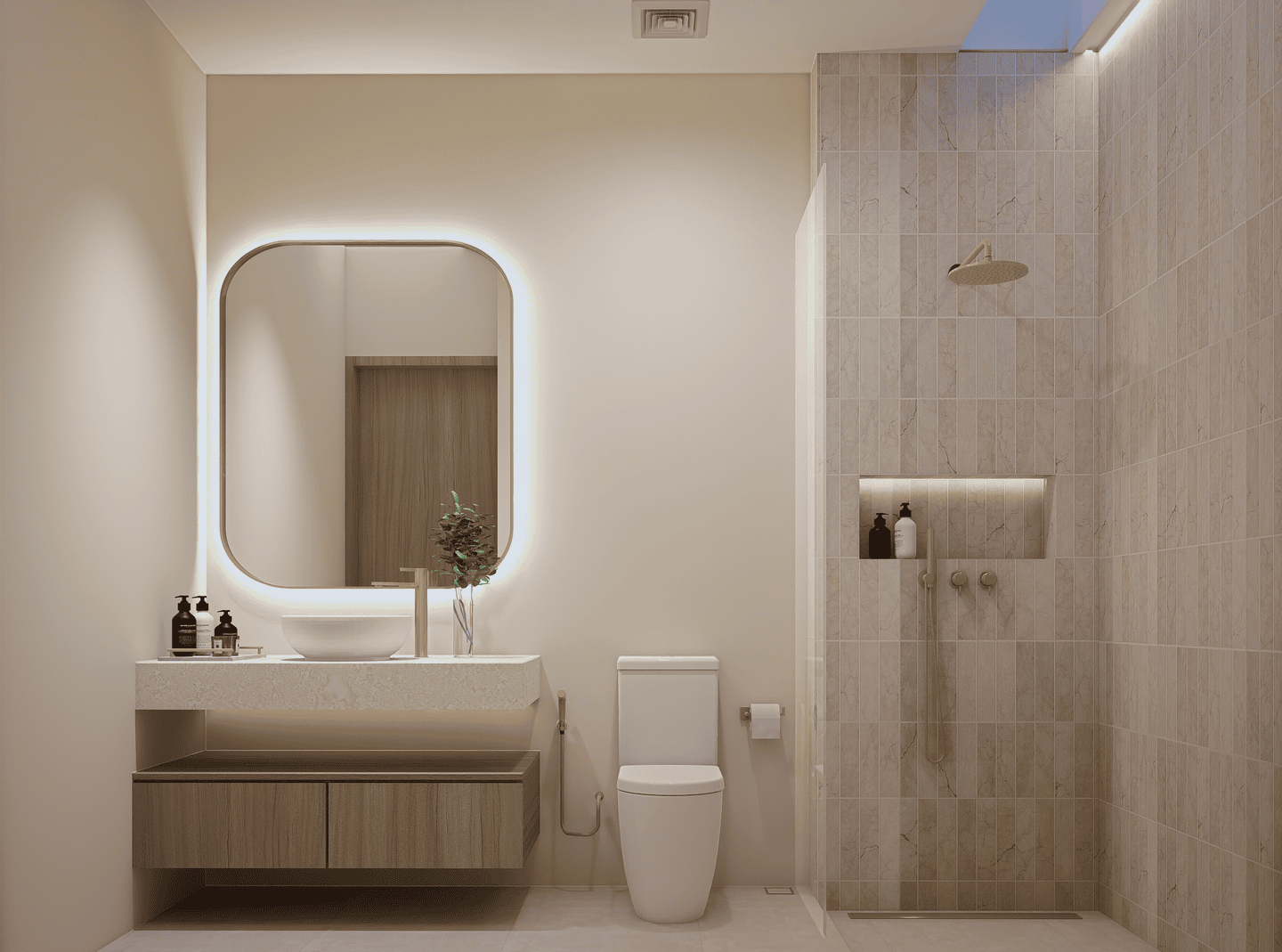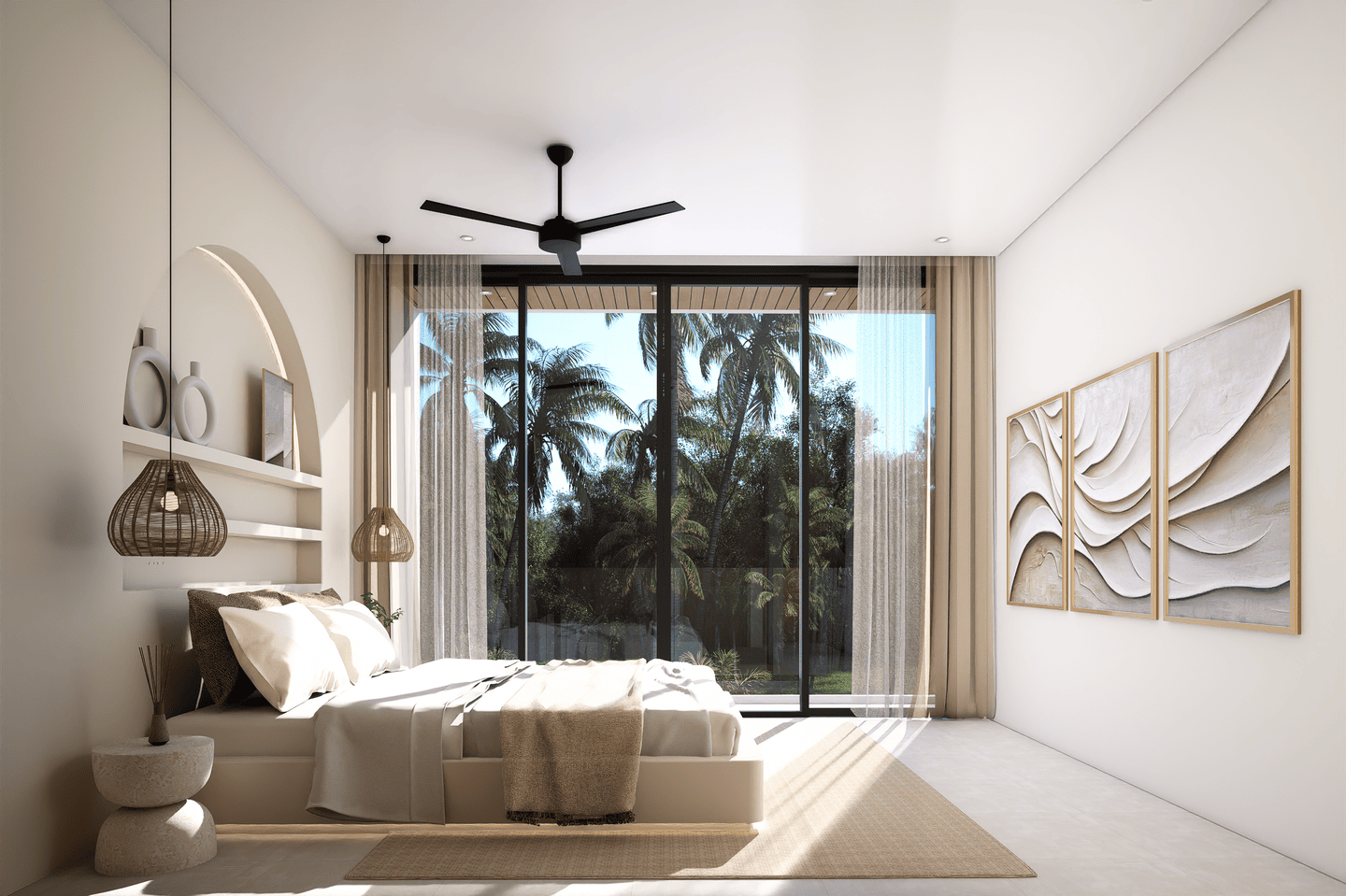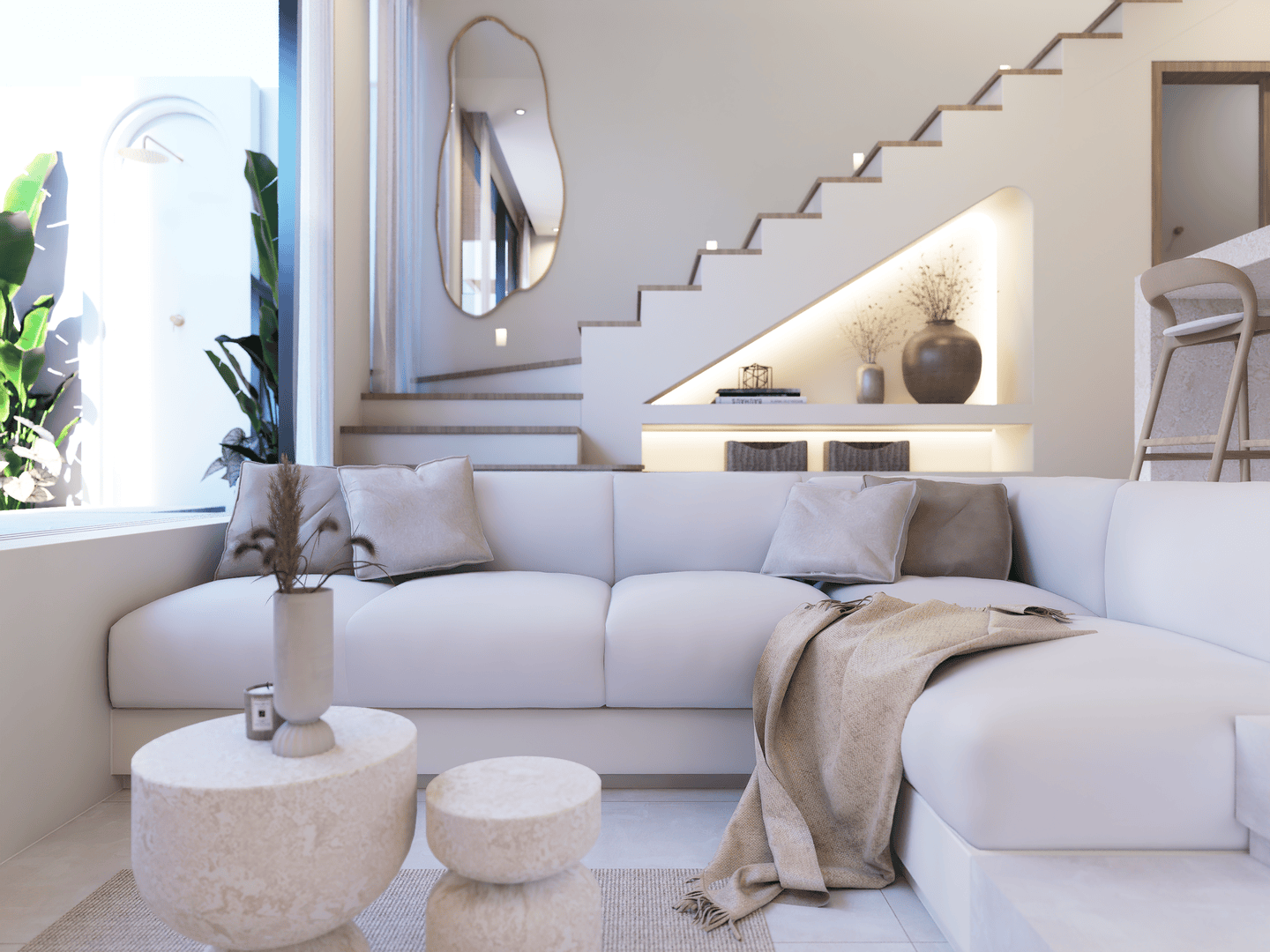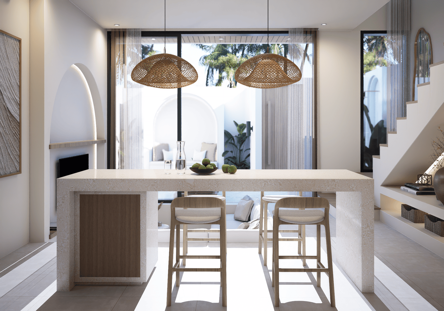 This off-plan villa features one bedroom with an ensuite bathroom, a stylish sunken living area, and high ceiling windows that bring in natural light, creating an open and airy atmosphere. It comes fully furnished with a modern, fully equipped kitchen and a convenient powder room.