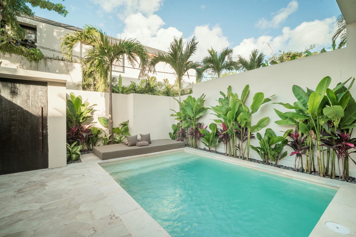Outside, you’ll find a private pool area surrounded by lush tropical greenery — perfect for unwinding after a day at the beach or entertaining guests.