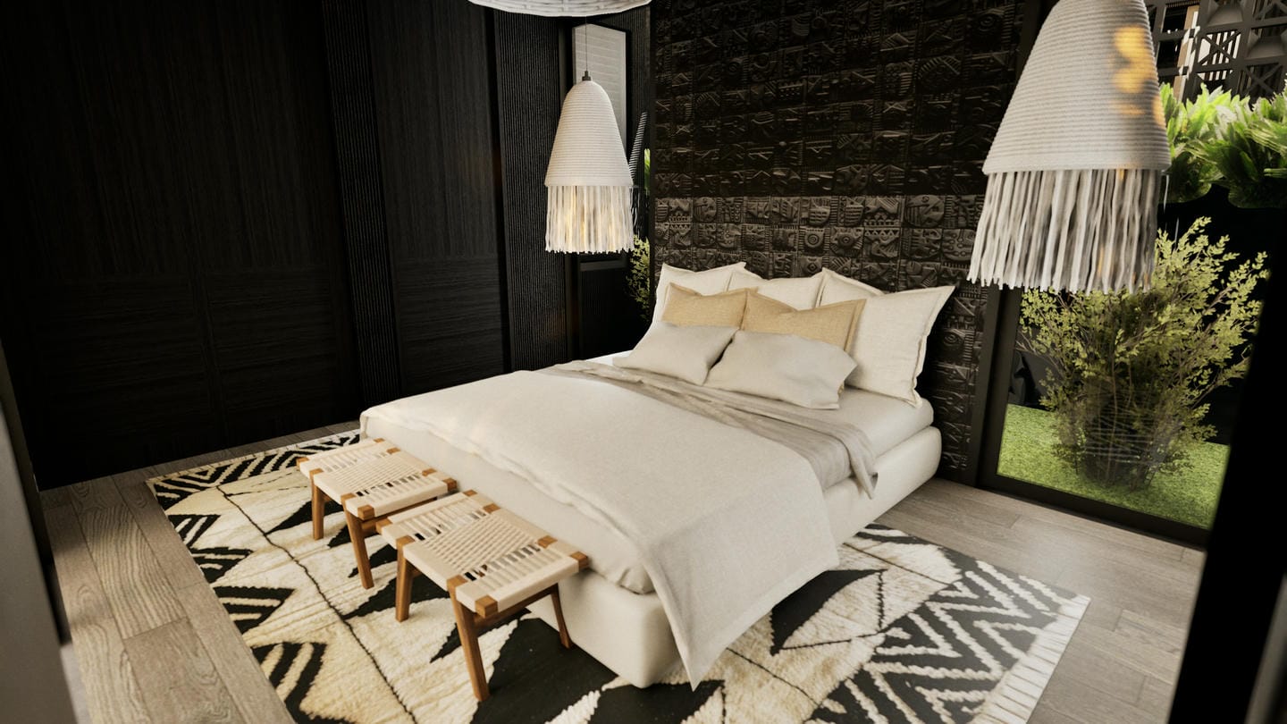 Inside, the villa features a warm modern-tropical design with rich textures, earthy tones, and refined handcrafted details. High-quality materials, contemporary furniture, and a soothing color palette create a luxurious yet cozy atmosphere throughout the living spaces.