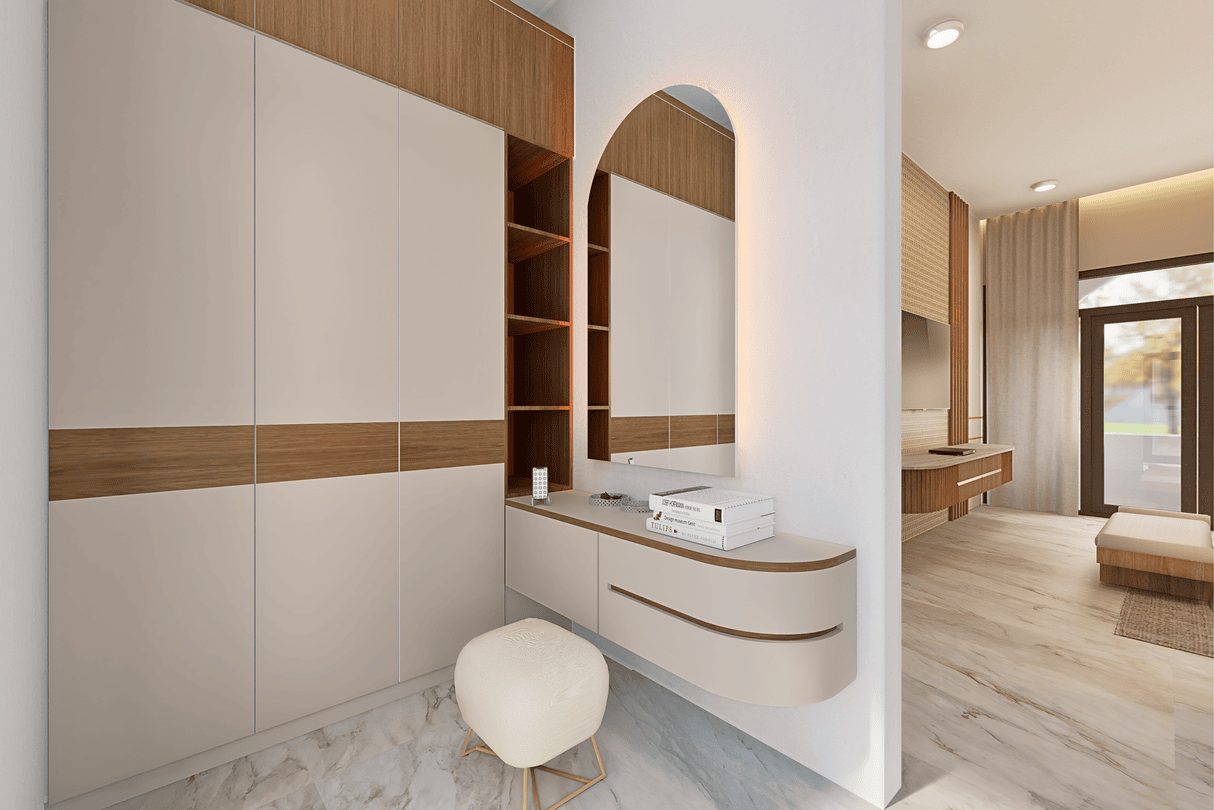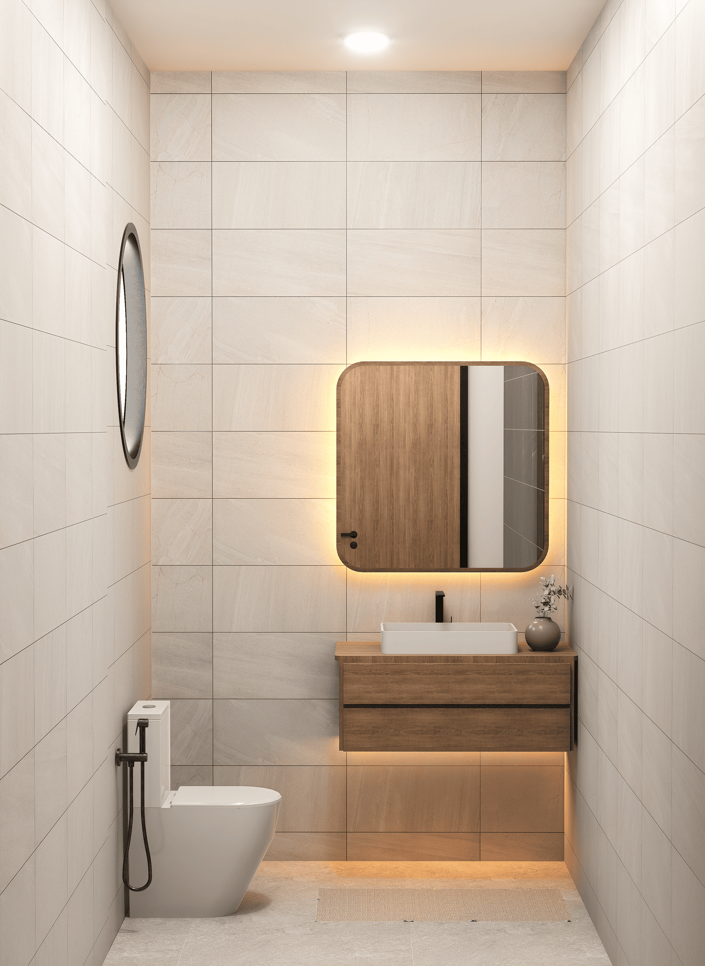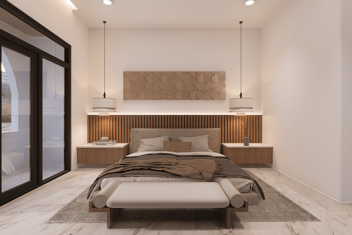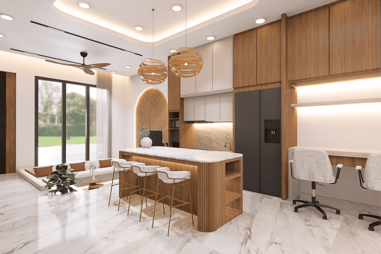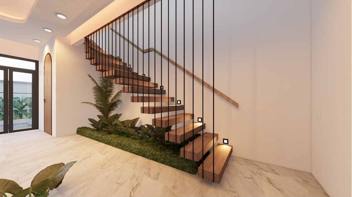 The semi-furnished villa is designed in a modern tropical style, featuring an open-plan living area that connects the living, dining, and kitchen spaces. Warm wooden accents are used throughout, and the sunken living room is complemented by a small garden beneath the staircase, allowing natural light and airflow. The bedroom is located on the second floor and includes a private balcony with ocean views, as well as an en-suite bathroom.