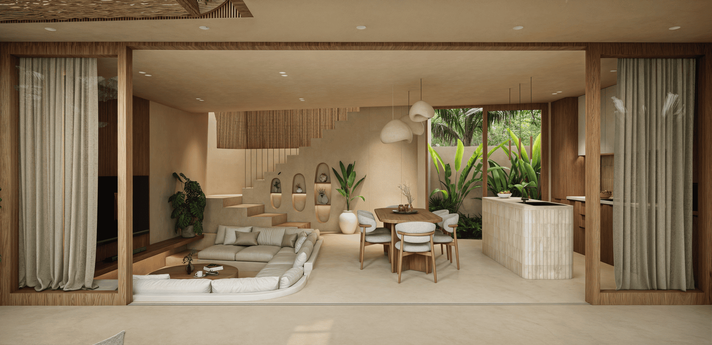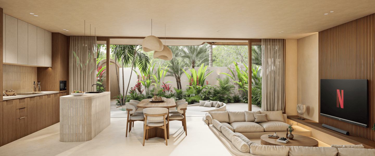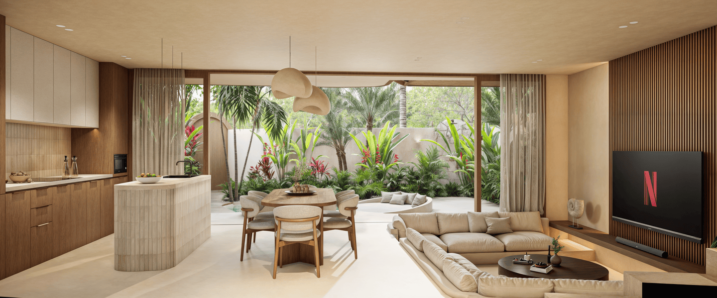 The open-plan living area is cleverly divided by a dining table, separating the kitchen space from the living area, while the use of natural materials and textured finishes throughout the villa adds warmth, sophistication, and a distinct tactile appeal.