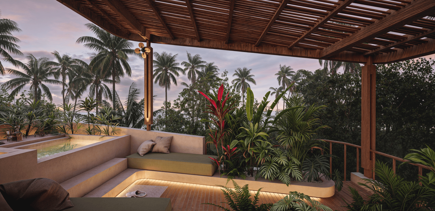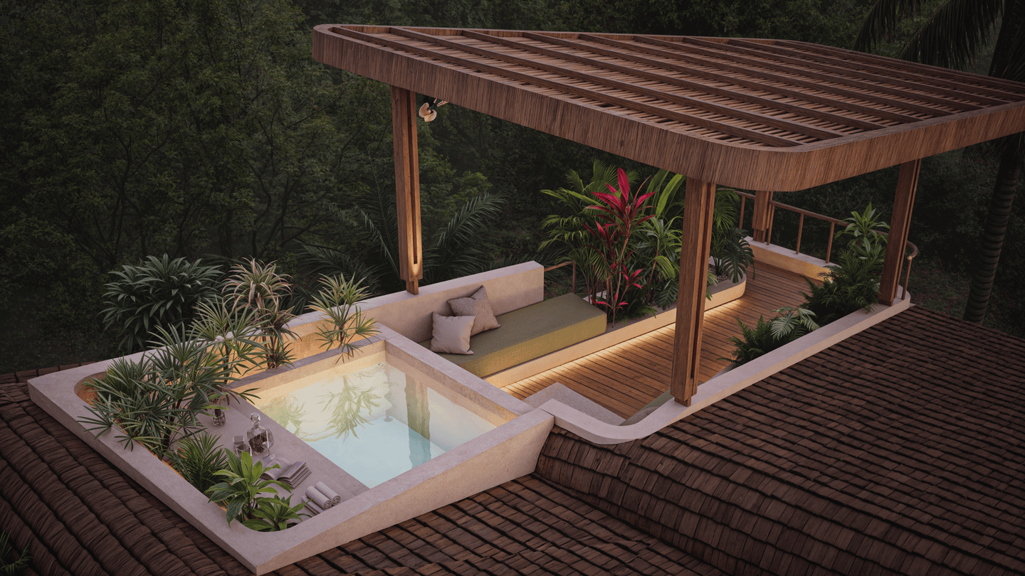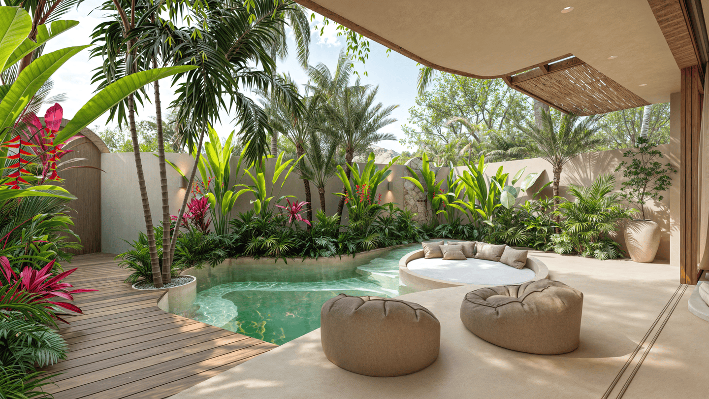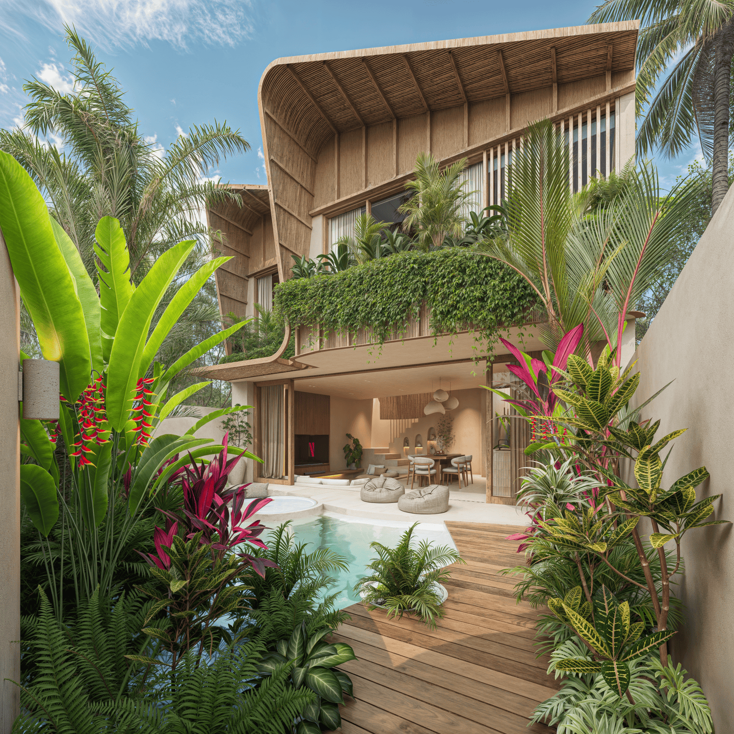 This two-bedroom villa offers a serene tropical retreat with a unique design that perfectly blends indoor comfort with outdoor living. The architecture embraces soft, rounded shapes, evoking the feeling of a tropical oasis, with a sunken lounge at the center surrounded by the swimming pool and a shaded pergola, creating a perfect space for relaxation and socializing.
