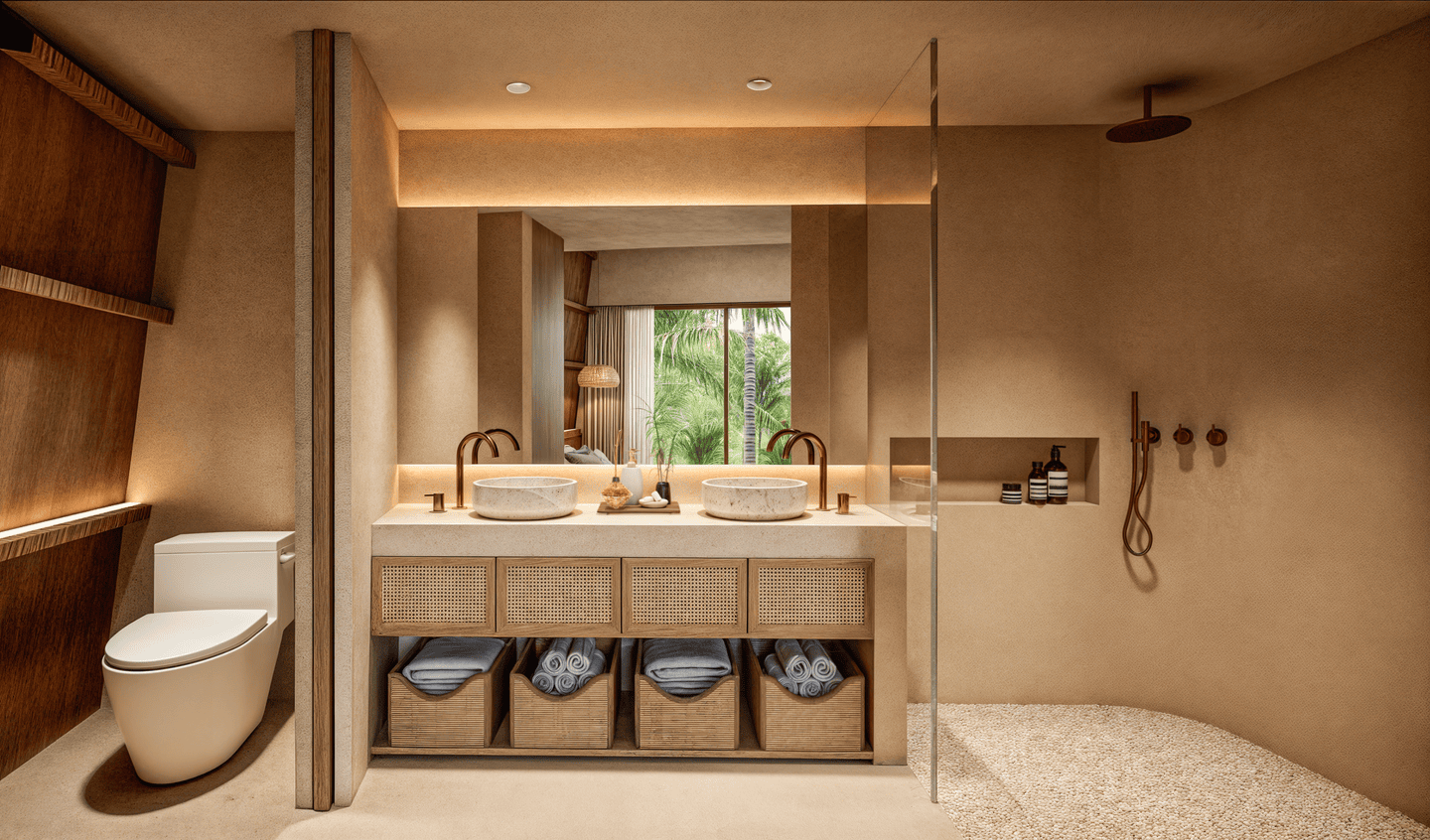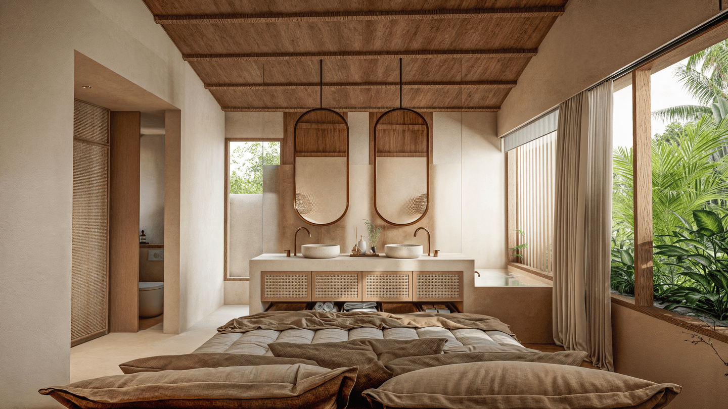 Upstairs, the villa features two bedrooms, including a master suite with a luxurious bathtub and separate shower. A powder island elegantly separates the bed area from the shower space, offering both style and functionality.