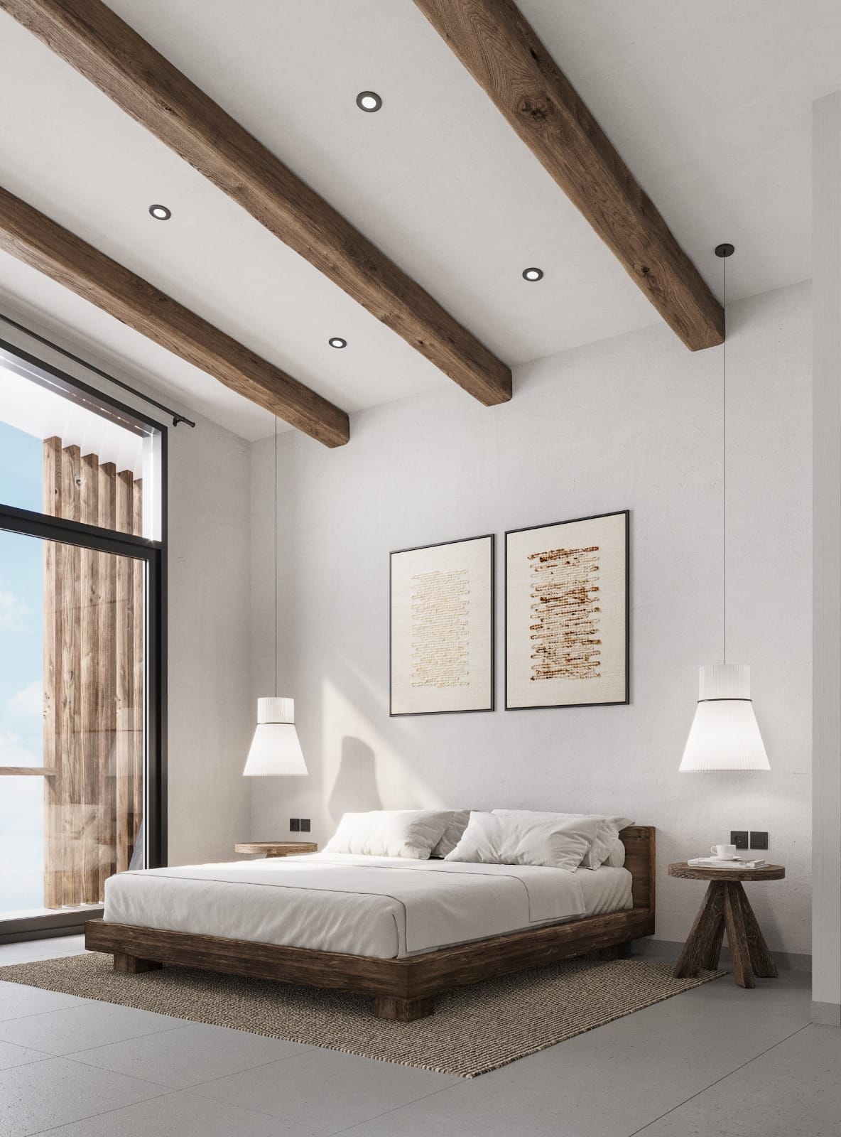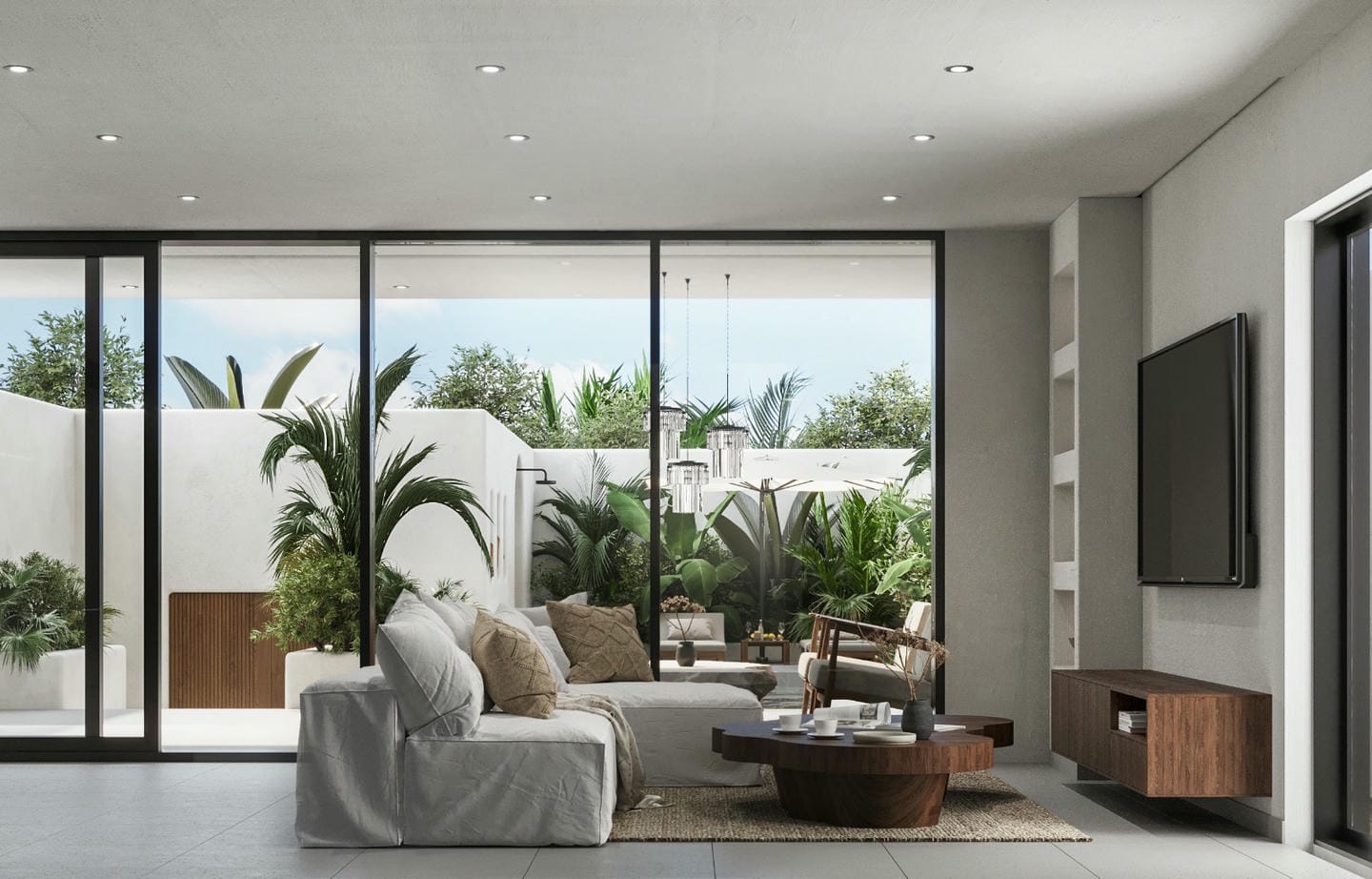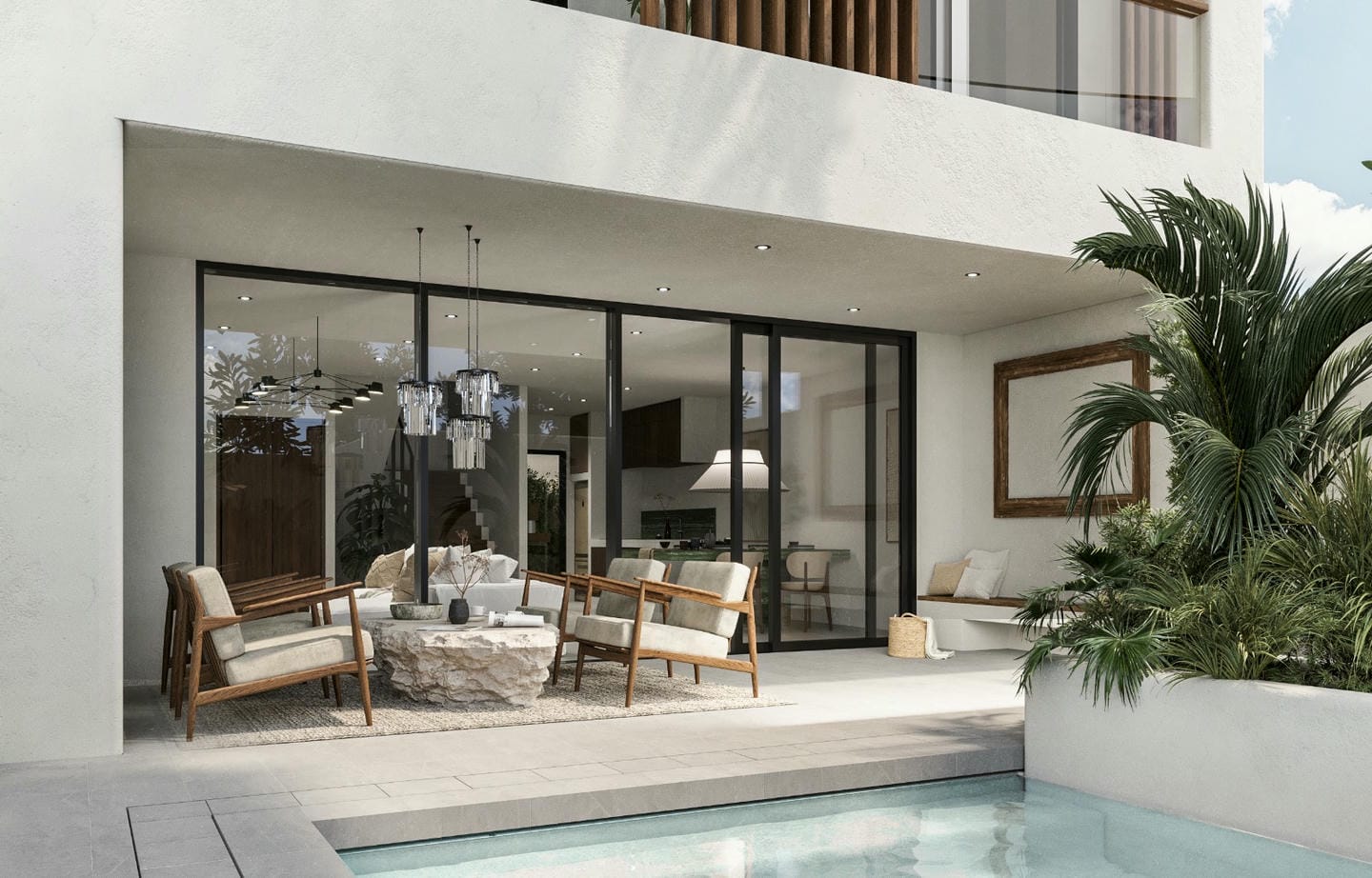 This fully furnished villa features a modern design with large glass doors and windows that allow plenty of natural light to fill the space. The kitchen is fully equipped and complemented by a dining area seamlessly connected to the living room. The villa has two storeys, with two bedrooms located on the second floor, each with its own bathroom and a private balcony.