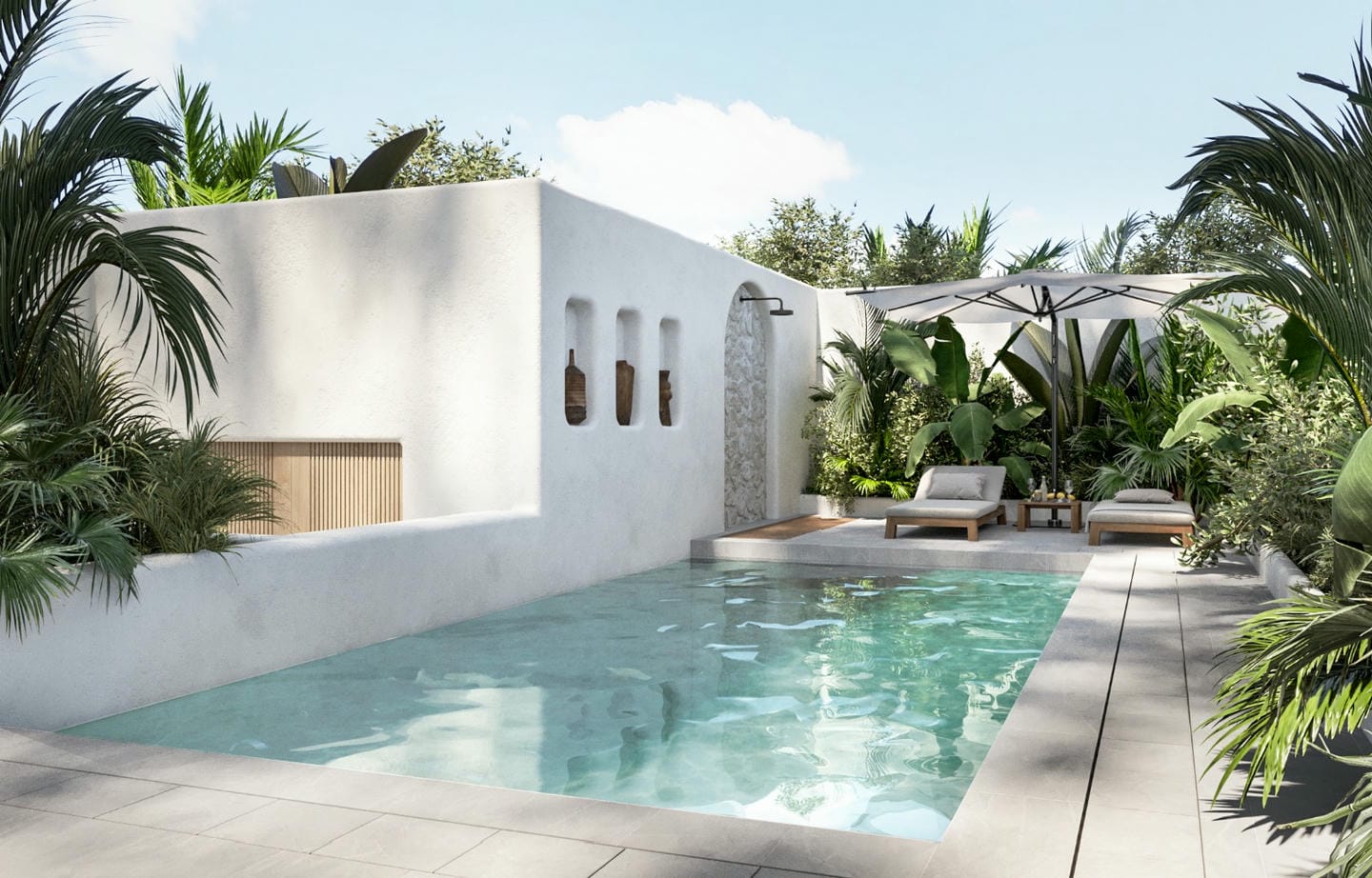 Step outside to a beautiful outdoor area featuring a private swimming pool, lounge chairs, and an outdoor shower surrounded by lush tropical plants the perfect place to relax and enjoy the Bali sun.