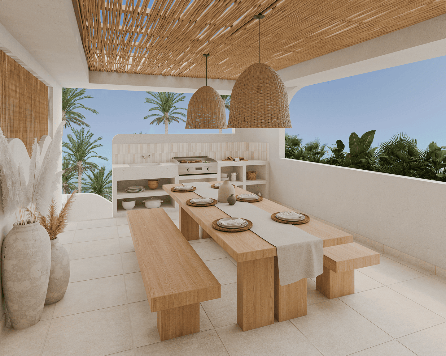 Step outside to a private swimming pool and a cozy cabana beside it—an ideal spot to enjoy sunny days. The sheltered rooftop adds even more space, perfect for relaxing or entertaining.