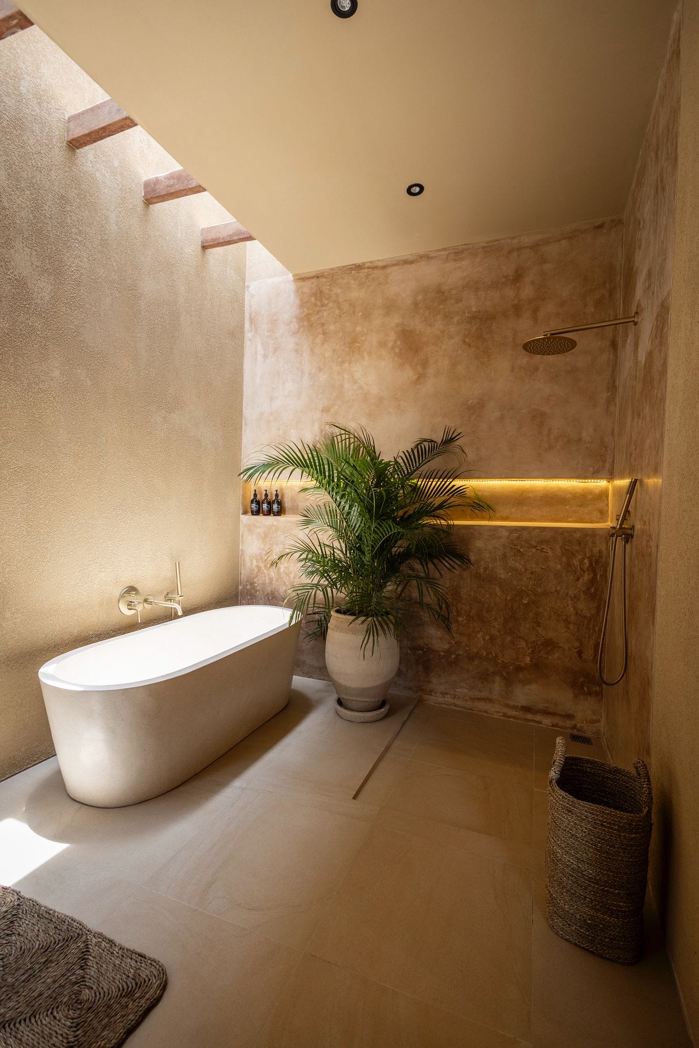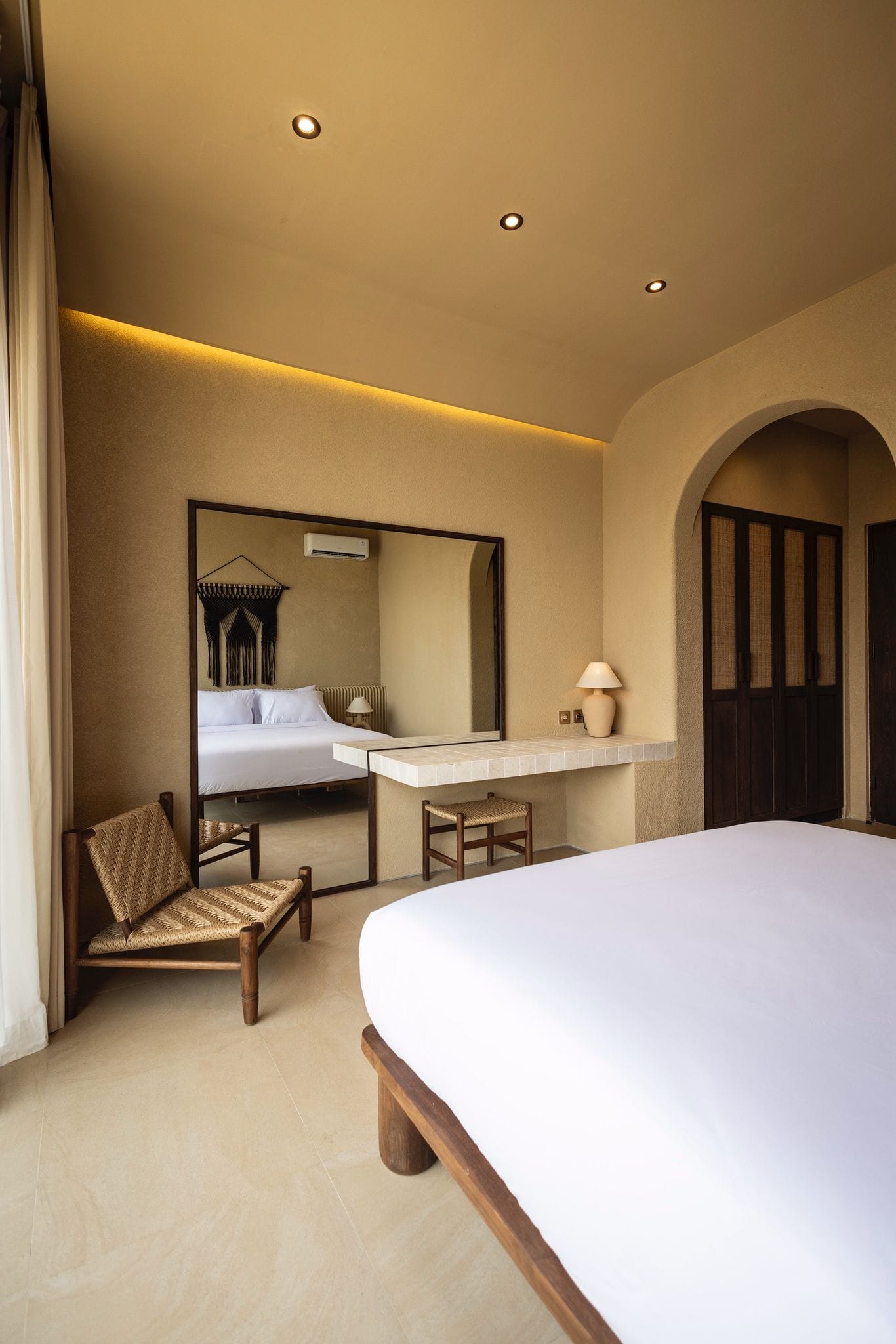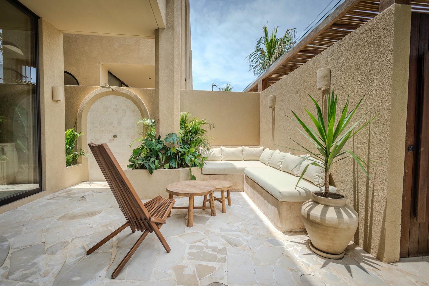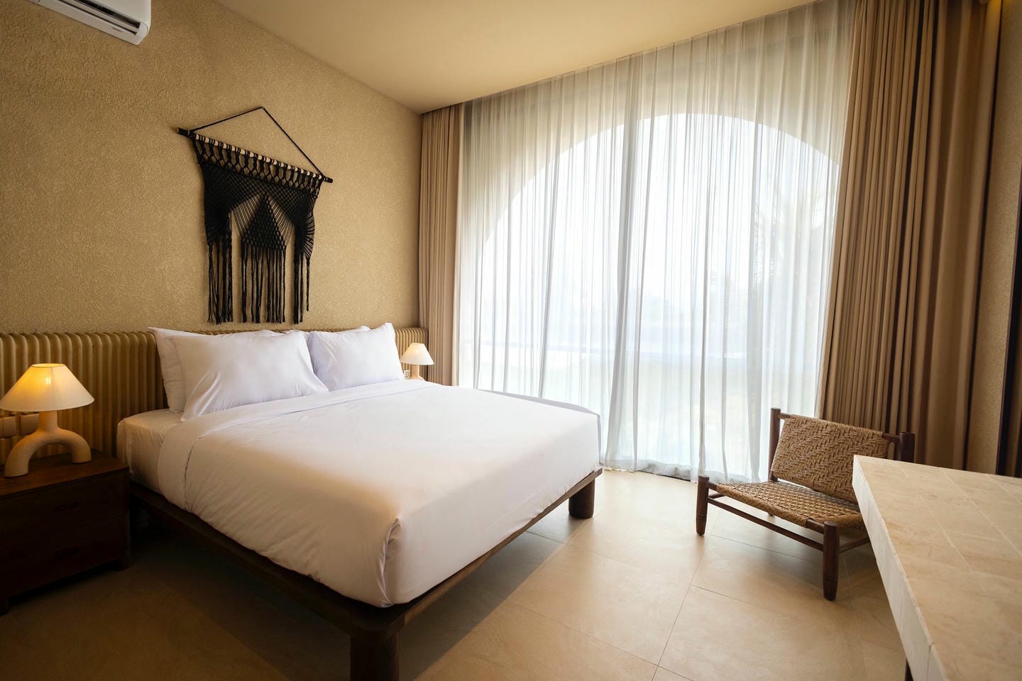 The interior design embraces a refined tropical-modern aesthetic, combining warm neutral tones. Thoughtfully designed living spaces flow seamlessly from one area to another, with high ceilings and large openings that allow natural light to fill the rooms. The 2 bedrooms are designed for comfort and relaxation, complemented by ensuite bathrooms featuring clean lines and natural finishes.