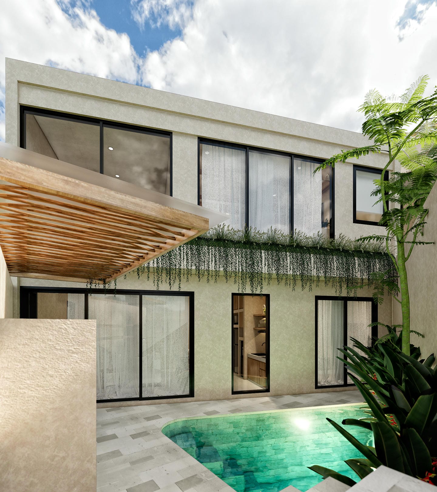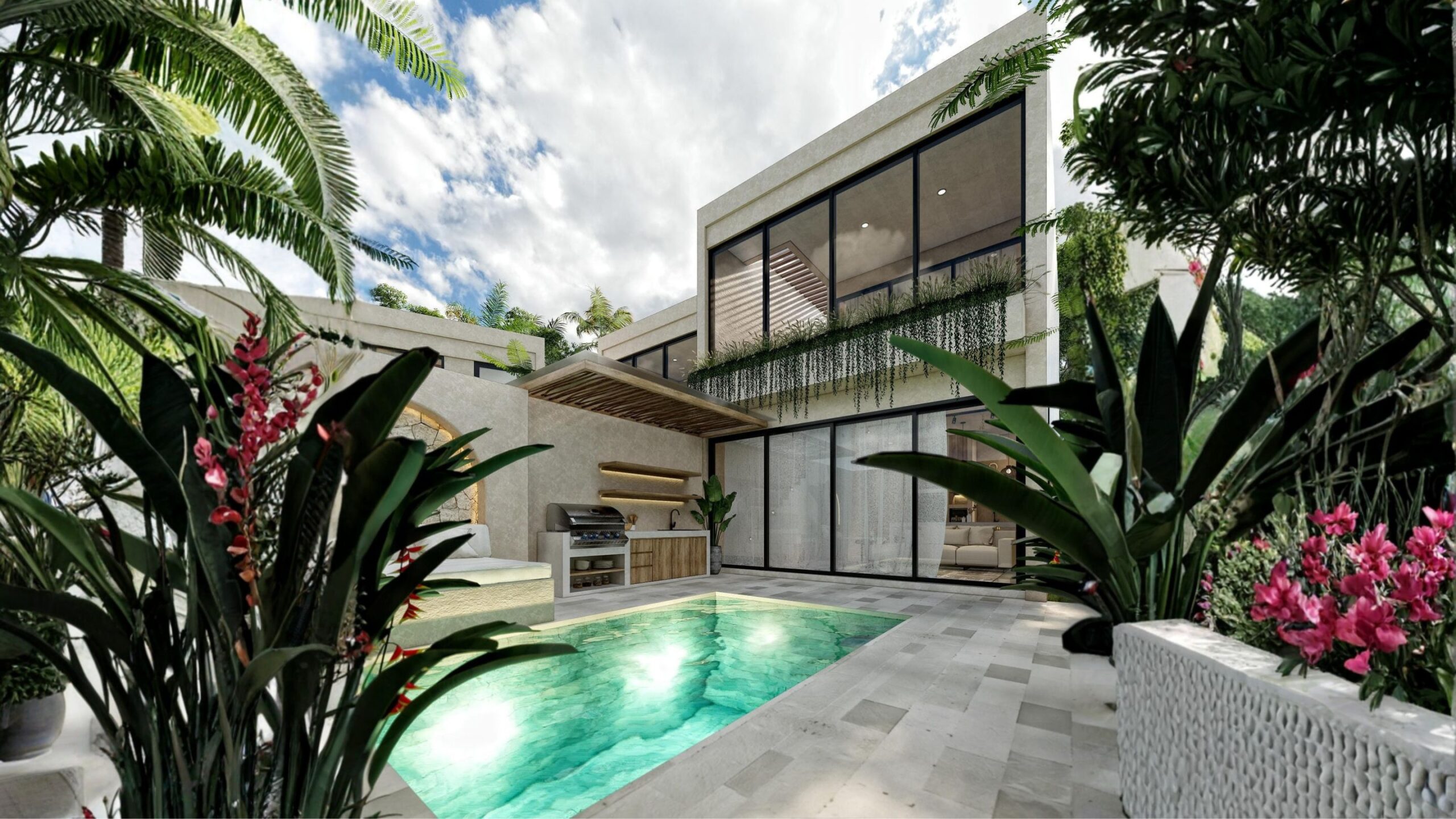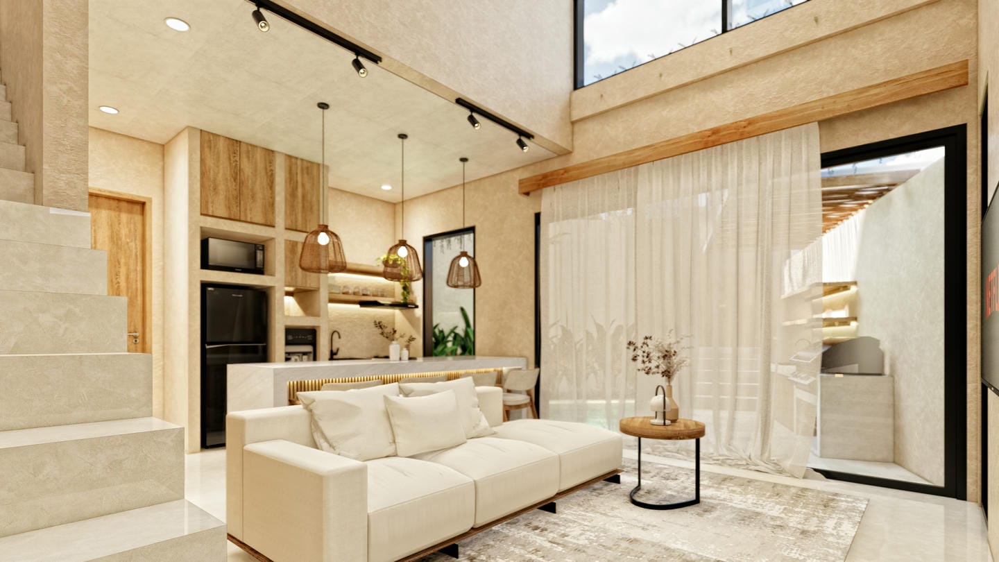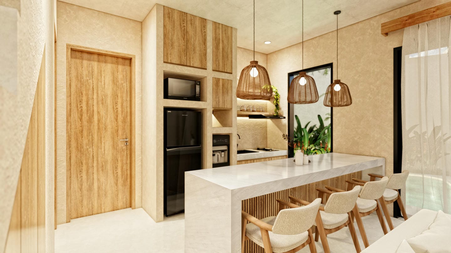 As you enter the villa, you’re welcomed into a bright and airy living space, featuring high ceilings and large windows that flood the interior with natural light. The open-plan kitchen and living area are thoughtfully designed to create a warm, social atmosphere, with natural tones and wood accents that add a refined tropical touch. A central island in the kitchen provides the perfect space for cooking while enjoying time with friends or family. Spread across two floors, the villa includes two spacious bedrooms, each with its own ensuite bathroom complete with both a bathtub and a shower. The ground-floor bedroom opens onto a peaceful inner garden, while the upstairs bedroom connects to a private balcony.