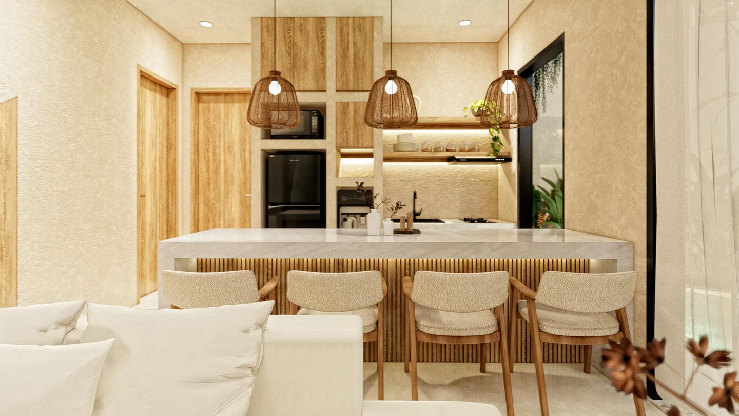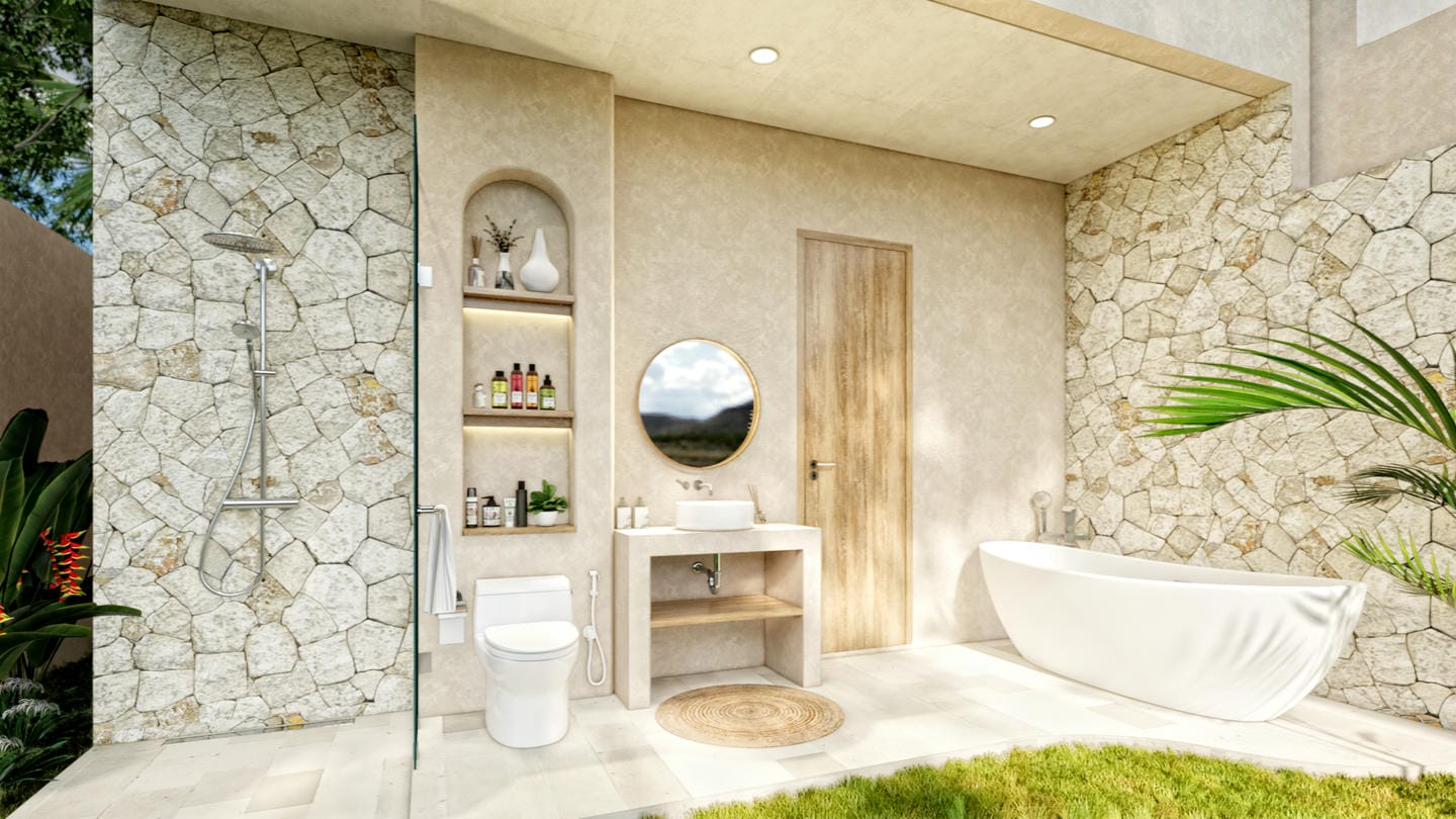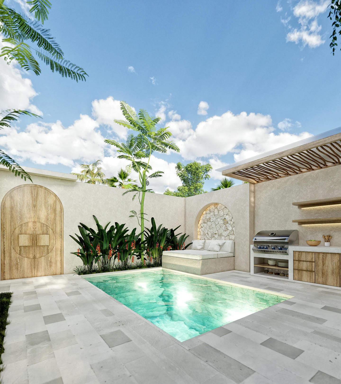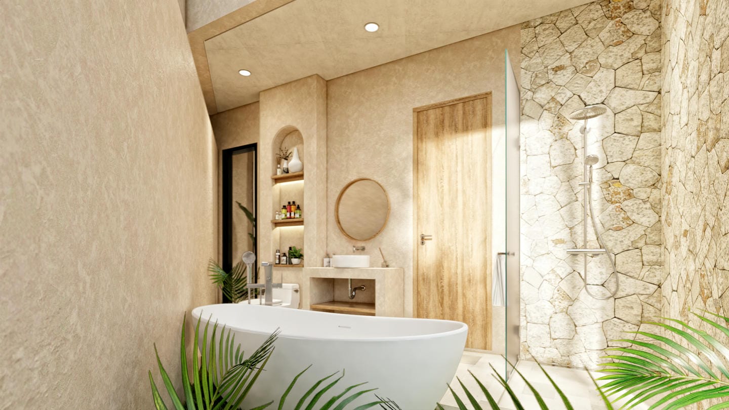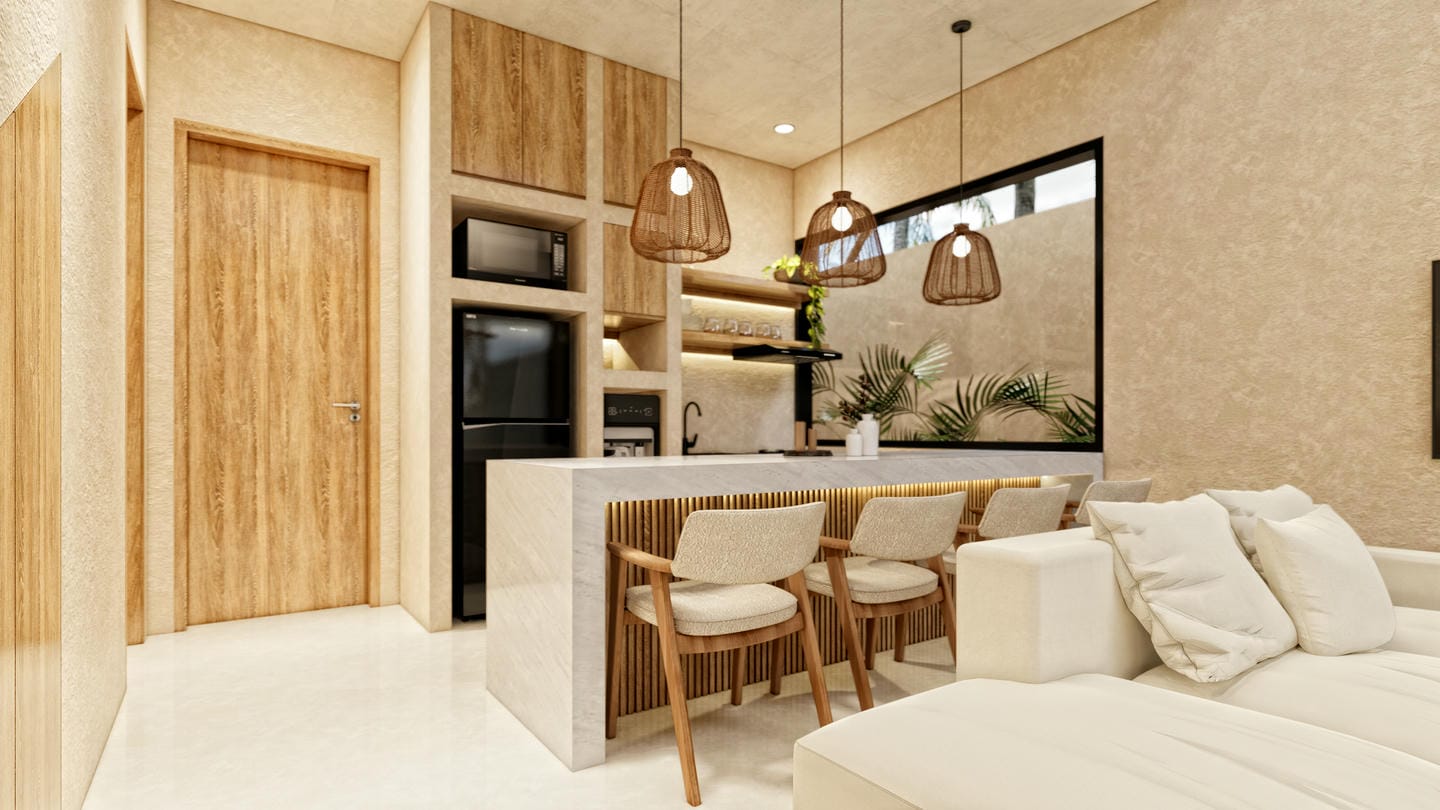 As you enter the villa, you’re welcomed into a bright and airy living space, featuring high ceilings and large windows that flood the interior with natural light. The open-plan kitchen and living area are thoughtfully designed to create a warm, social atmosphere, with natural tones and wood accents that add a refined tropical touch. A central island in the kitchen provides the perfect space for cooking while enjoying time with friends or family. Spread across two floors, the villa includes two spacious bedrooms, each with its own ensuite bathroom complete with both a bathtub and a shower. The ground-floor bedroom opens onto a peaceful inner garden, while the upstairs bedroom connects to a private balcony.