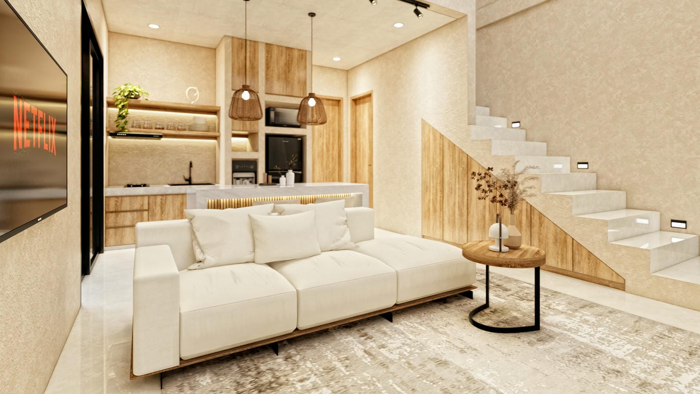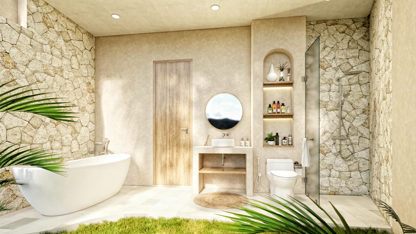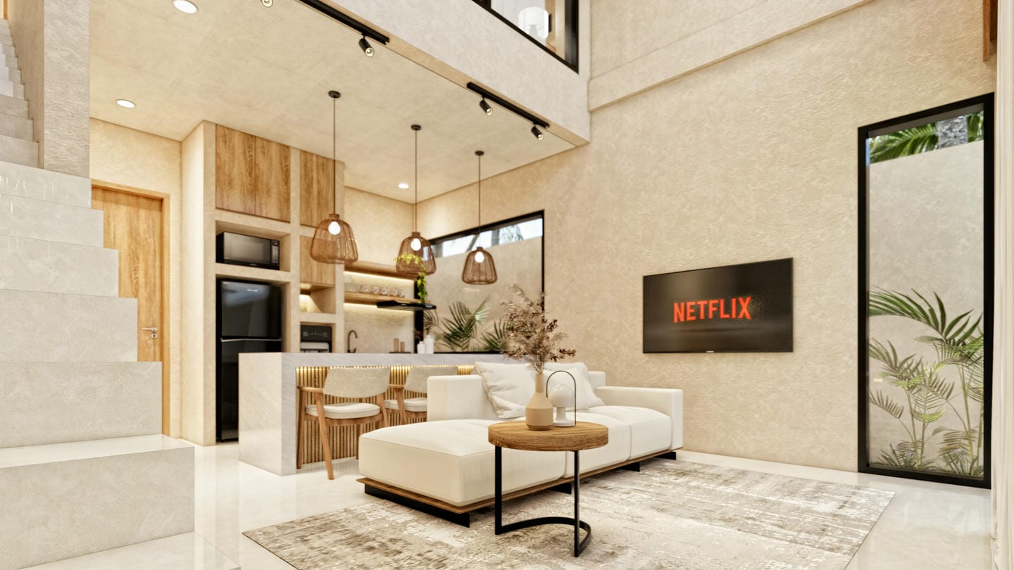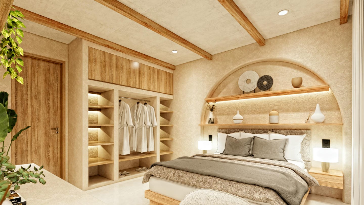 As you enter the villa, you’re welcomed into a bright and airy living space, featuring high ceilings and large windows that flood the interior with natural light. The open-plan kitchen and living area are thoughtfully designed to create a warm, social atmosphere, with natural tones and wood accents that add a refined tropical touch. A central island in the kitchen provides the perfect space for cooking while enjoying time with friends or family. Spread across two floors, the villa includes two spacious bedrooms, each with its own ensuite bathroom complete with both a bathtub and a shower. The ground-floor bedroom opens onto a peaceful inner garden, while the upstairs bedroom connects to a private balcony.