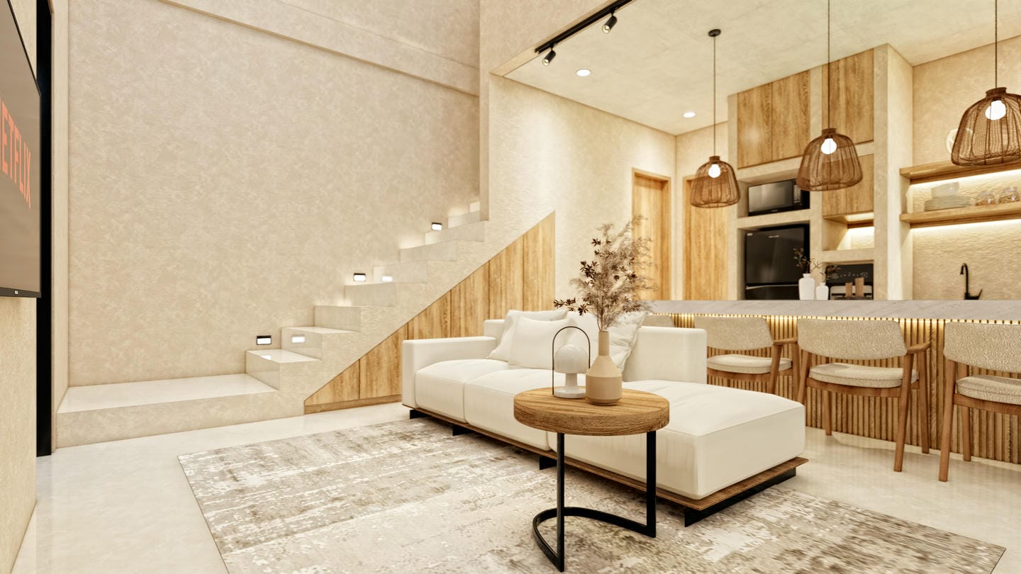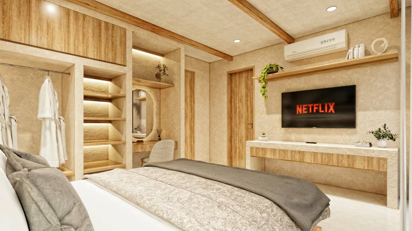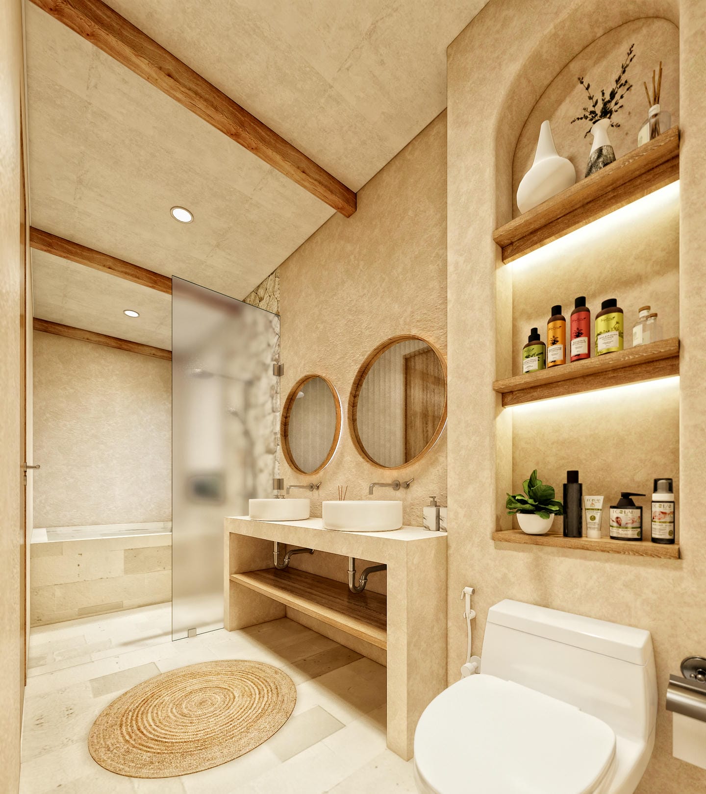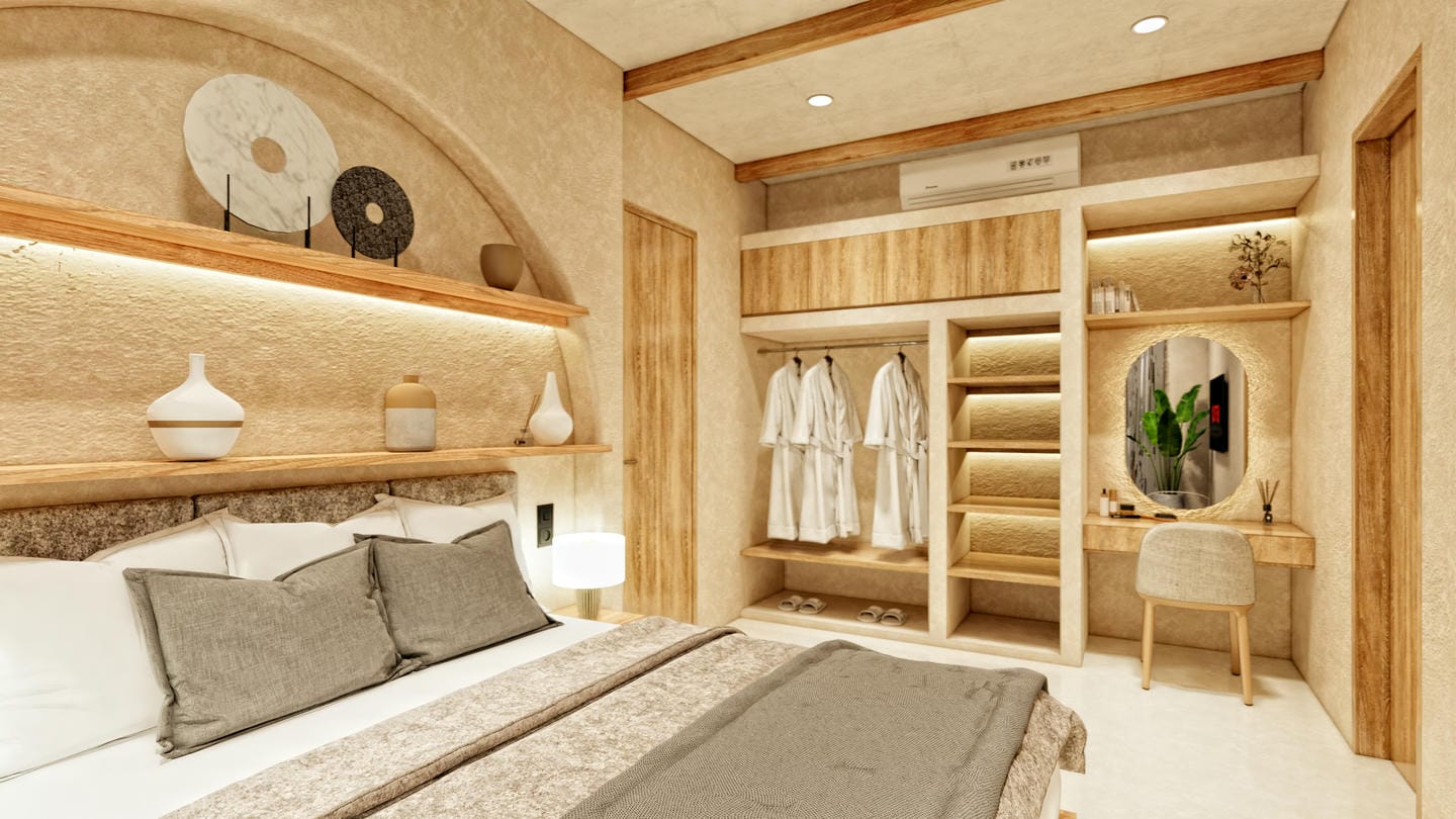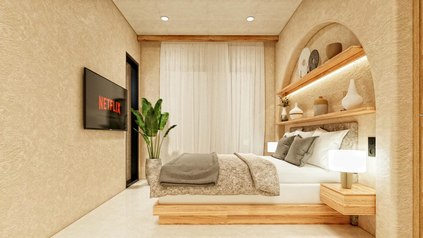 As you enter the villa, you’re welcomed into a bright and airy living space, featuring high ceilings and large windows that flood the interior with natural light. The open-plan kitchen and living area are thoughtfully designed to create a warm, social atmosphere, with natural tones and wood accents that add a refined tropical touch. A central island in the kitchen provides the perfect space for cooking while enjoying time with friends or family. Spread across two floors, the villa includes two spacious bedrooms, each with its own ensuite bathroom complete with both a bathtub and a shower. The ground-floor bedroom opens onto a peaceful inner garden, while the upstairs bedroom connects to a private balcony.