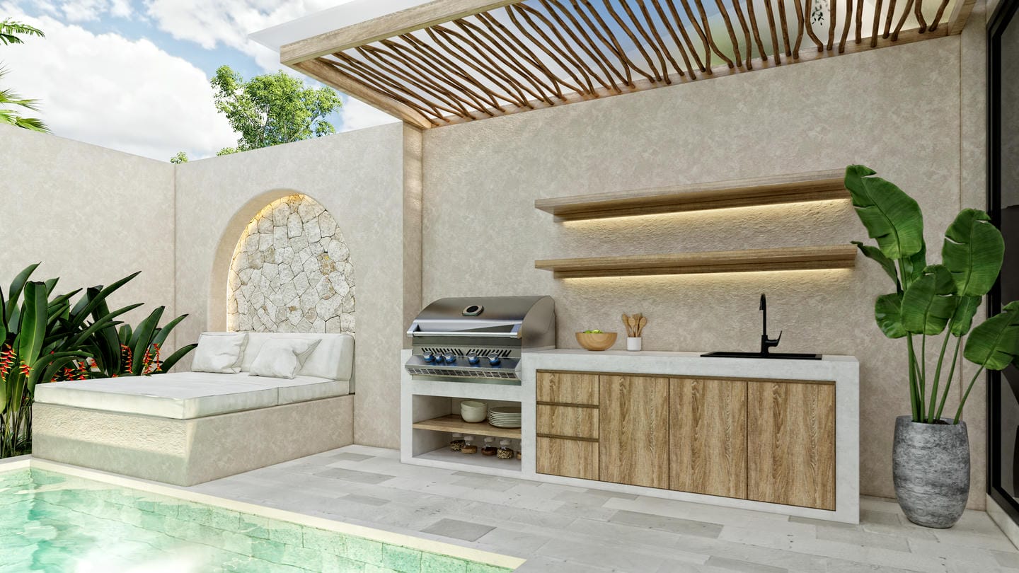 Step outside to a beautiful outdoor area featuring a private swimming pool and comfortable sunbeds, perfect for relaxing under the sun. The space is completed with an outdoor kitchen and a BBQ set, providing the ideal setting for entertaining and gathering with family and friends.