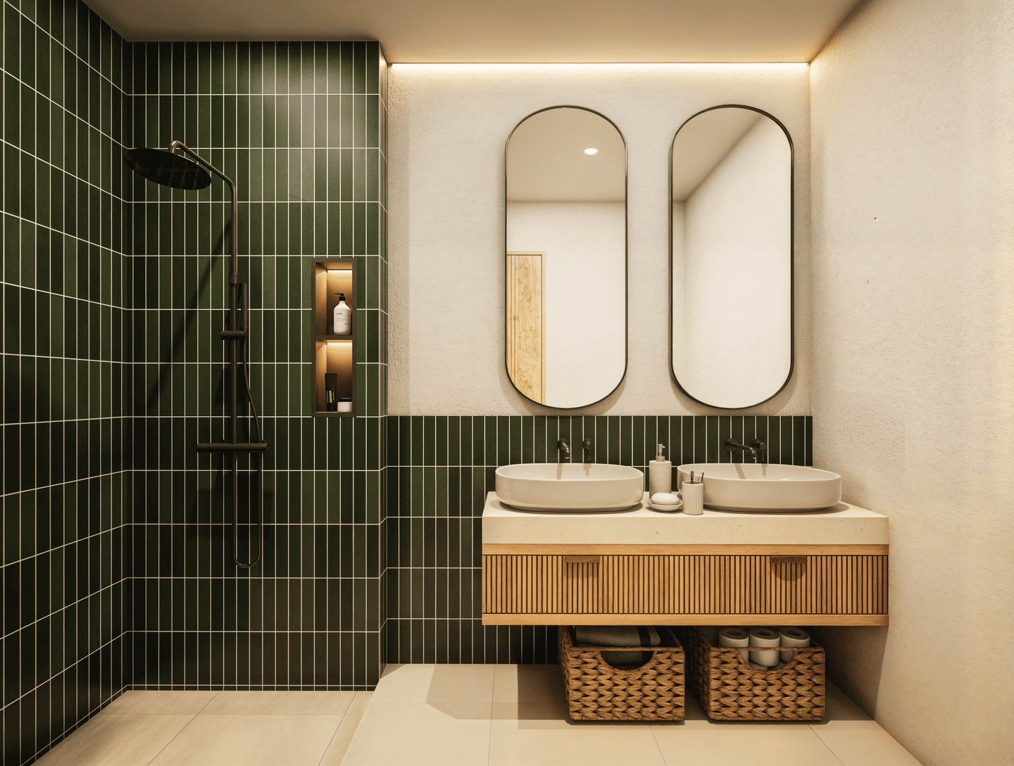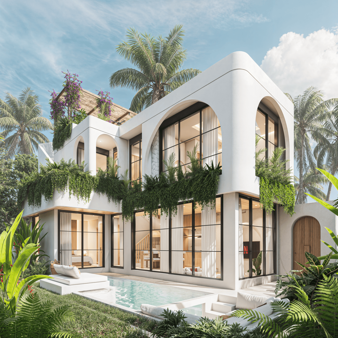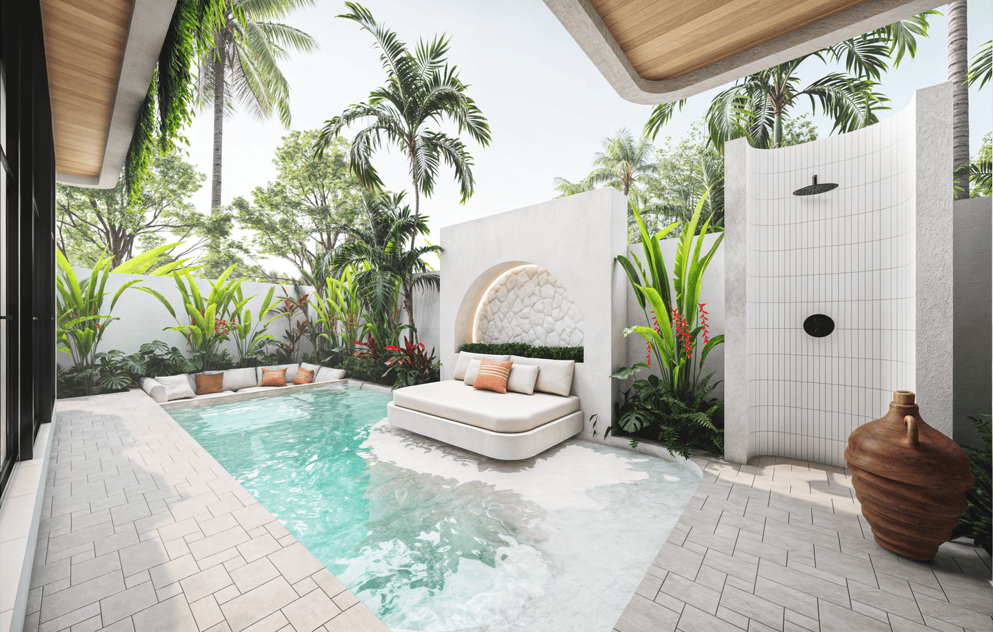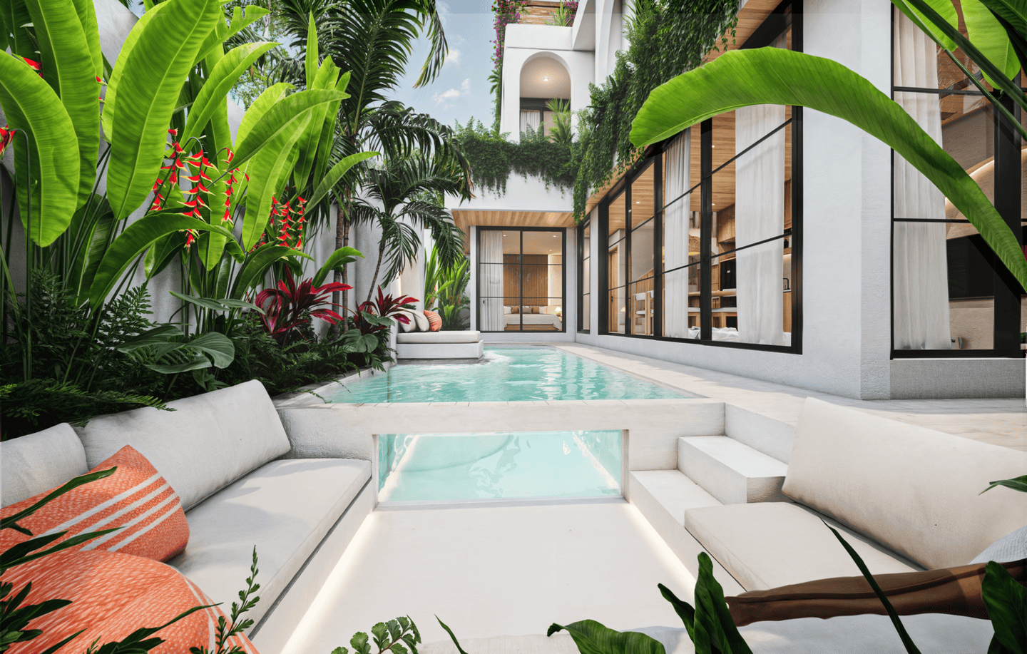 Set across three thoughtfully designed floors, the villa is crafted to maximize flow, privacy, and everyday living. The ground floor opens onto a private garden and swimming pool, establishing a natural indoor–outdoor rhythm that defines tropical living. From the pool, the space flows into a bright open-plan living and kitchen area, perfect for entertaining, relaxing, or daily life. A guest bedroom with its own en-suite bathroom completes this level, making it equally suited for hosting or rental use.