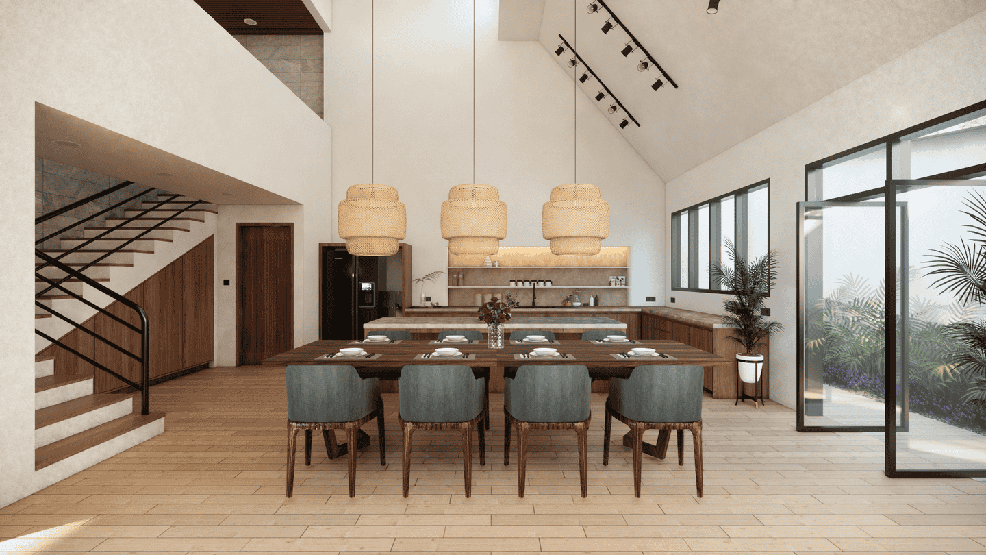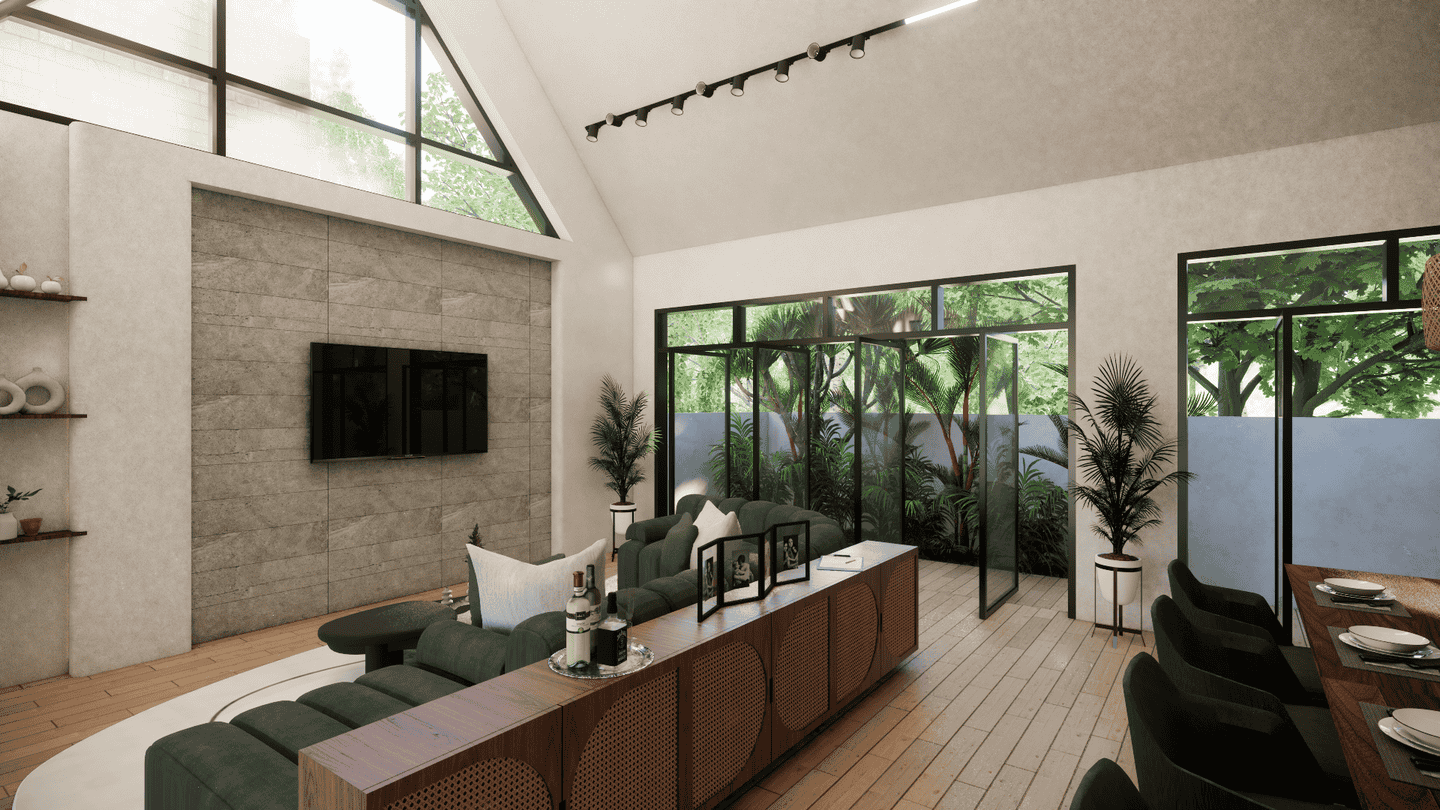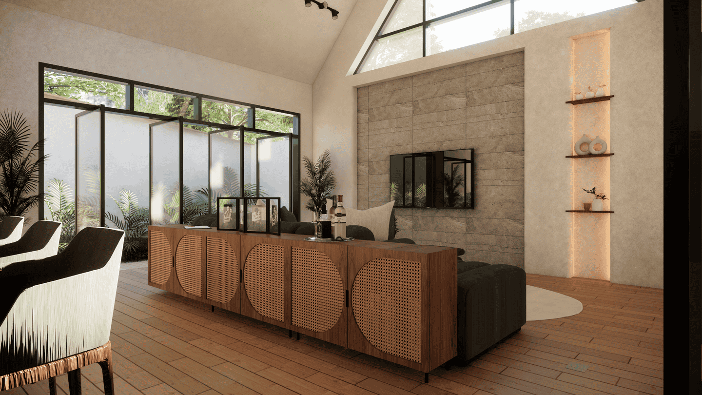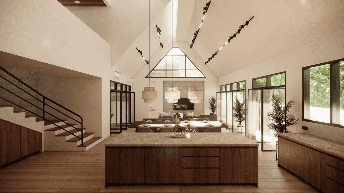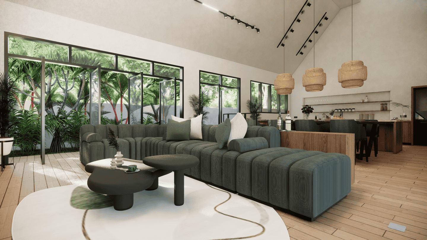 The interior features a modern tropical design with high ceilings, large glass openings, and plenty of natural light. Clean lines, warm wood accents, and neutral tones create a calm, elegant atmosphere that feels both contemporary and comfortable.