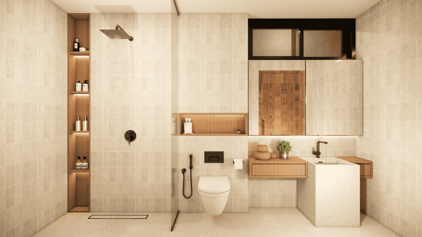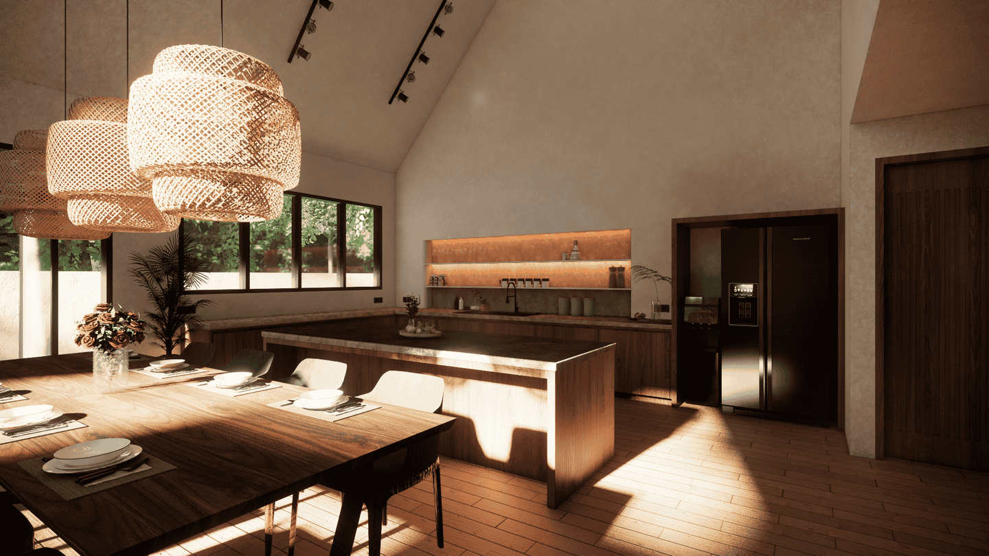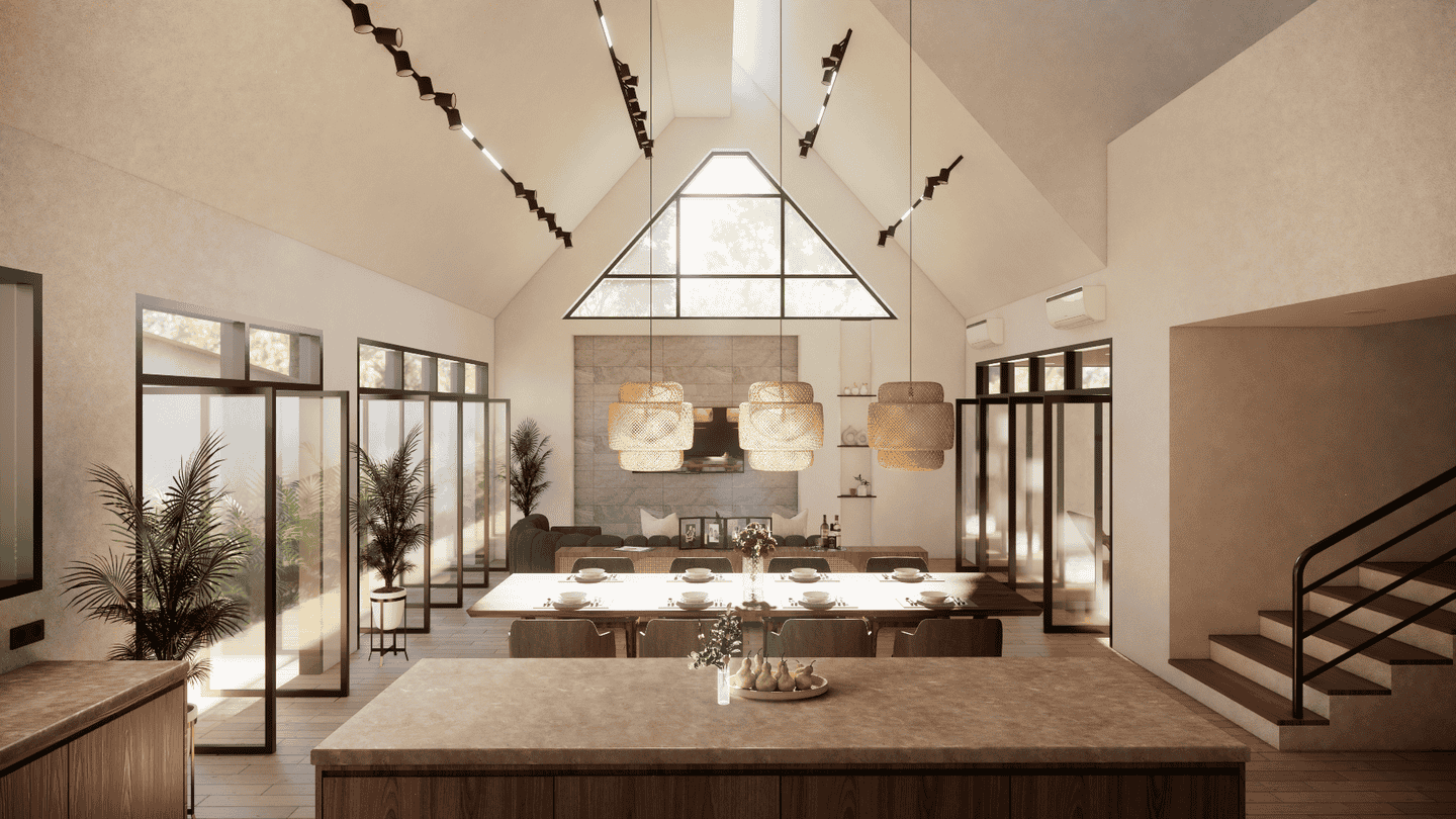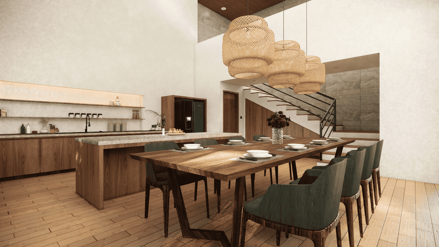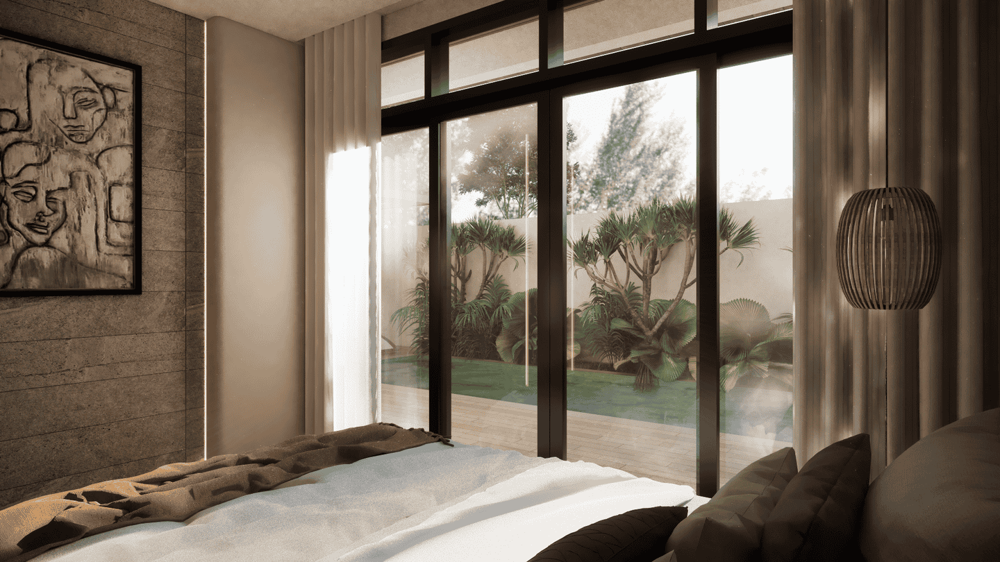The interior features a modern tropical design with high ceilings, large glass openings, and plenty of natural light. Clean lines, warm wood accents, and neutral tones create a calm, elegant atmosphere that feels both contemporary and comfortable.
