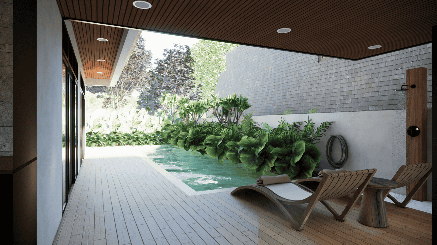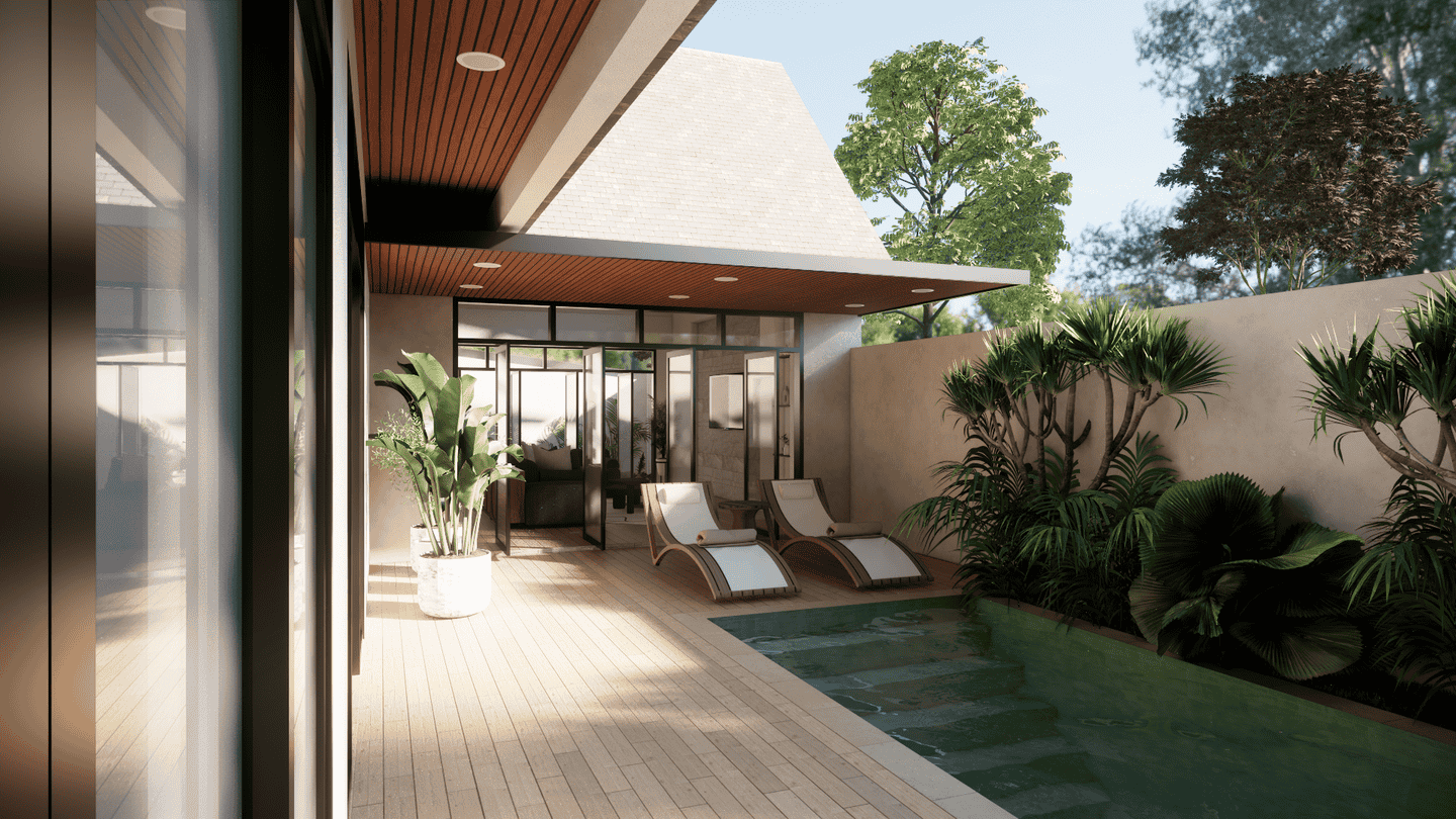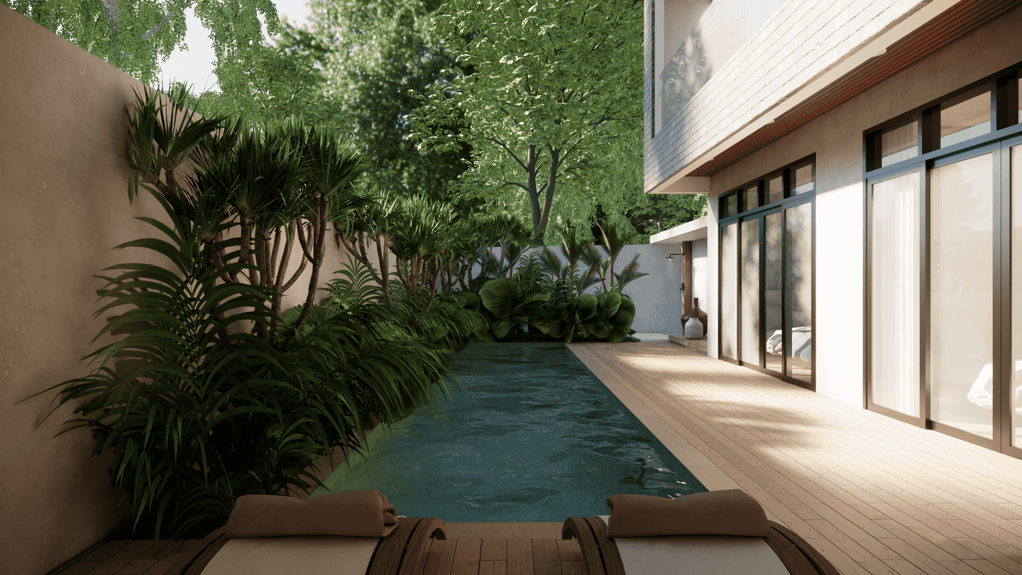The outdoor area offers a private swimming pool, wooden deck, and lush greenery surrounding the villa. Views open up to tropical plants and trees, giving a fresh, resort-like feel ideal for relaxing or entertaining.