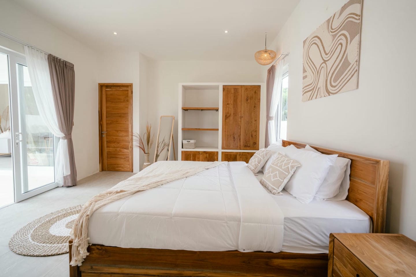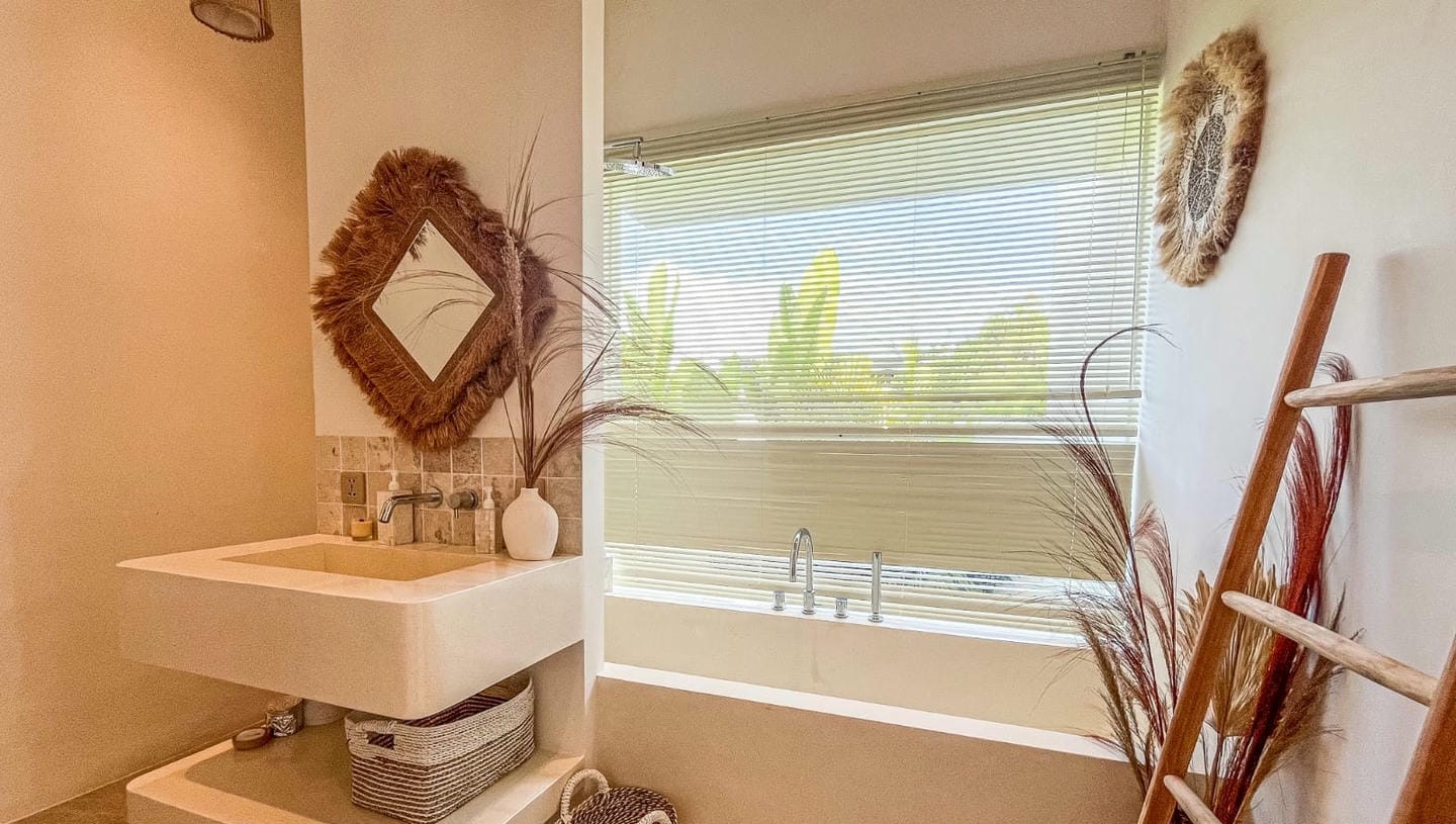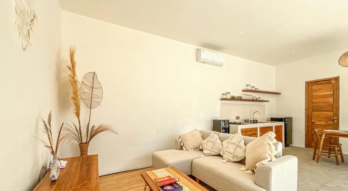 The villa features two well-appointed bedrooms, each with its own ensuite bathroom, designed to provide comfort and privacy. Fully furnished and thoughtfully styled, the interior combines clean lines, natural materials, and functional living spaces, creating a warm and inviting atmosphere.