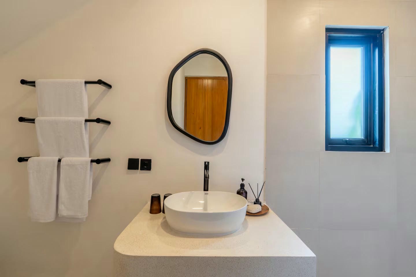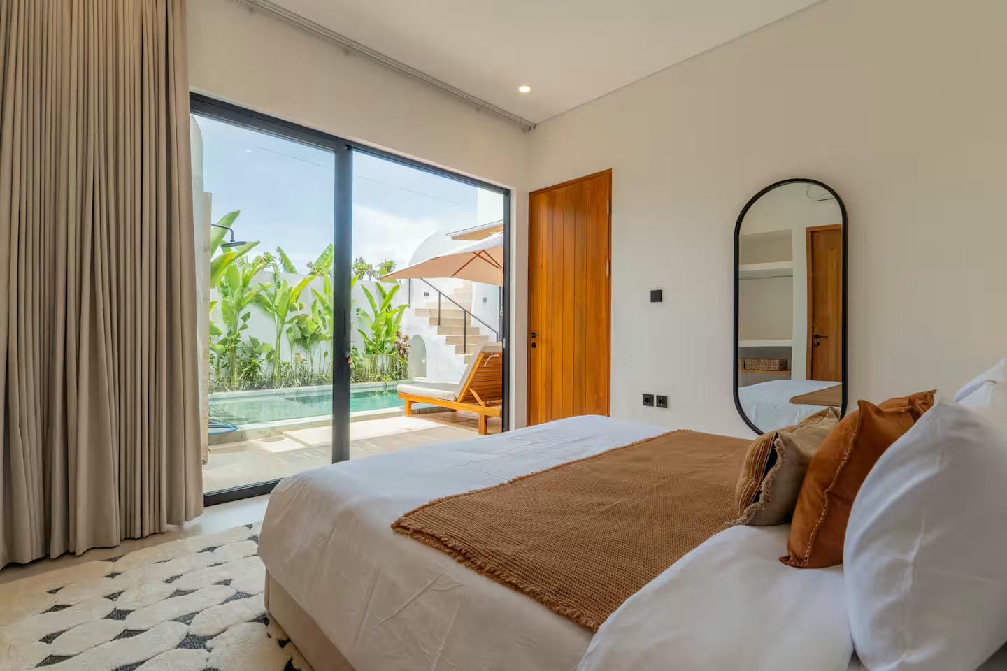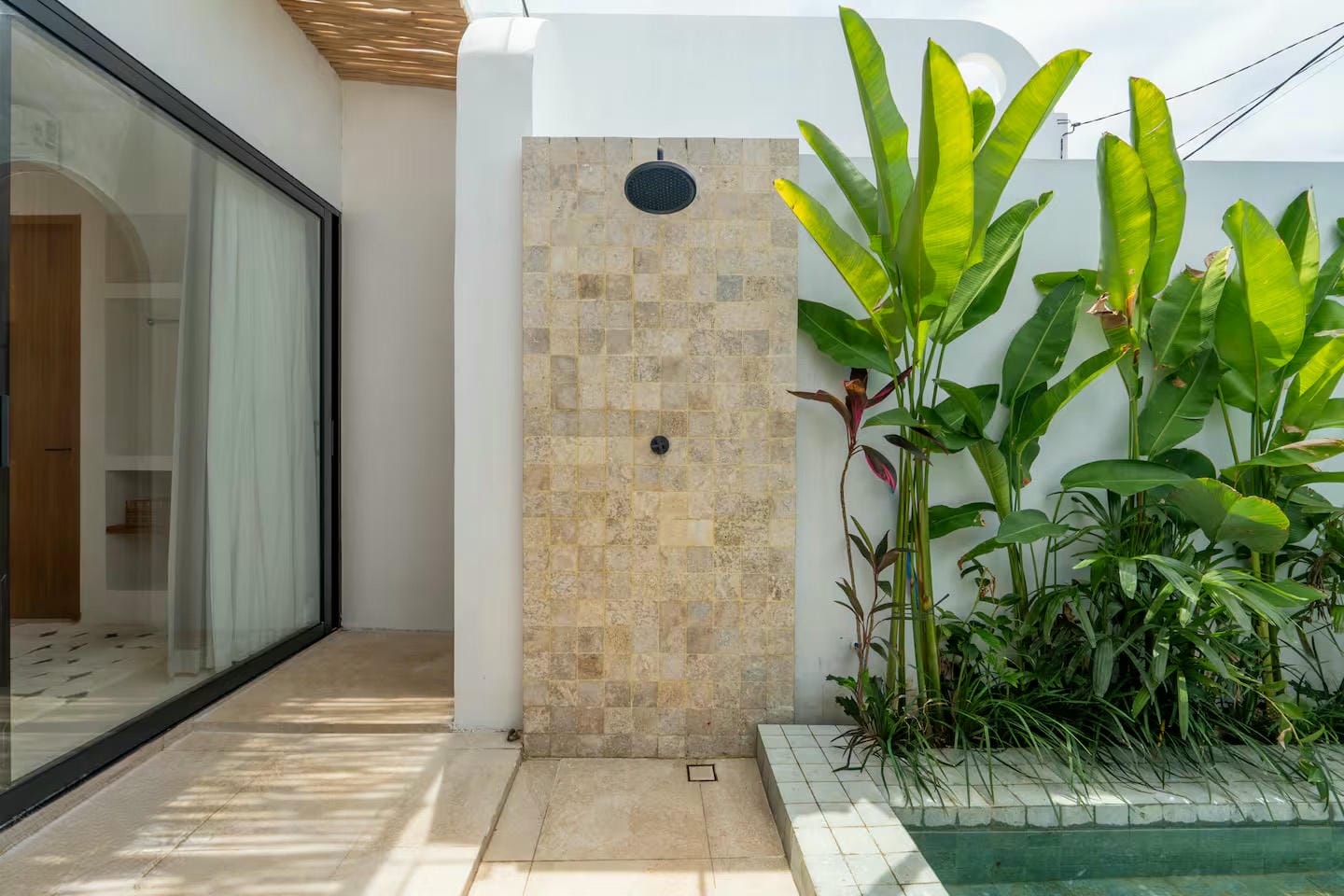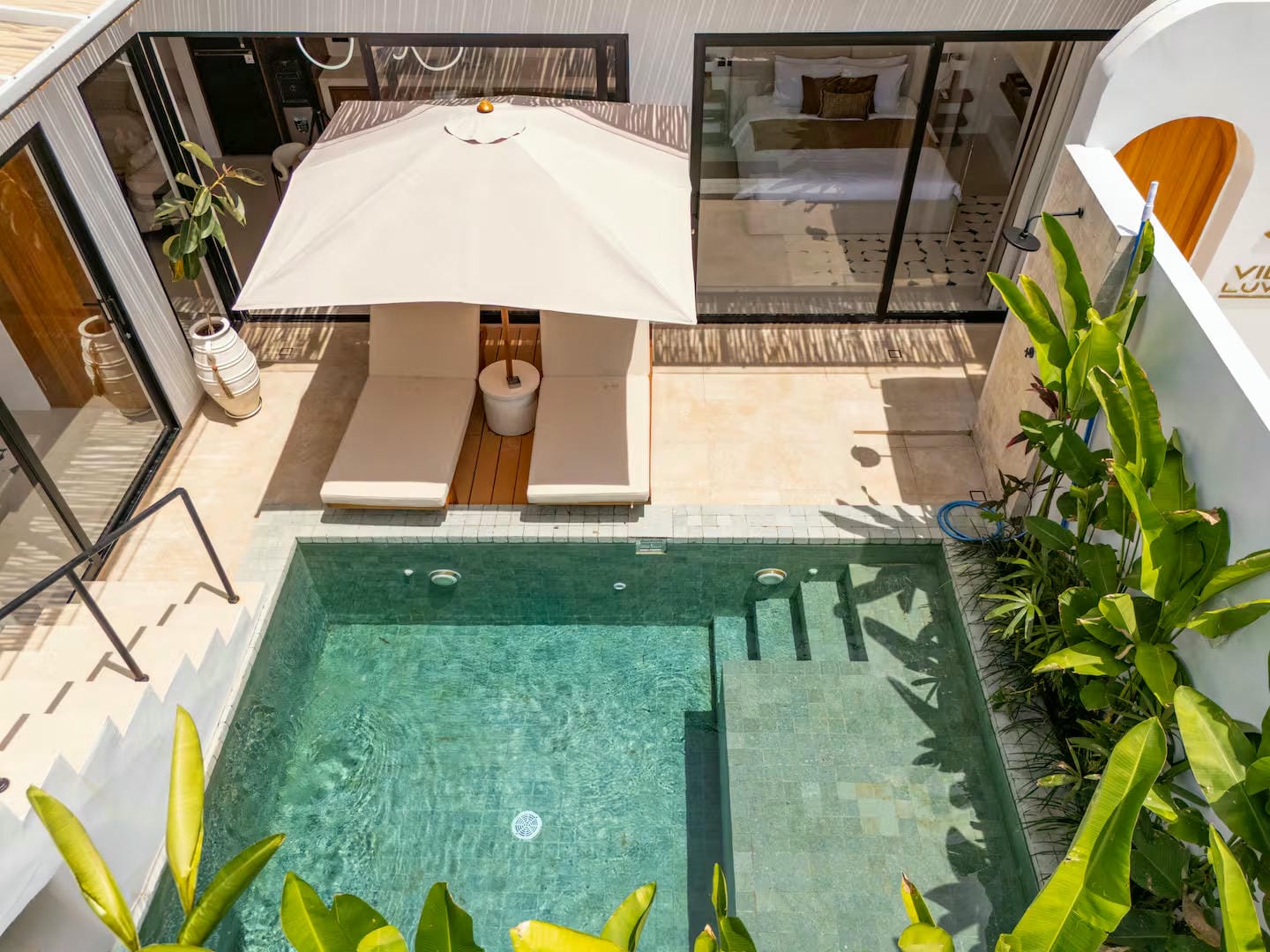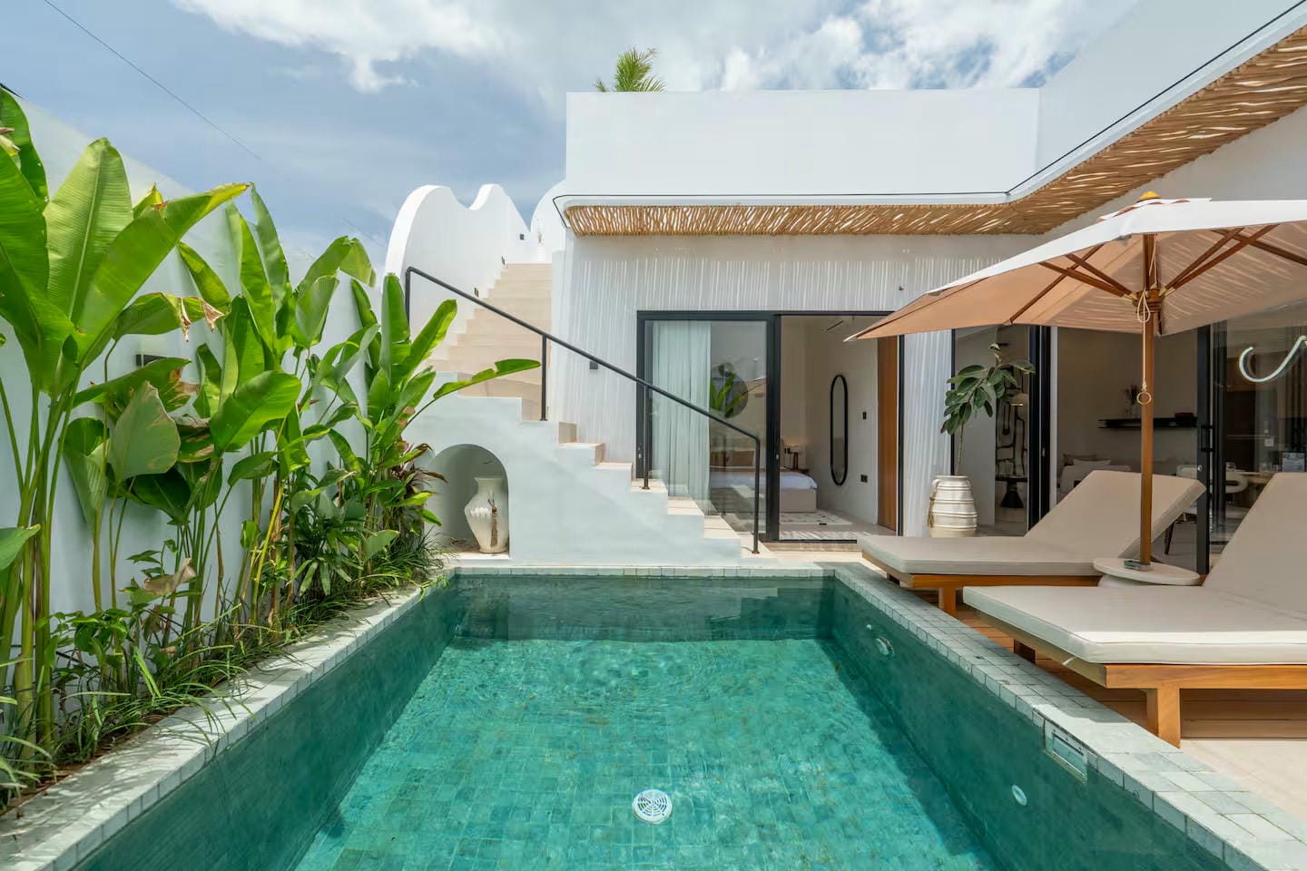 From the main entrance, you step into a private outdoor area featuring a swimming pool, sunbeds, outdoor shower, and tropical garden, offering a welcoming and relaxing first impression. This space provides direct access to the villa and creates a natural flow between outdoor leisure and indoor comfort. From here, a staircase leads to the rooftop, where a jacuzzi and pergola offer an inviting setting to unwind and enjoy sunset moments.