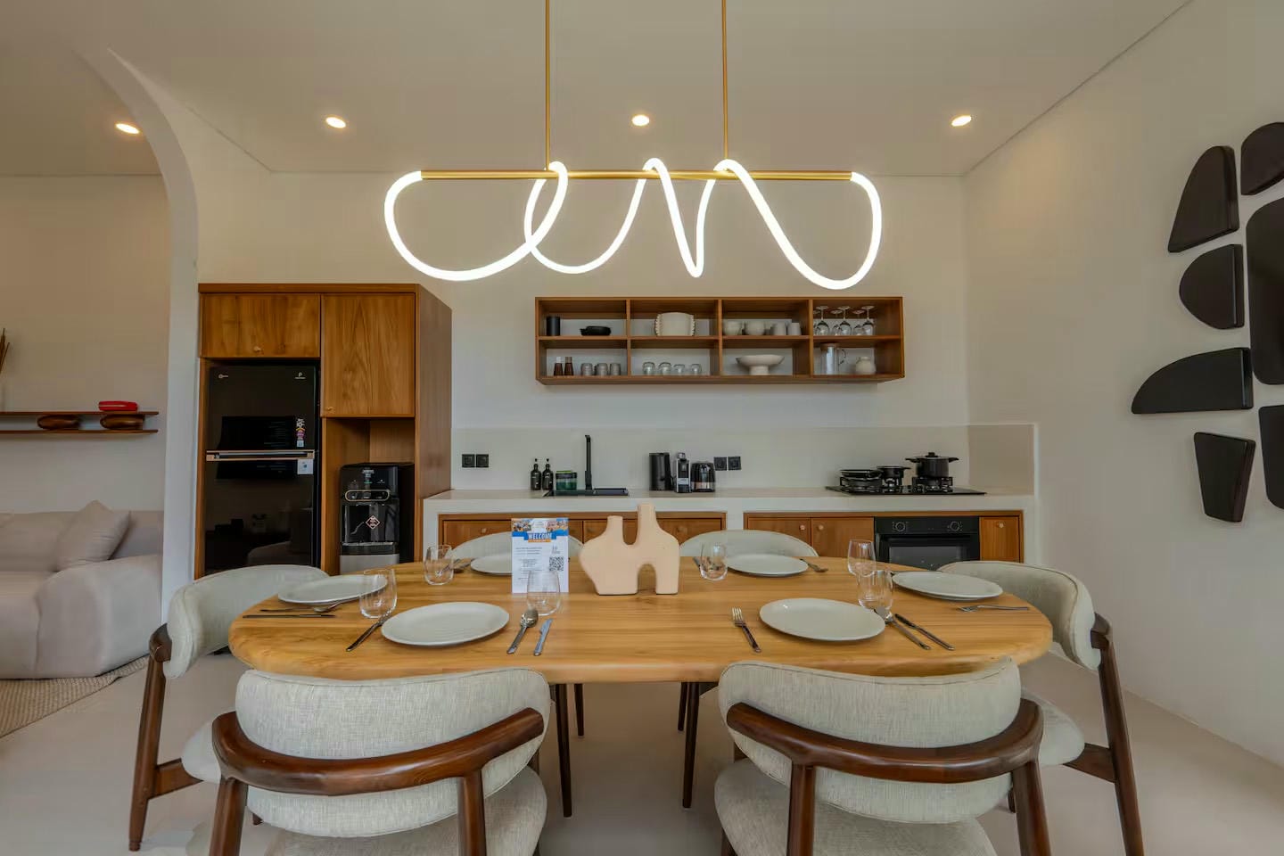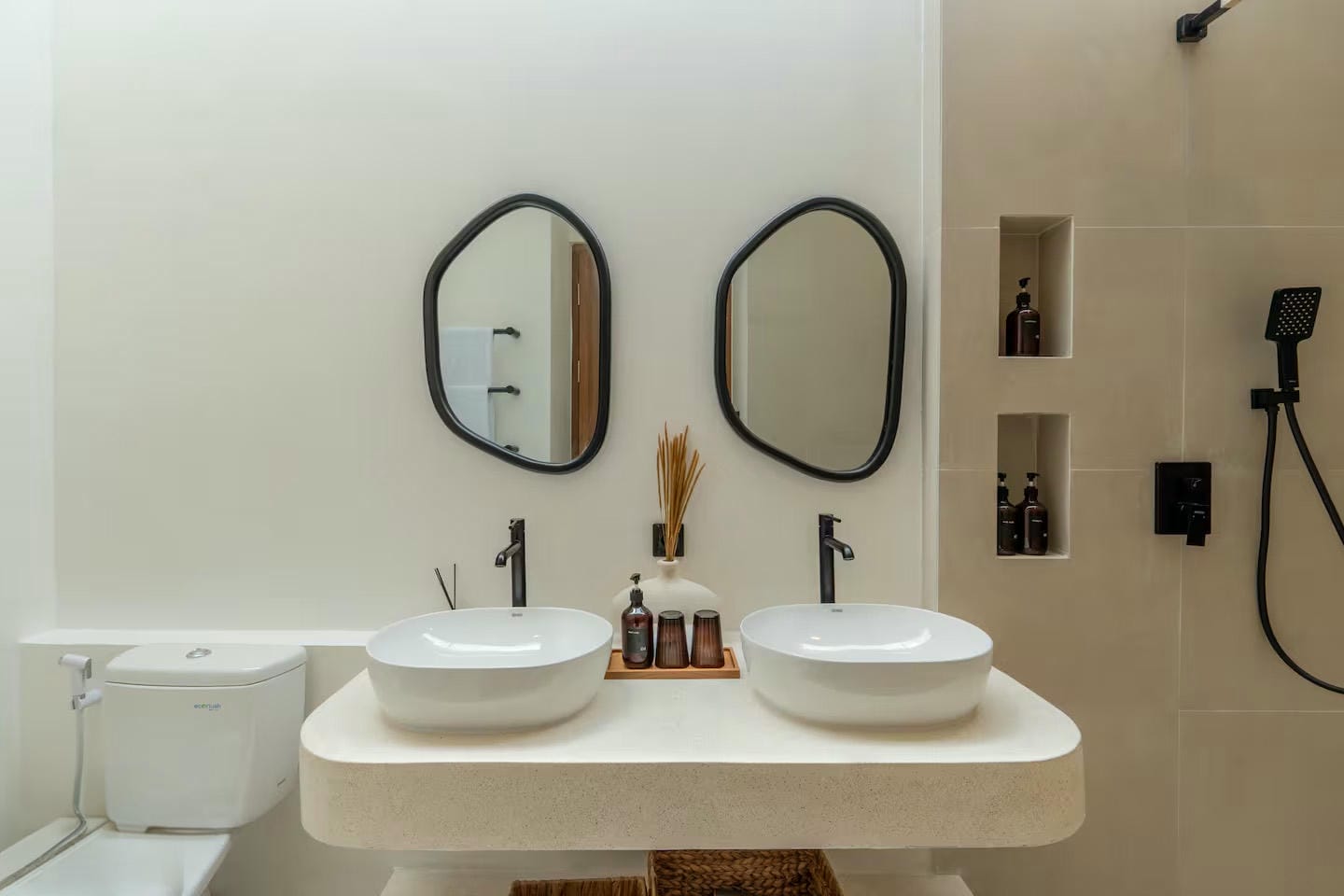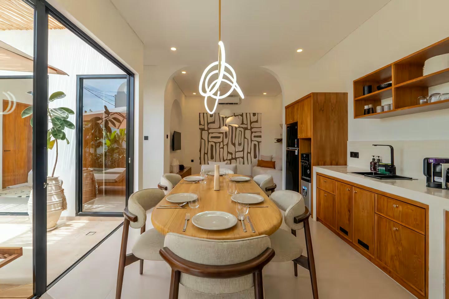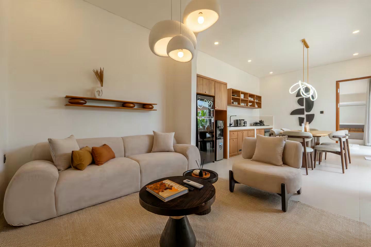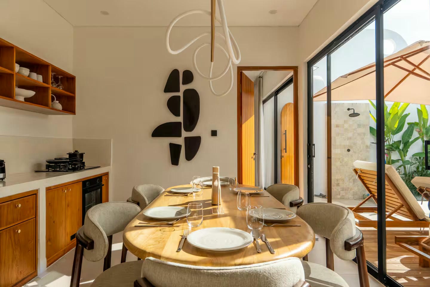 Inside, the villa features an open-plan living area comprising a comfortable lounge, a fully equipped kitchen, and a dining space suited for both daily living and entertaining. This central area connects seamlessly to the outdoor space and to two bedrooms, each with its own ensuite bathroom, including a bathtub in the master bedroom.