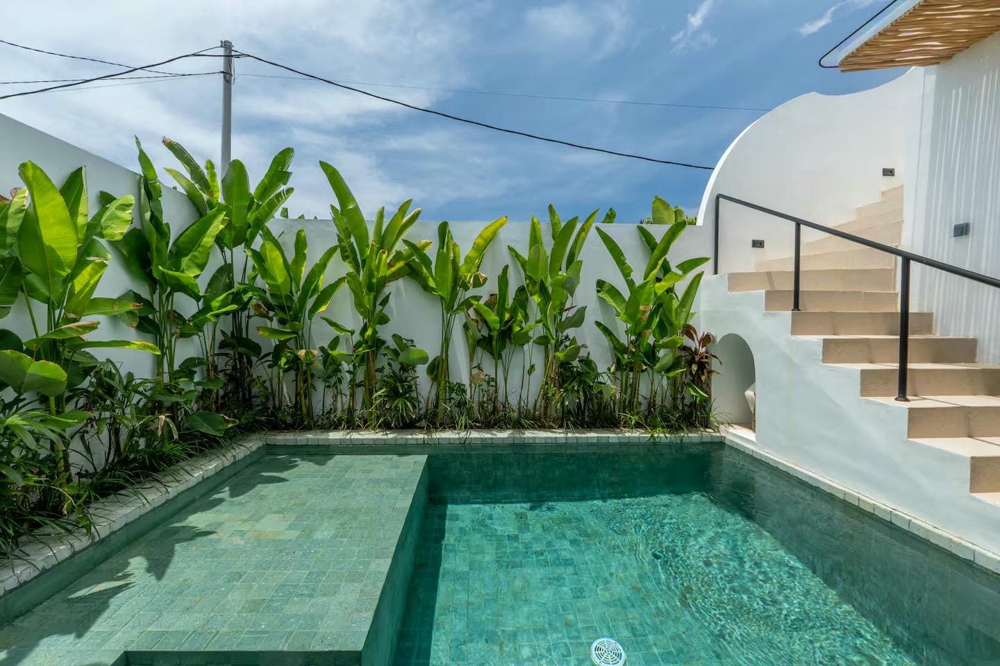 Modern villa with pool and lush greenery view