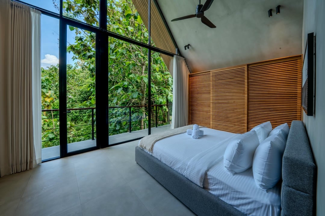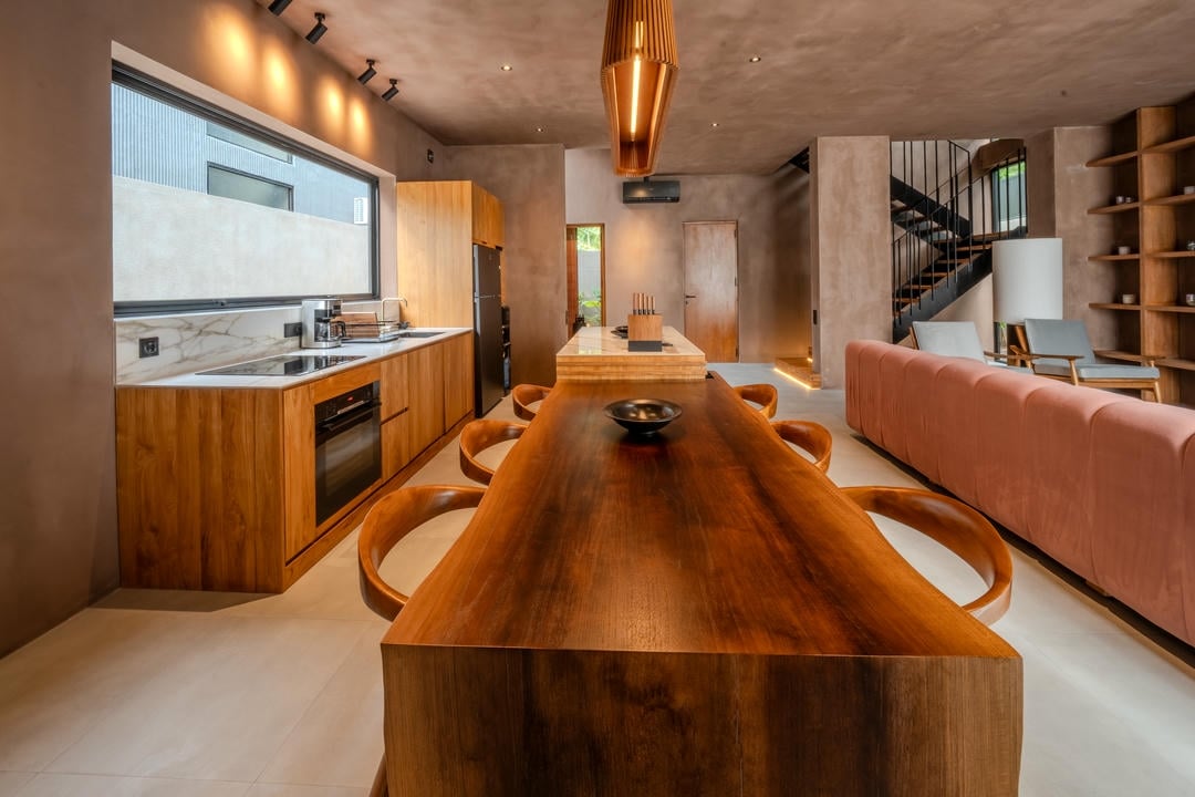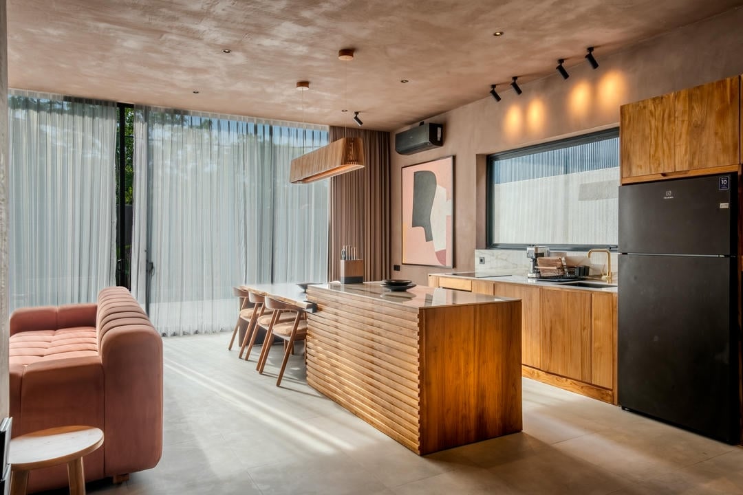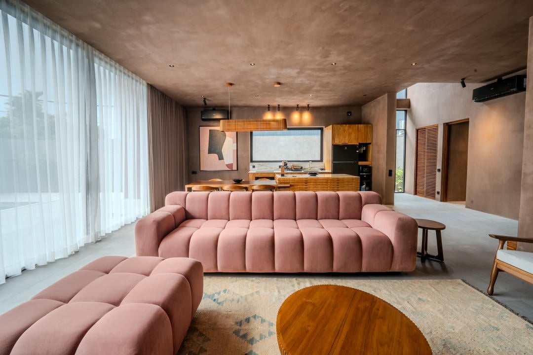 This two-level villa features 3 bedrooms, each with an ensuite bathroom, including a bathtub in the master bedroom. The enclosed living room with high ceiling windows creates a bright and airy atmosphere, complemented by a fully furnished interior and a modern, fully equipped kitchen.