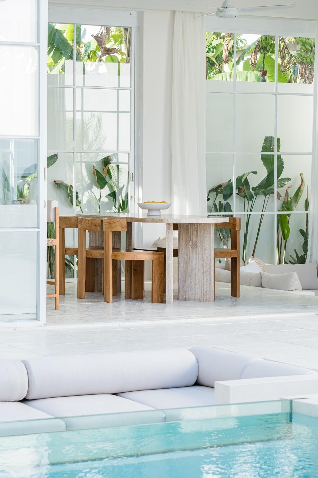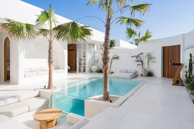 This villa features a modern tropical design that seamlessly blends indoor and outdoor living. Large sliding glass doors open directly to the pool area, allowing abundant natural light and fresh air to fill the space. The open-plan layout connects the living area effortlessly with the dining area and kitchen. The villa offers three bedrooms with spacious windows, each completed with an en-suite bathroom and an open-concept ceiling that enhances the sense of space and comfort.
