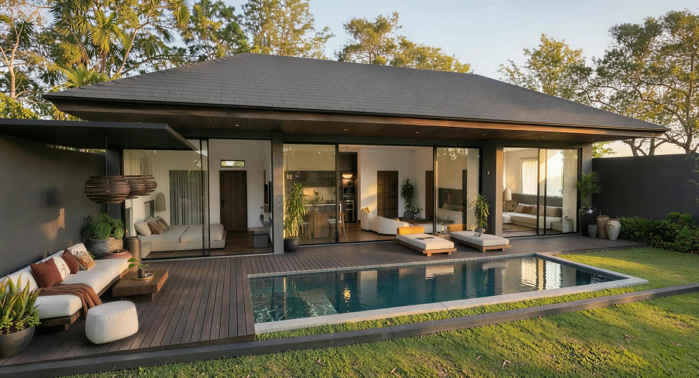 This contemporary designed villa with white accents features three spacious bedrooms, each with an ensuite bathroom and elegant walk-in wardrobe for ultimate comfort and privacy. The expansive living area seamlessly integrates with a fully equipped kitchen, offering views of a lush tropical garden creating an ideal setting for relaxation and entertainment.