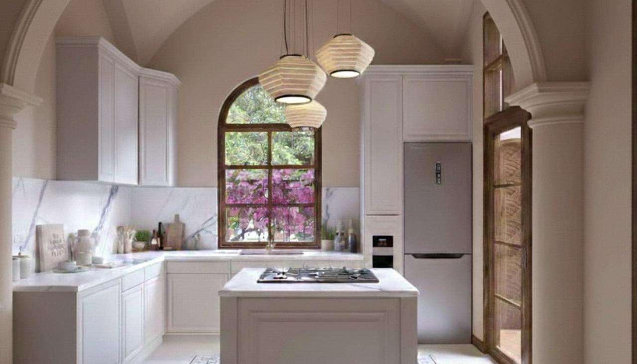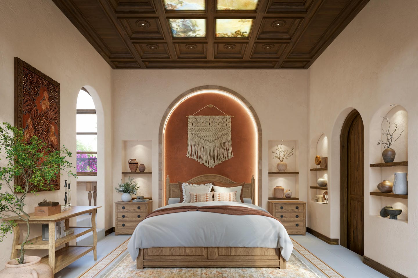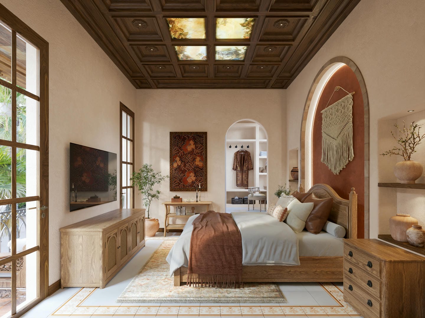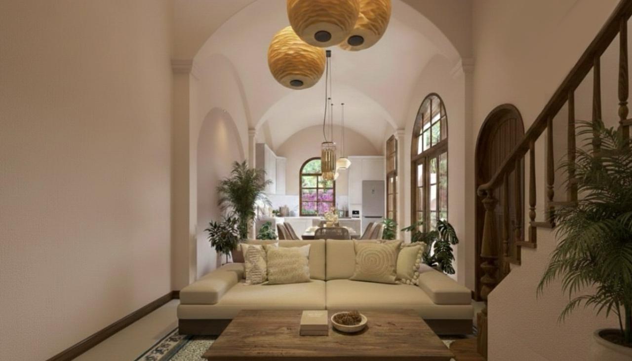 Inside, the villa showcases warm wooden textures, handcrafted décor, and soft earthy tones. It features two bedrooms with ensuite bathrooms, complemented by an additional guest bathroom for added convenience. Fully furnished, the open-plan layout seamlessly connects the living area with a stylish dining corner and a well-appointed kitchen, all enhanced by stunning arched windows and refined artisanal details.