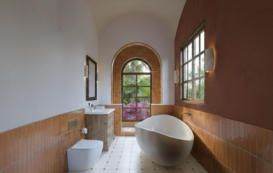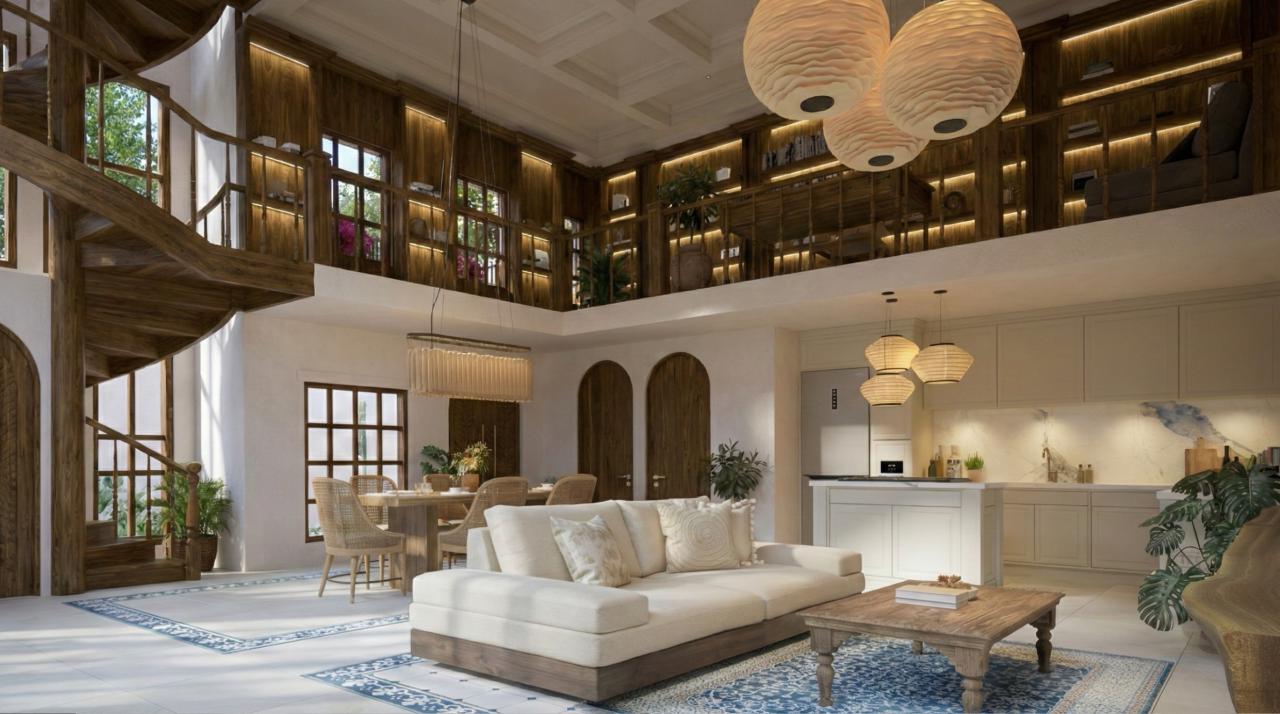 Inside, this studio villa showcases warm wooden textures, handcrafted décor, and soft earthy tones. The master bedroom offers a serene retreat, while the ensuite bathroom features a sculptural bathtub, complemented by an additional guest bathroom for convenience. Fully furnished, the open layout seamlessly connects the living area with a stylish dining corner and a well-appointed kitchen, all enhanced by stunning arched windows and artisanal details.