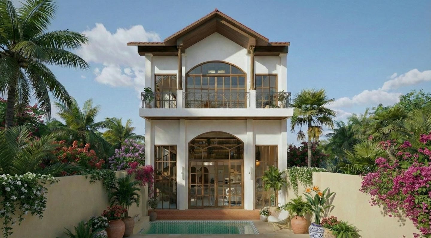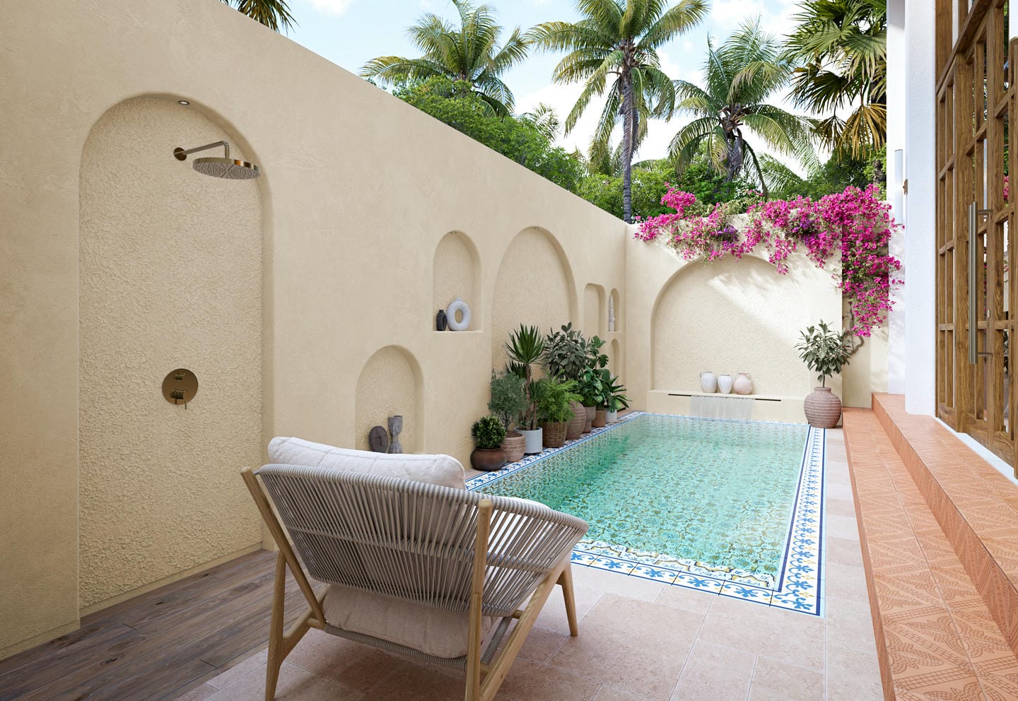 Outside, the villa features a charming private pool framed by Mediterranean tiles, lush greenery, and inviting lounge areas.