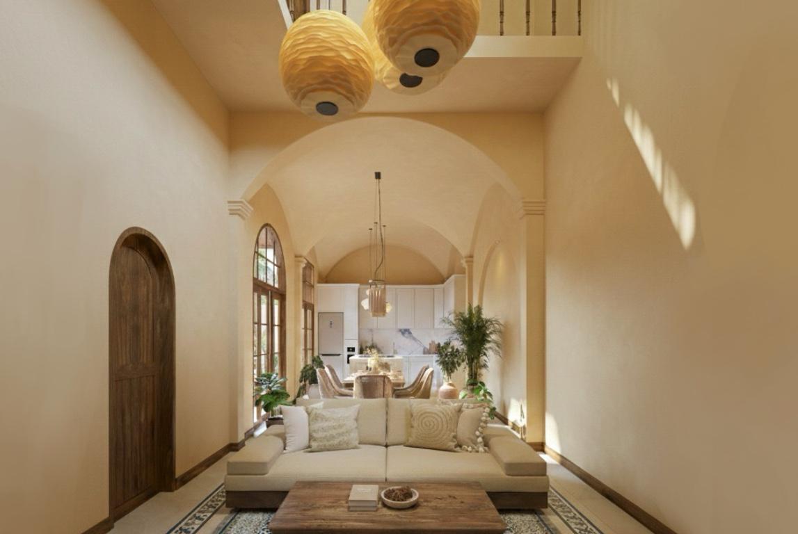 Inside, the villa showcases warm wooden textures, handcrafted décor, and soft earthy tones. The villa features three bedrooms, each with an ensuite bathroom, complemented by an additional guest bathroom for added convenience. Fully furnished, the open layout seamlessly connects the living area with a stylish dining corner and a well-appointed kitchen, all enhanced by stunning arched windows and artisanal details.