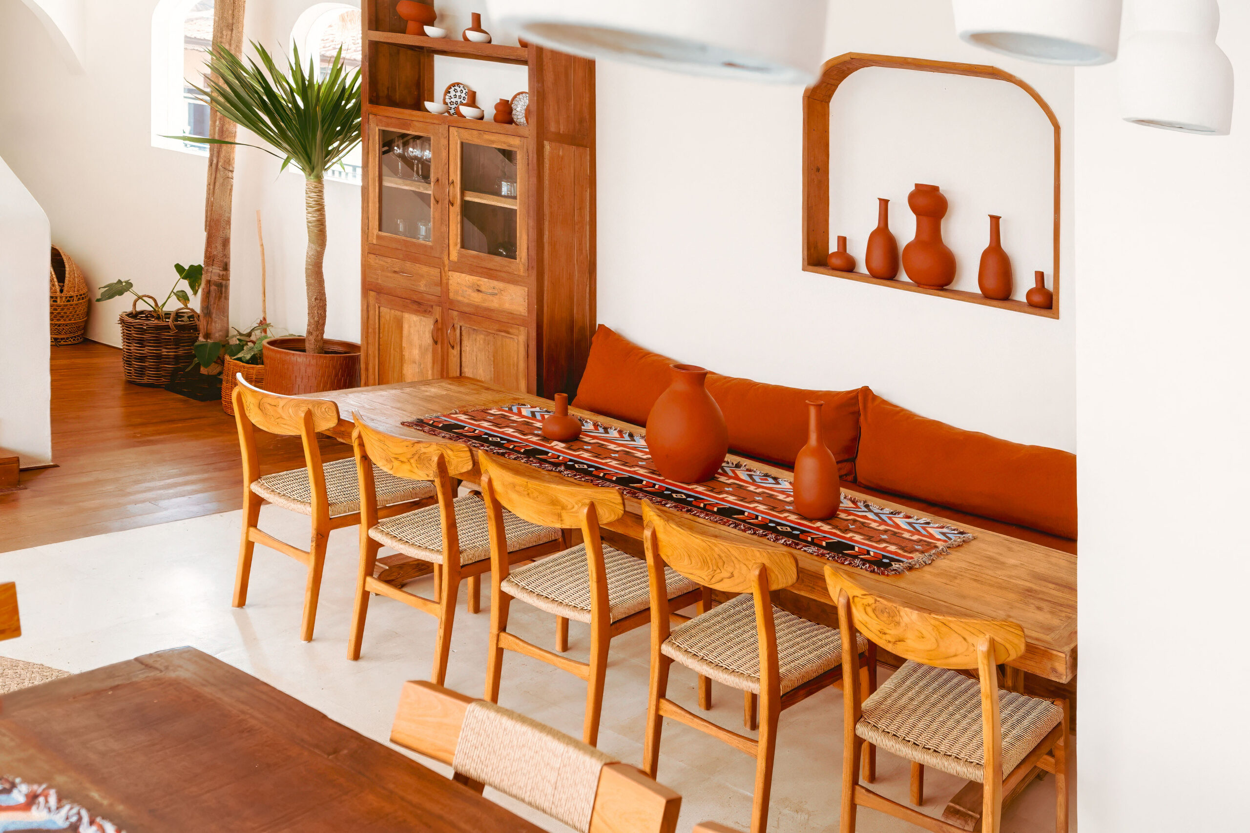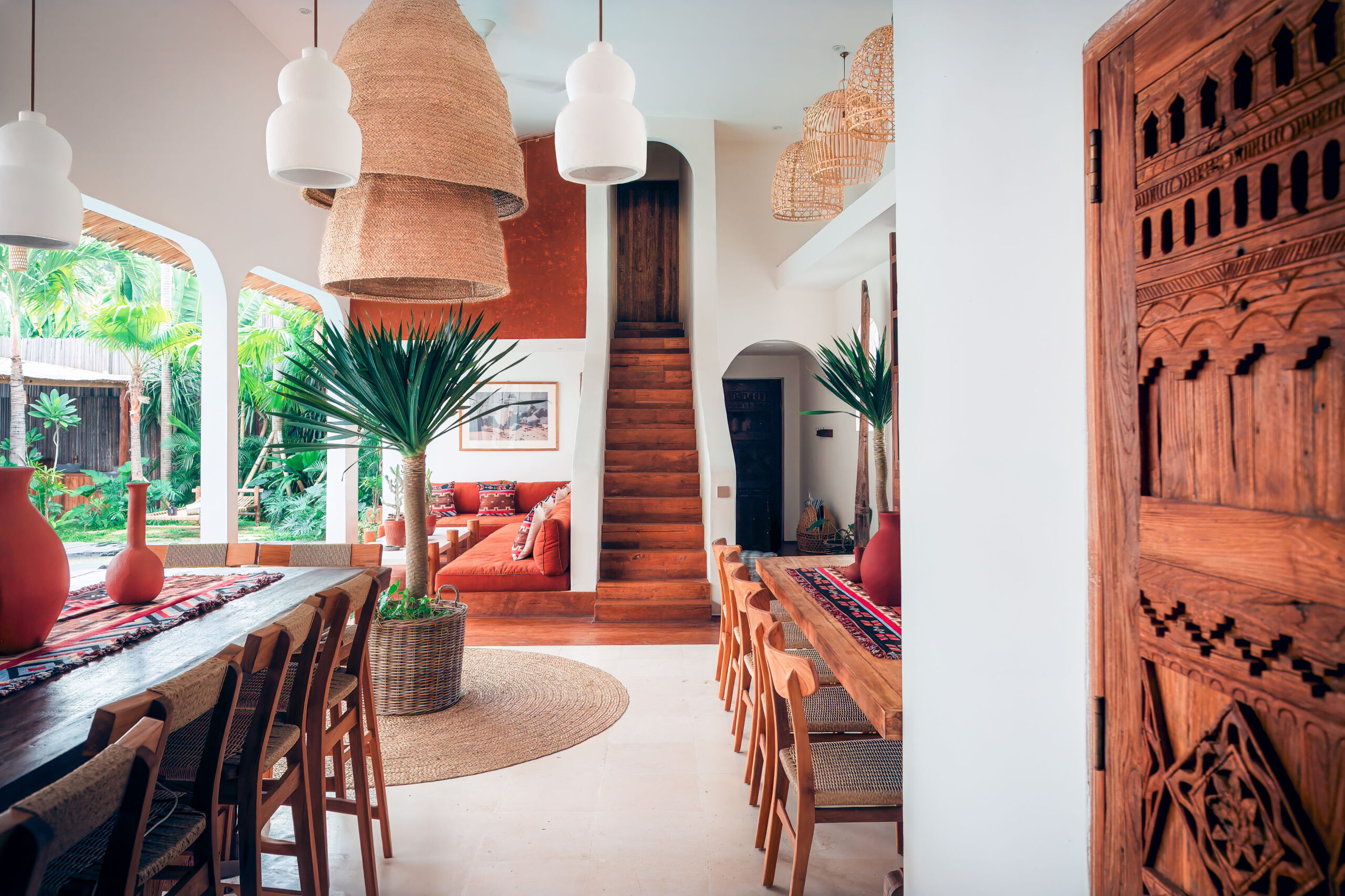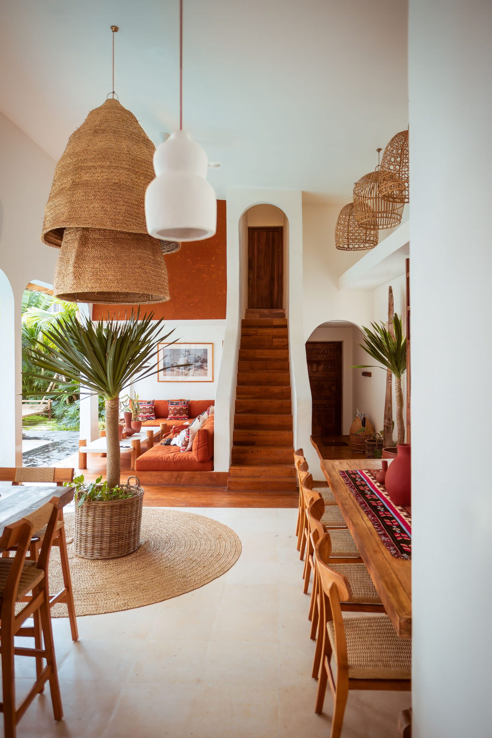 Elegant Living Space: This fully furnished villa features 4 bedrooms and 4 bathrooms. The open-plan living area flows seamlessly into the dining space and a fully equipped kitchen. Modern design elements include a bright white interior enhanced by natural wooden accents, creating an atmosphere of refined elegance. Floor-to-ceiling windows flood the space with natural light, amplifying the sense of openness and harmony with the lush surroundings.