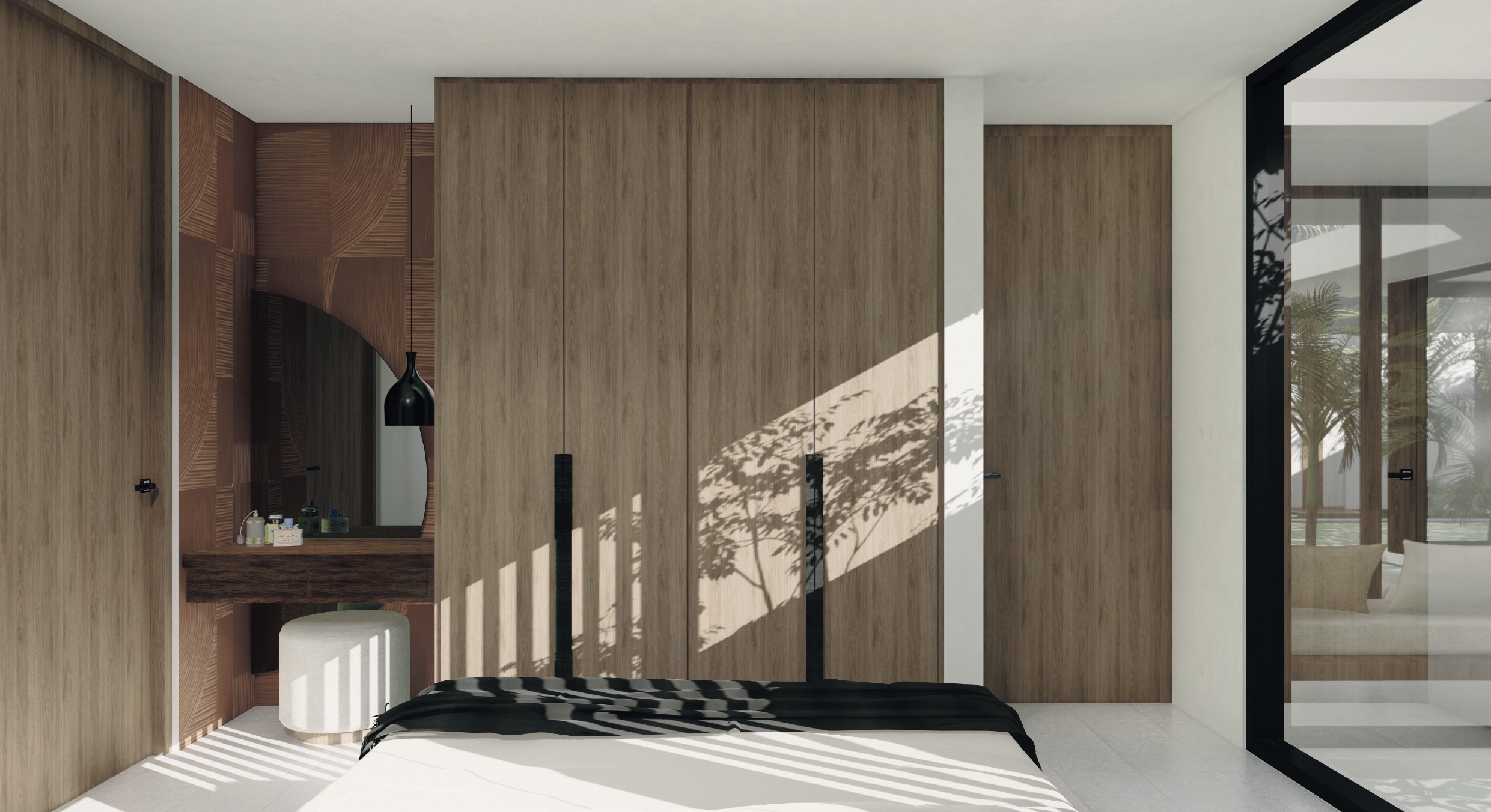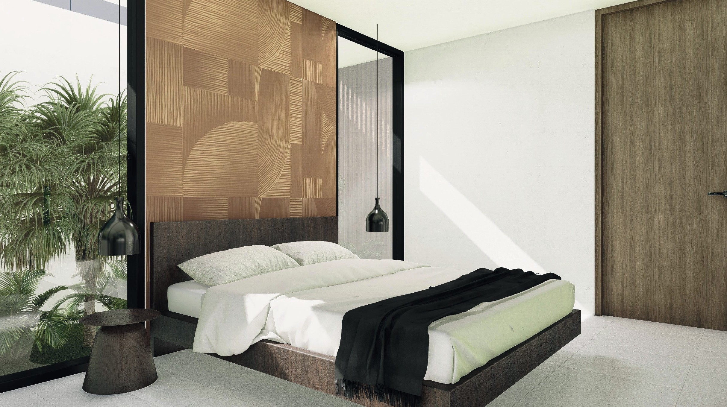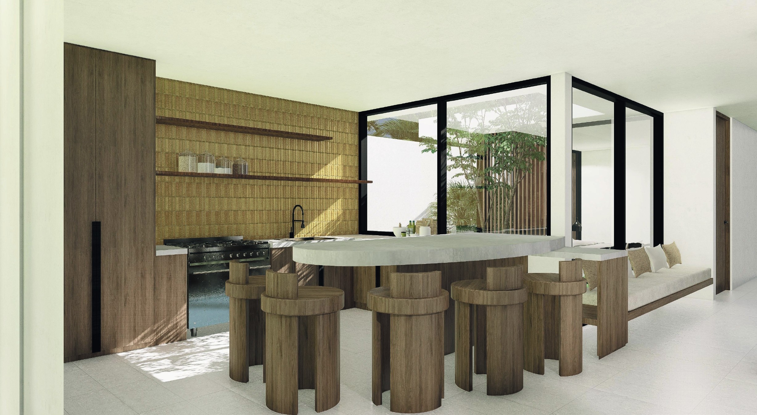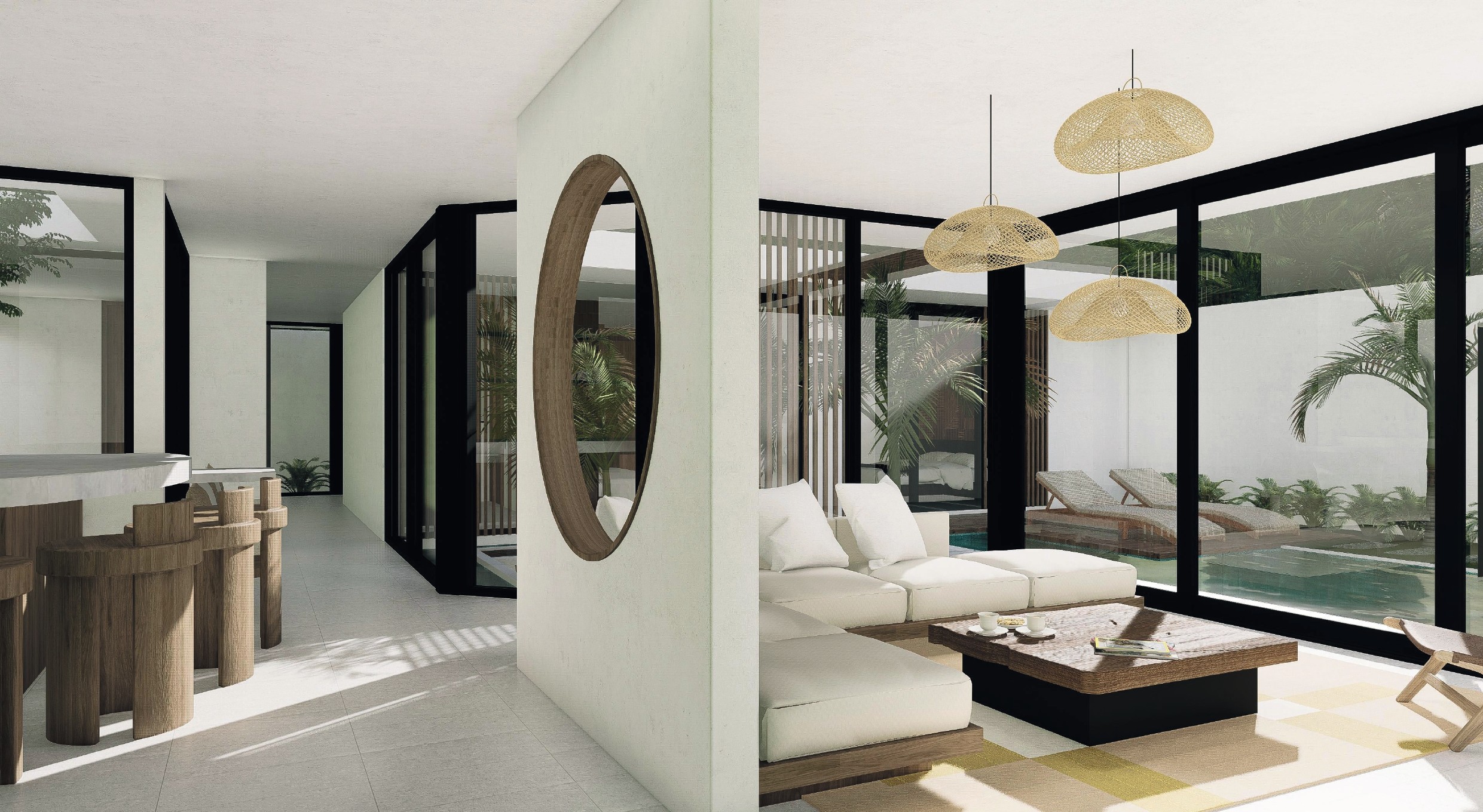 The interior design showcases a refined tropical contemporary style, combining natural textures, warm wooden accents, and minimalist lines. Each room is filled with natural light through floor-to-ceiling glass panels, creating a seamless connection between indoor comfort and outdoor serenity.