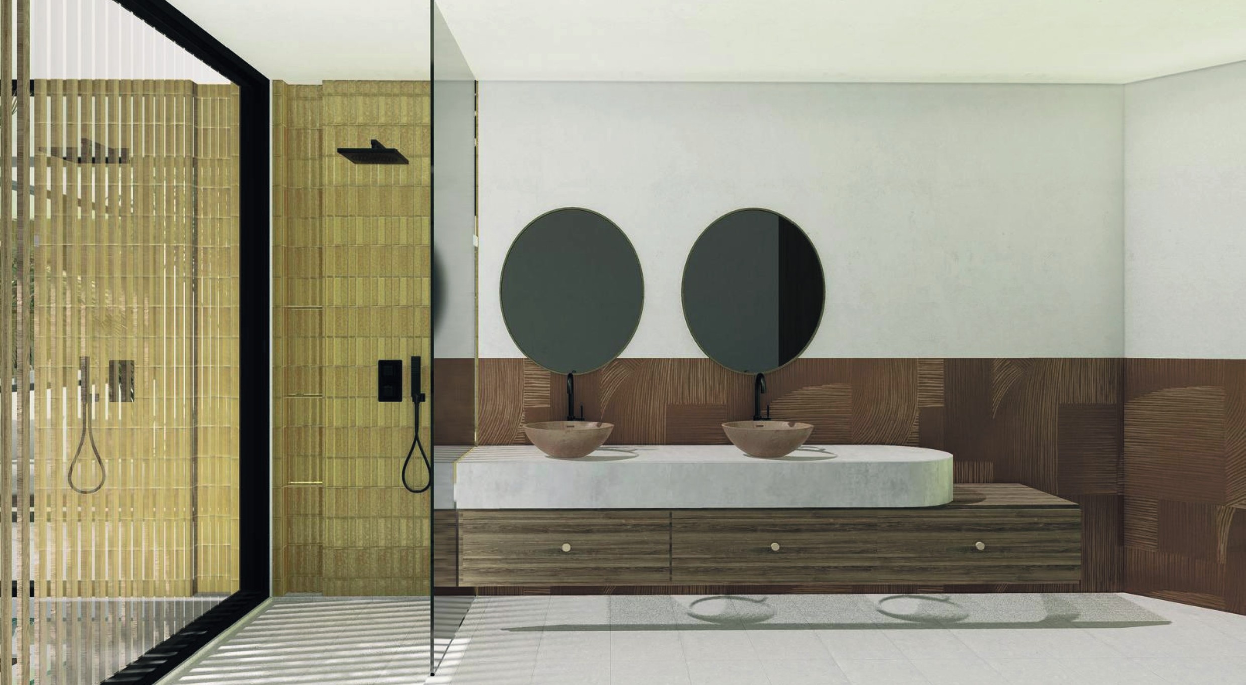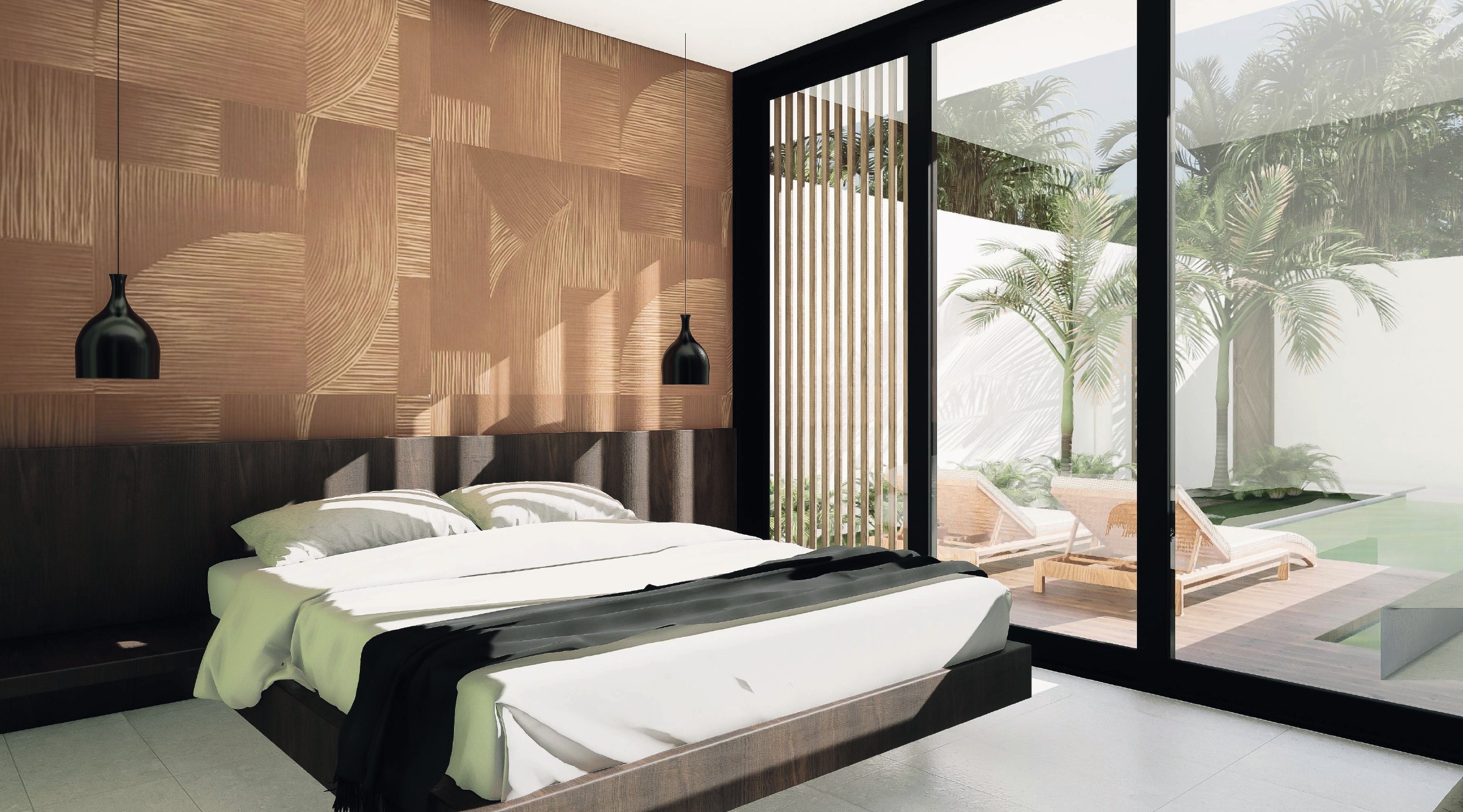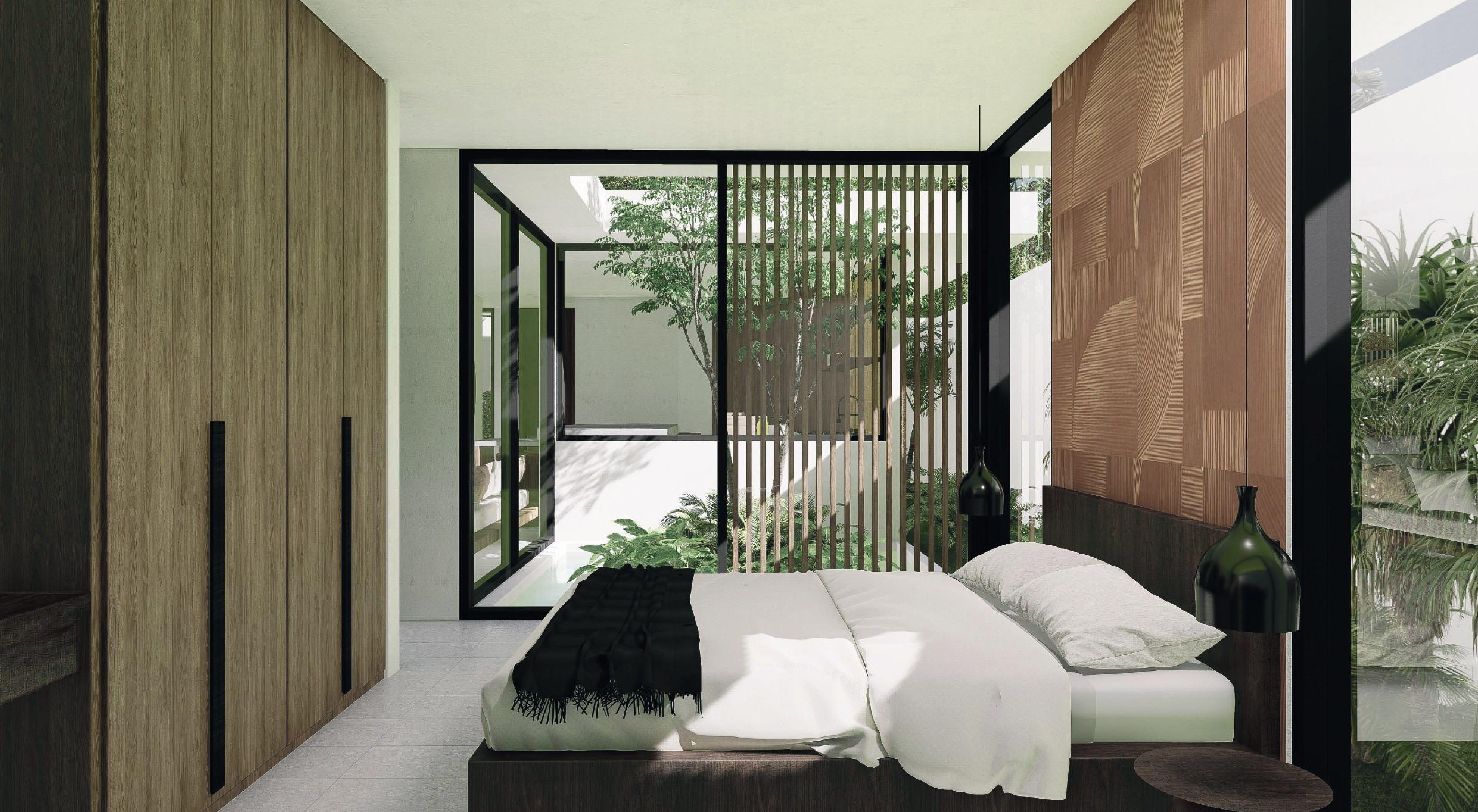 The interior design showcases a refined tropical contemporary style, combining natural textures, warm wooden accents, and minimalist lines. Each room is filled with natural light through floor-to-ceiling glass panels, creating a seamless connection between indoor comfort and outdoor serenity.