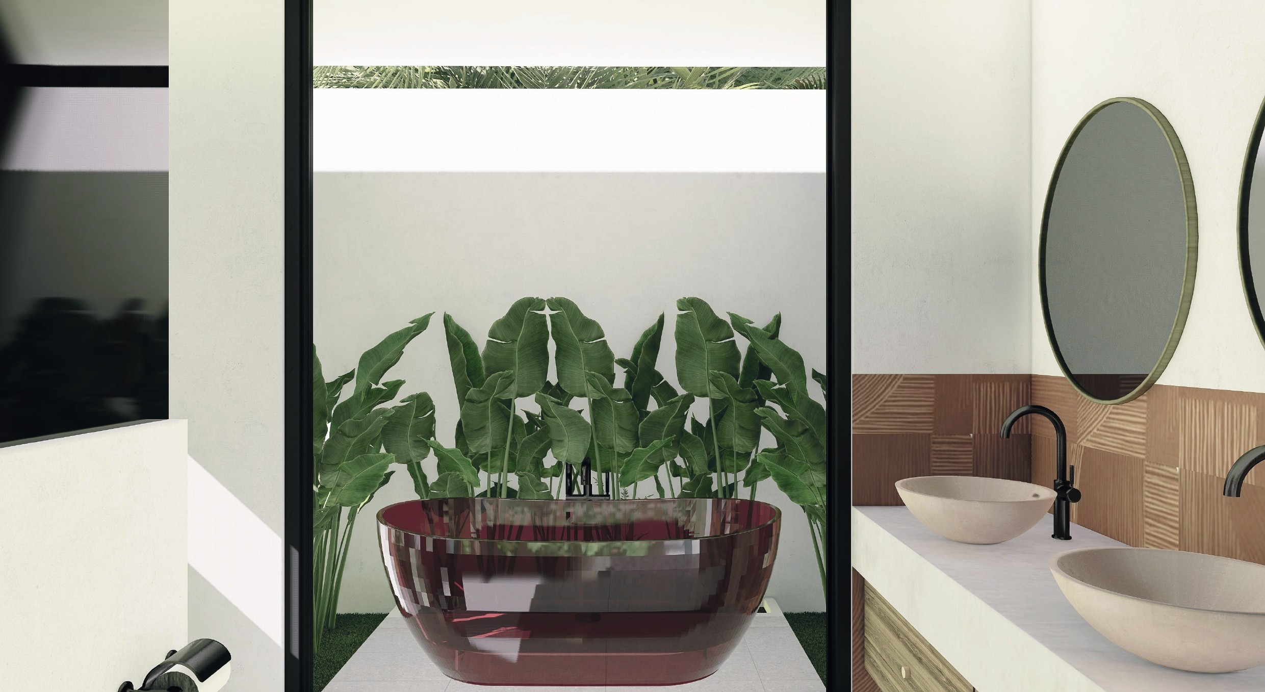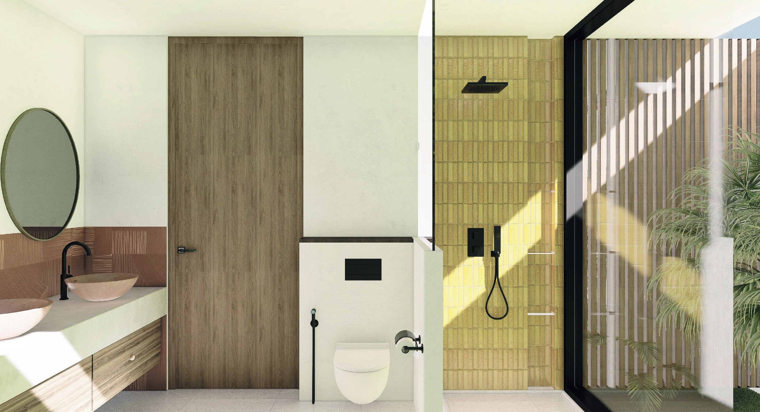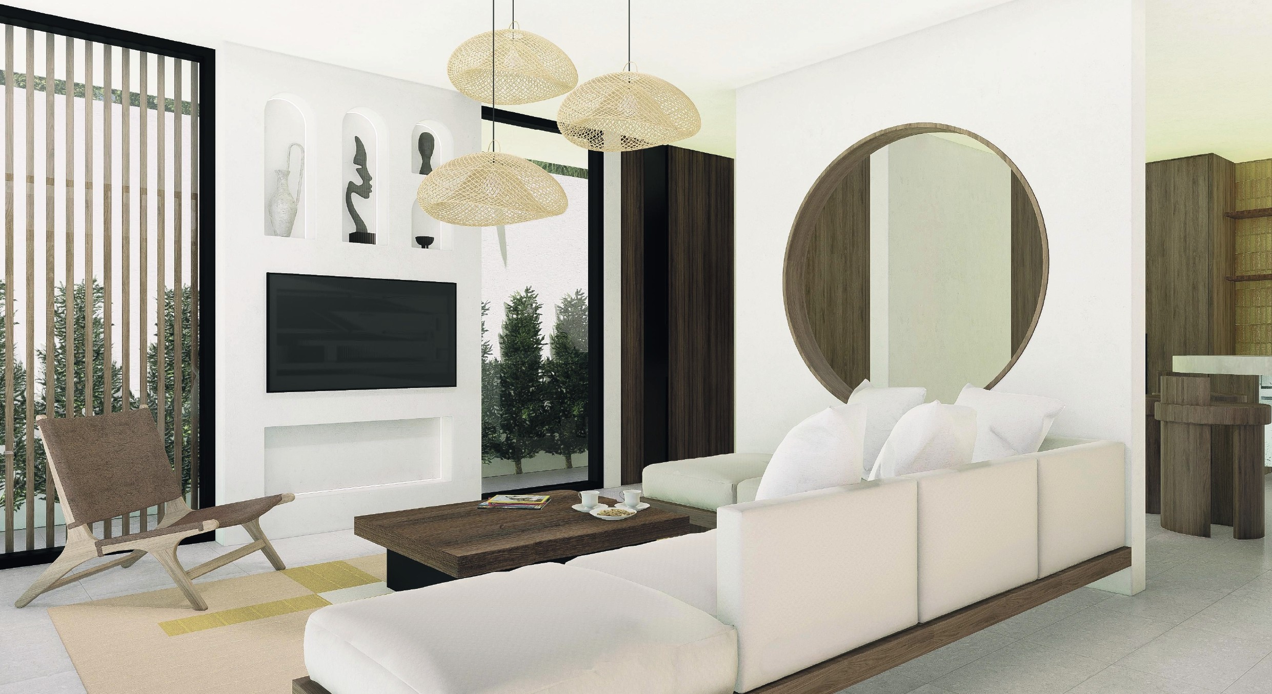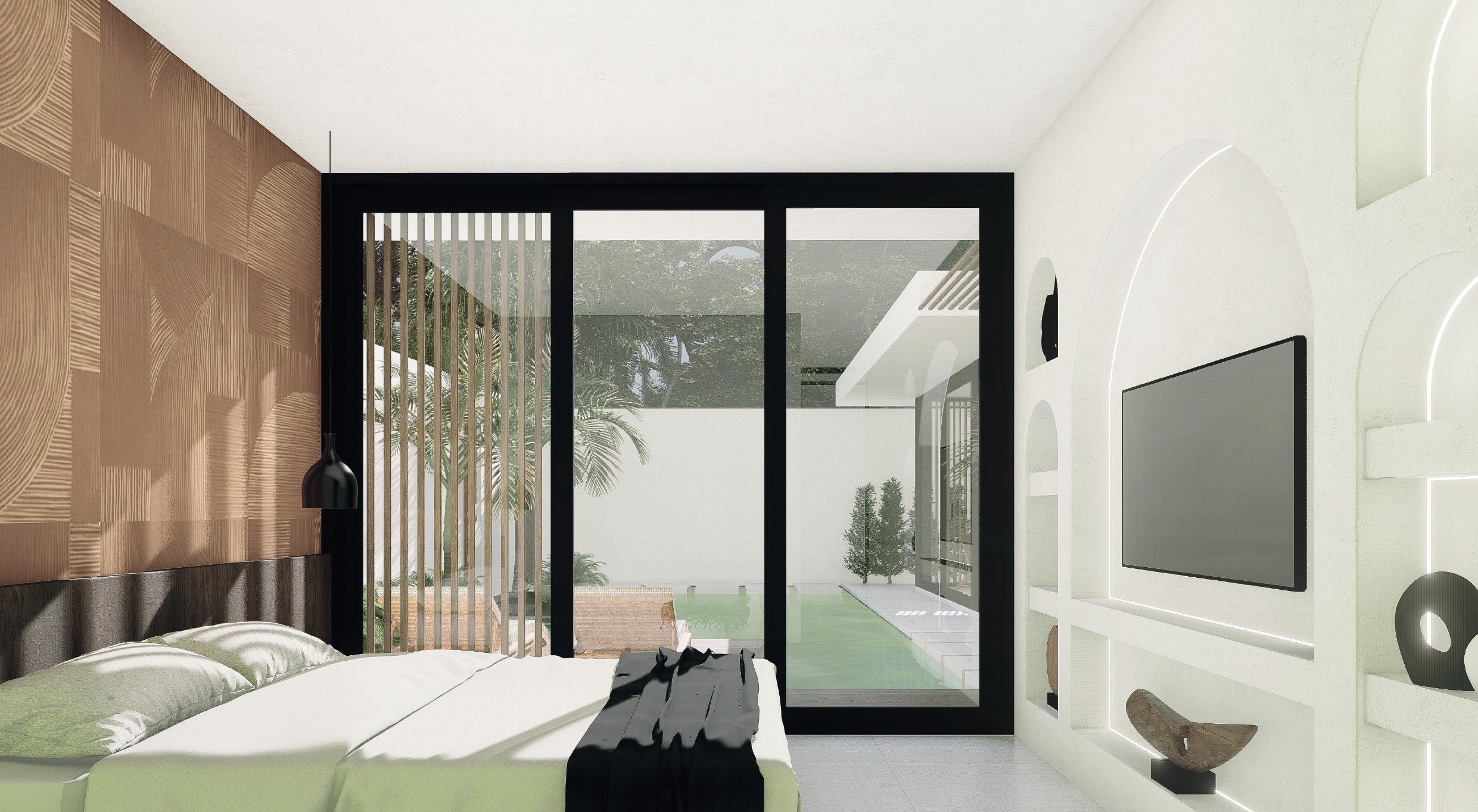 The interior design showcases a refined tropical contemporary style, combining natural textures, warm wooden accents, and minimalist lines. Each room is filled with natural light through floor-to-ceiling glass panels, creating a seamless connection between indoor comfort and outdoor serenity.
