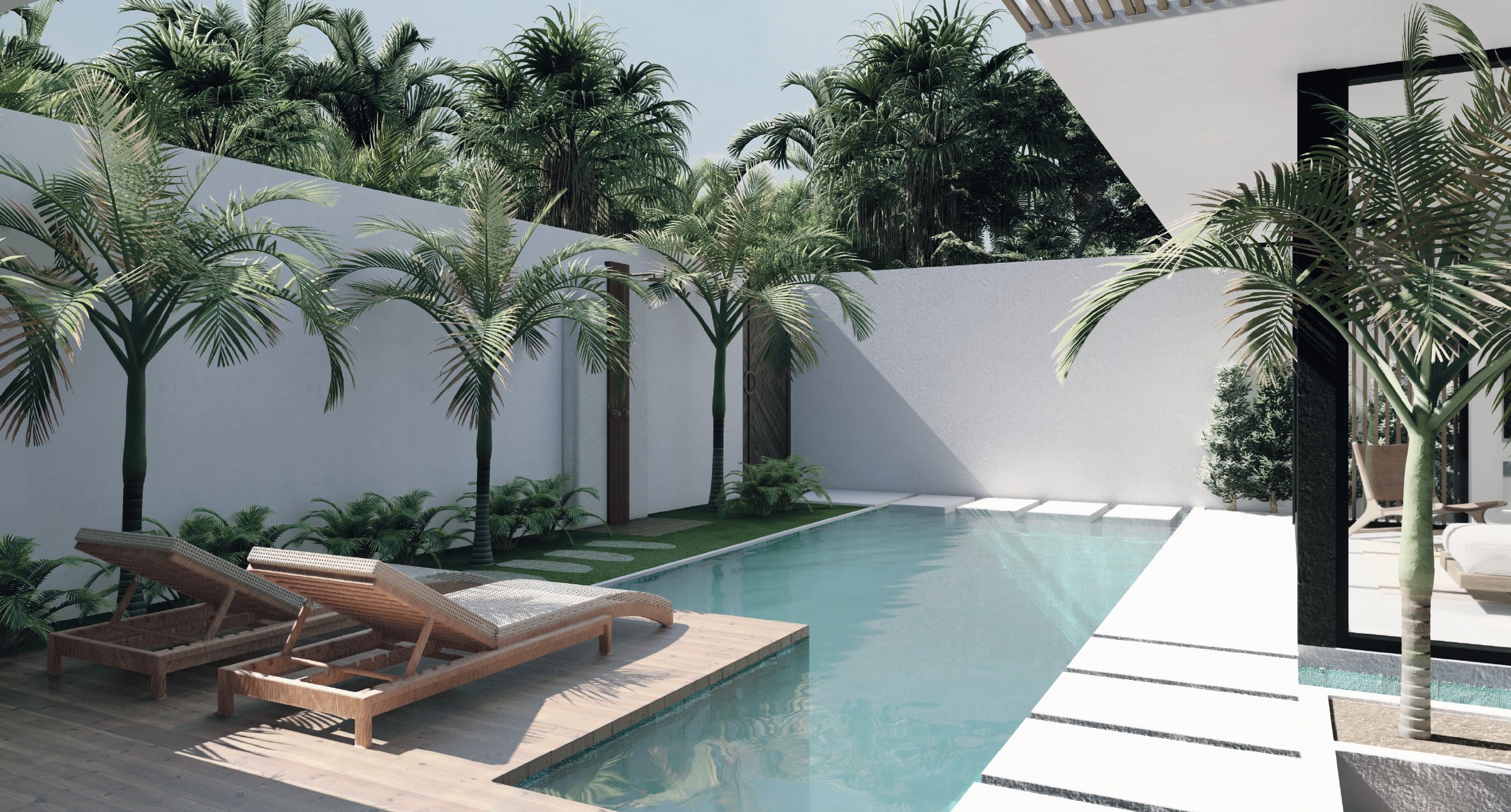 The outdoor area features a sleek swimming pool surrounded by lush tropical landscaping and sun loungers, offering an ideal space to relax or entertain. The open layout enhances the view of the garden and creates a calm, resort-like atmosphere.
