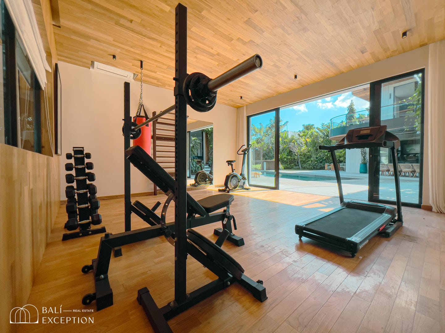 The villa is designed in an asymmetrical U-shape, featuring 6+1 bedrooms and 8 bathrooms. Expansive floor-to-ceiling glass walls in the main living areas flood the interiors with natural light. It comes fully furnished with an open-plan dining area, a tranquil living room, and a modern dry kitchen, along with a spacious laundry area and ample storage facilities. Additional amenities elevate the villa’s lifestyle experience, including a private gym, an ice bath, a relaxing sauna, and a dedicated massage room designed for ultimate wellness and relaxation.