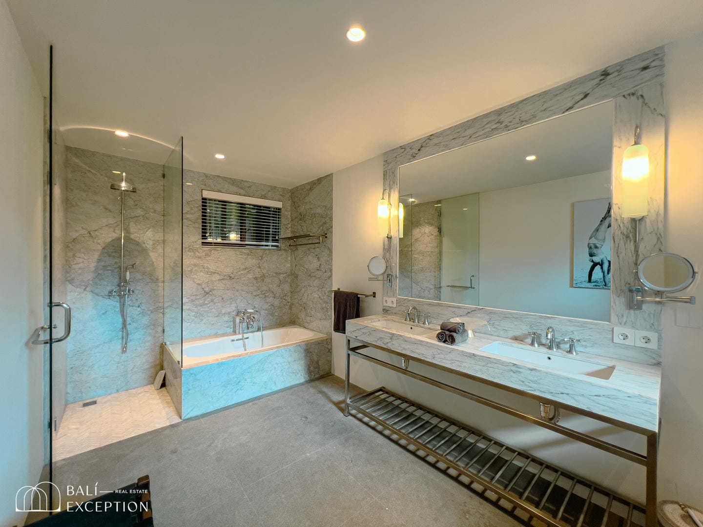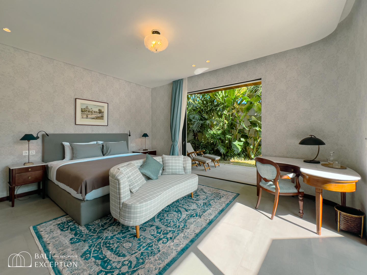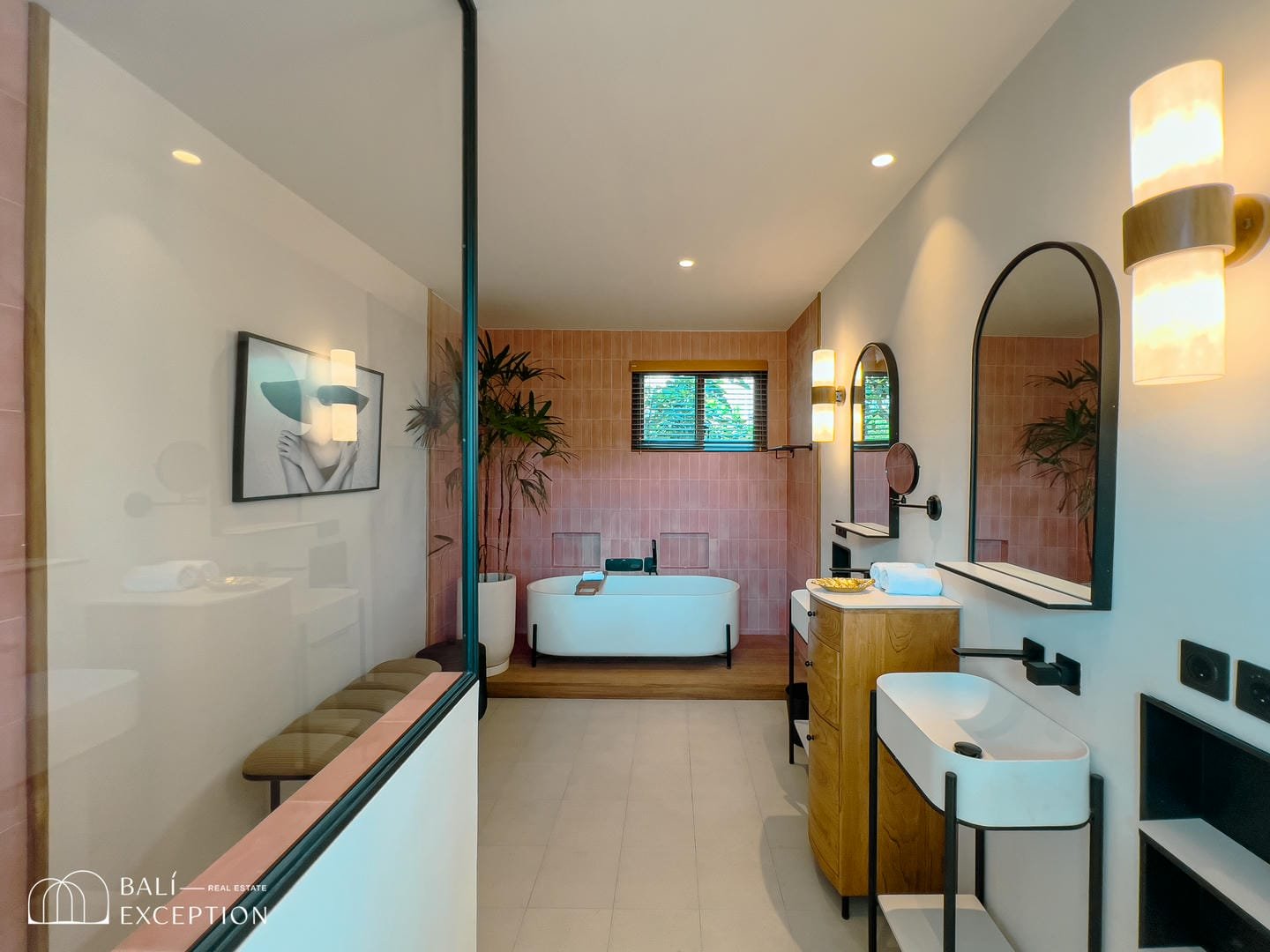 Outdoors, a sprawling garden and 90 sqm infinity pool form the villa’s centerpiece, enhanced by sun loungers, a sunken pool deck, and a round daybed perfectly positioned to capture Bali’s golden sunsets, all overlooking a protected rice field view.