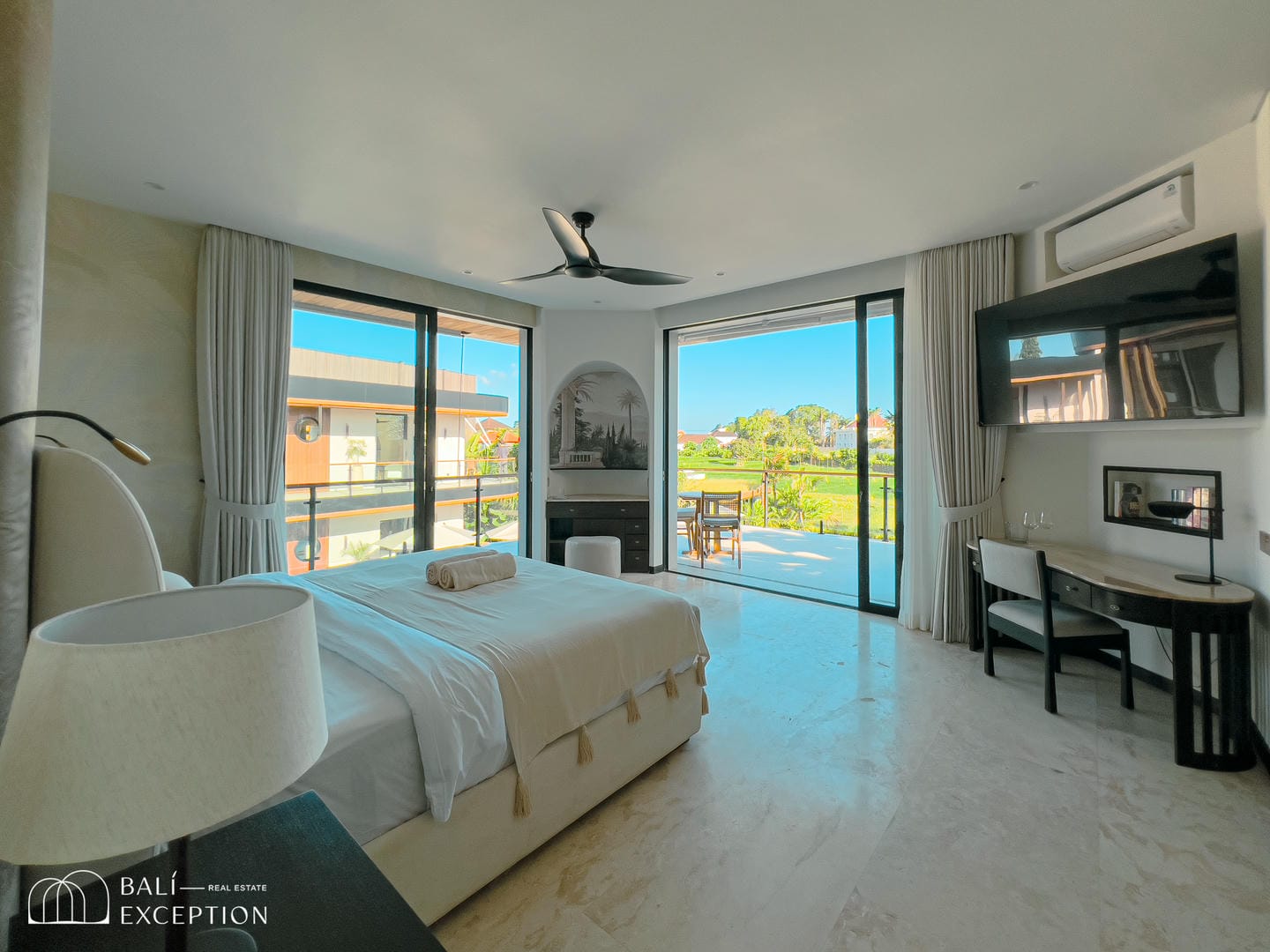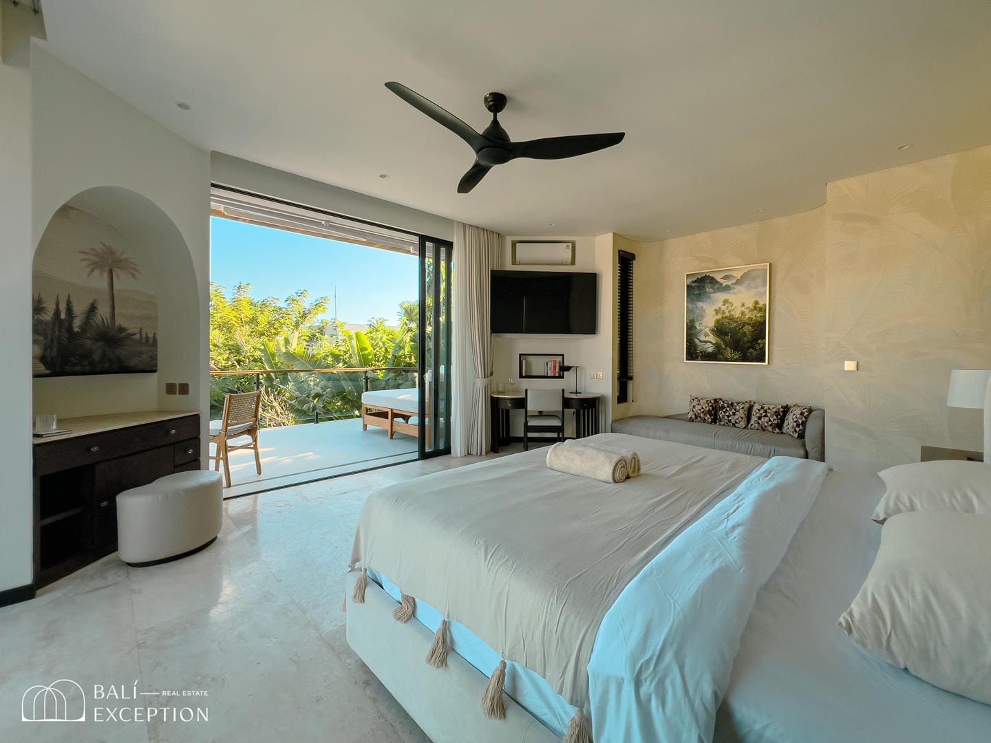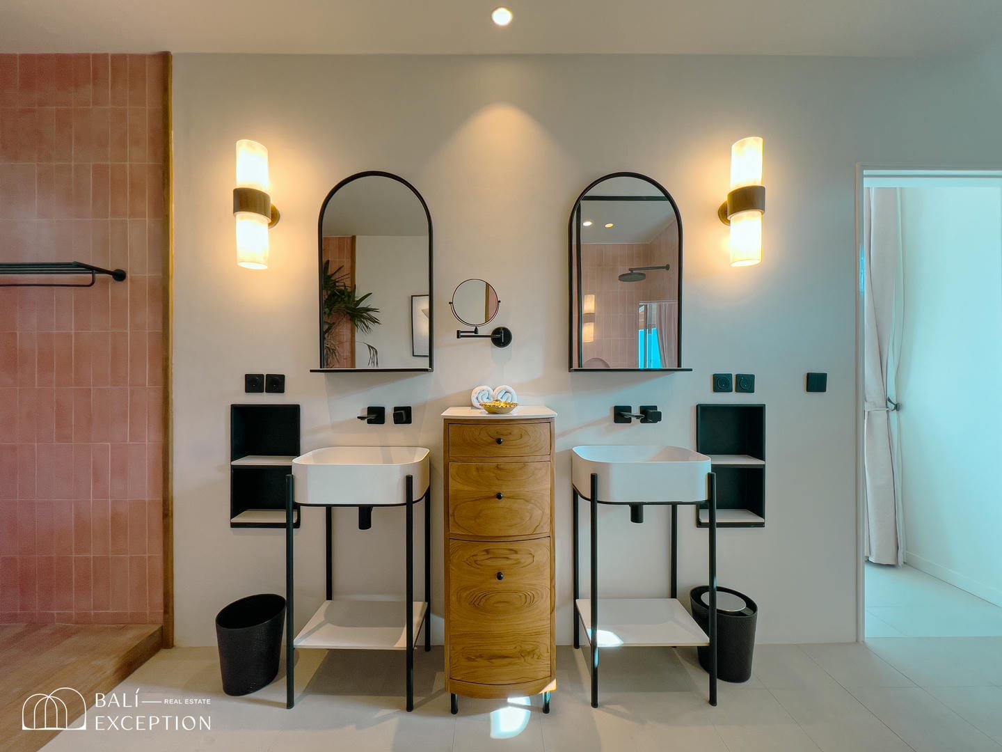 Outdoors, a sprawling garden and 90 sqm infinity pool form the villa’s centerpiece, enhanced by sun loungers, a sunken pool deck, and a round daybed perfectly positioned to capture Bali’s golden sunsets, all overlooking a protected rice field view.