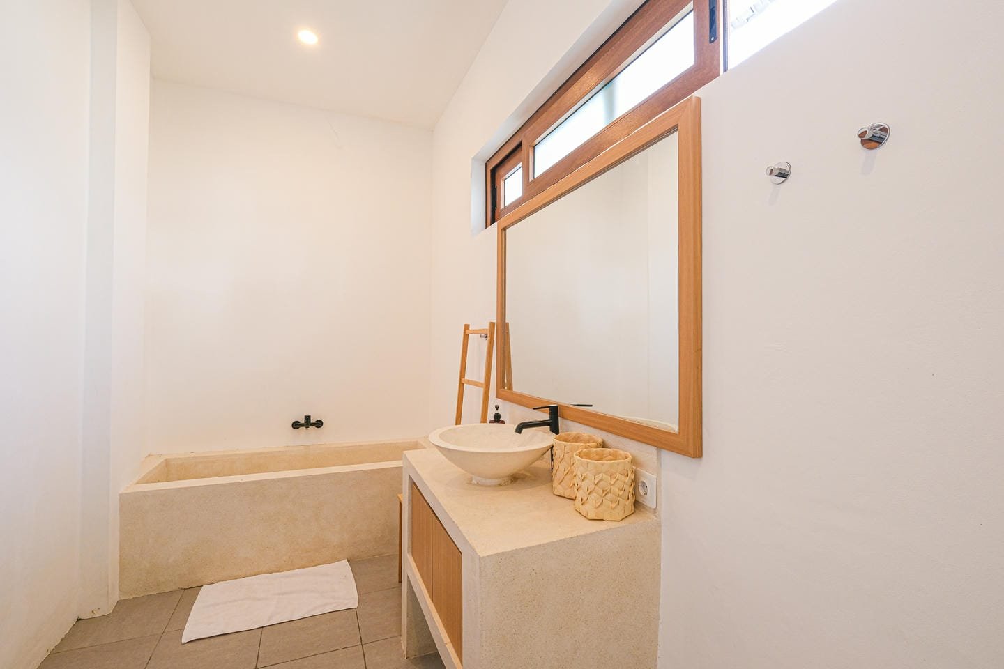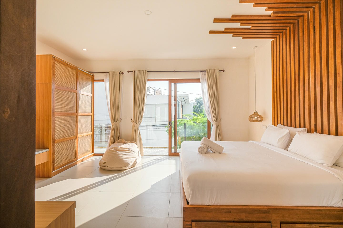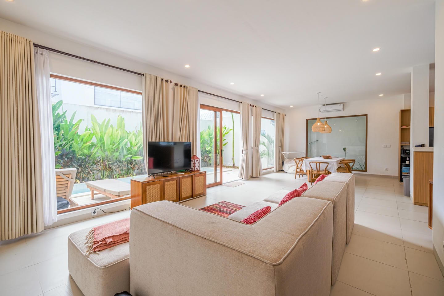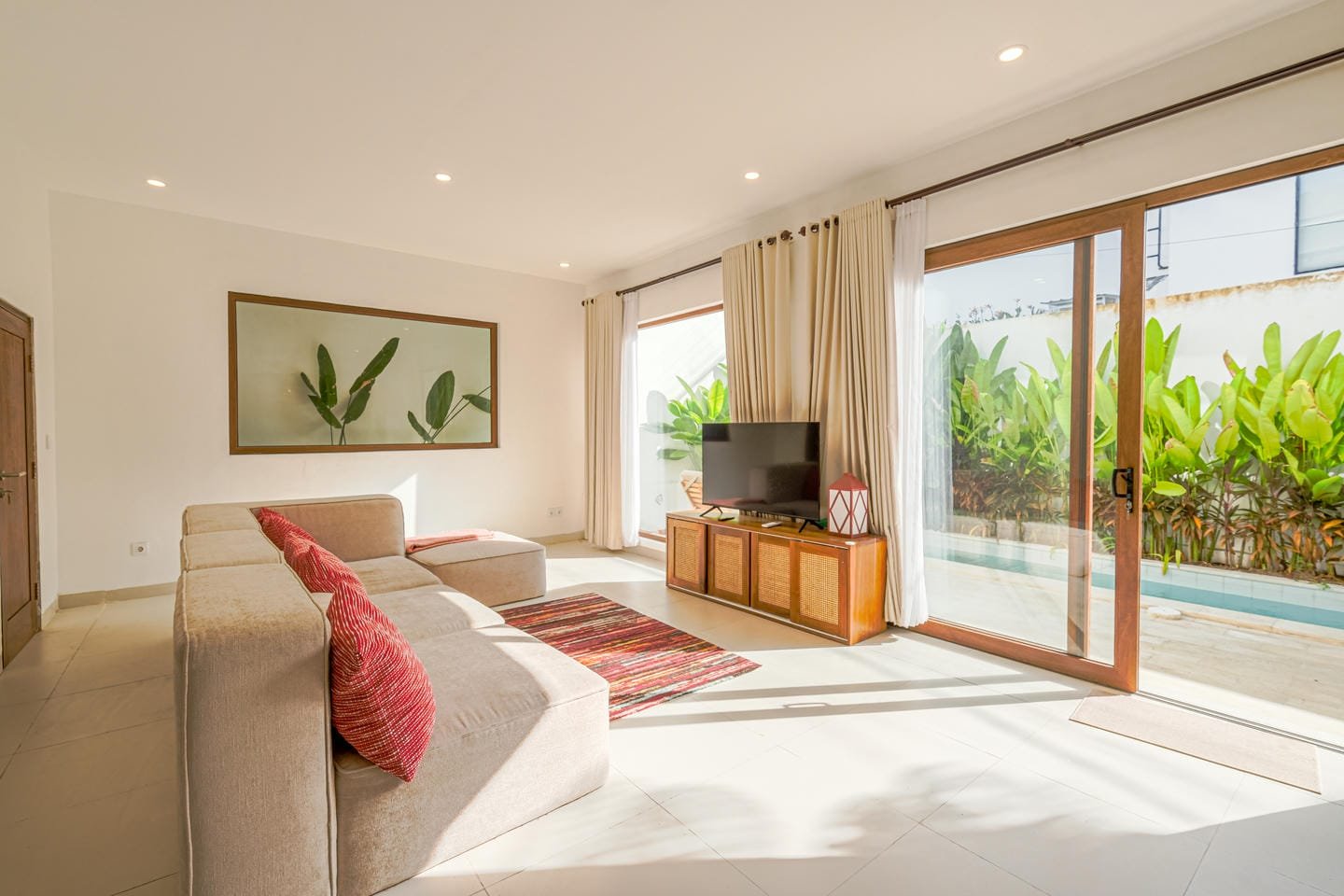 Outside, an inviting swimming pool bordered by tiles and tropical greenery sets the scene for total relaxation. With comfortable lounge chairs and a tranquil atmosphere, it’s the perfect place to unwind and enjoy Bali’s gentle rhythm.
