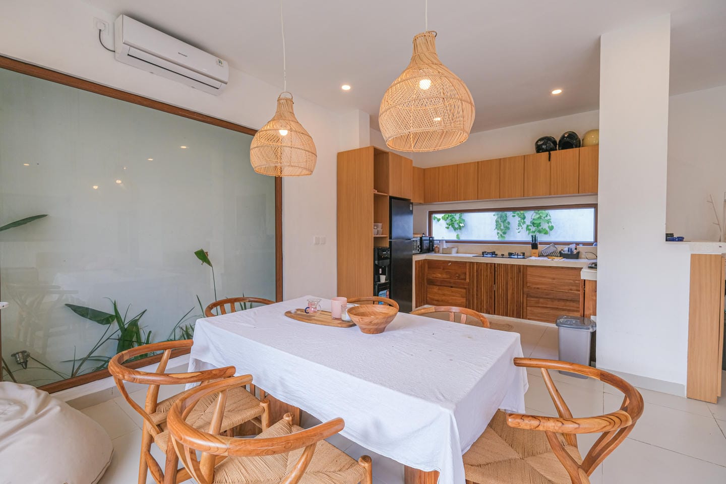 Designed in neutral tones of beige, white, and natural wood, the villa radiates warmth and timeless elegance. On the ground floor, the fully equipped open kitchen flows seamlessly into the living and dining area, creating a convivial space perfect for everyday living or hosting friends.
