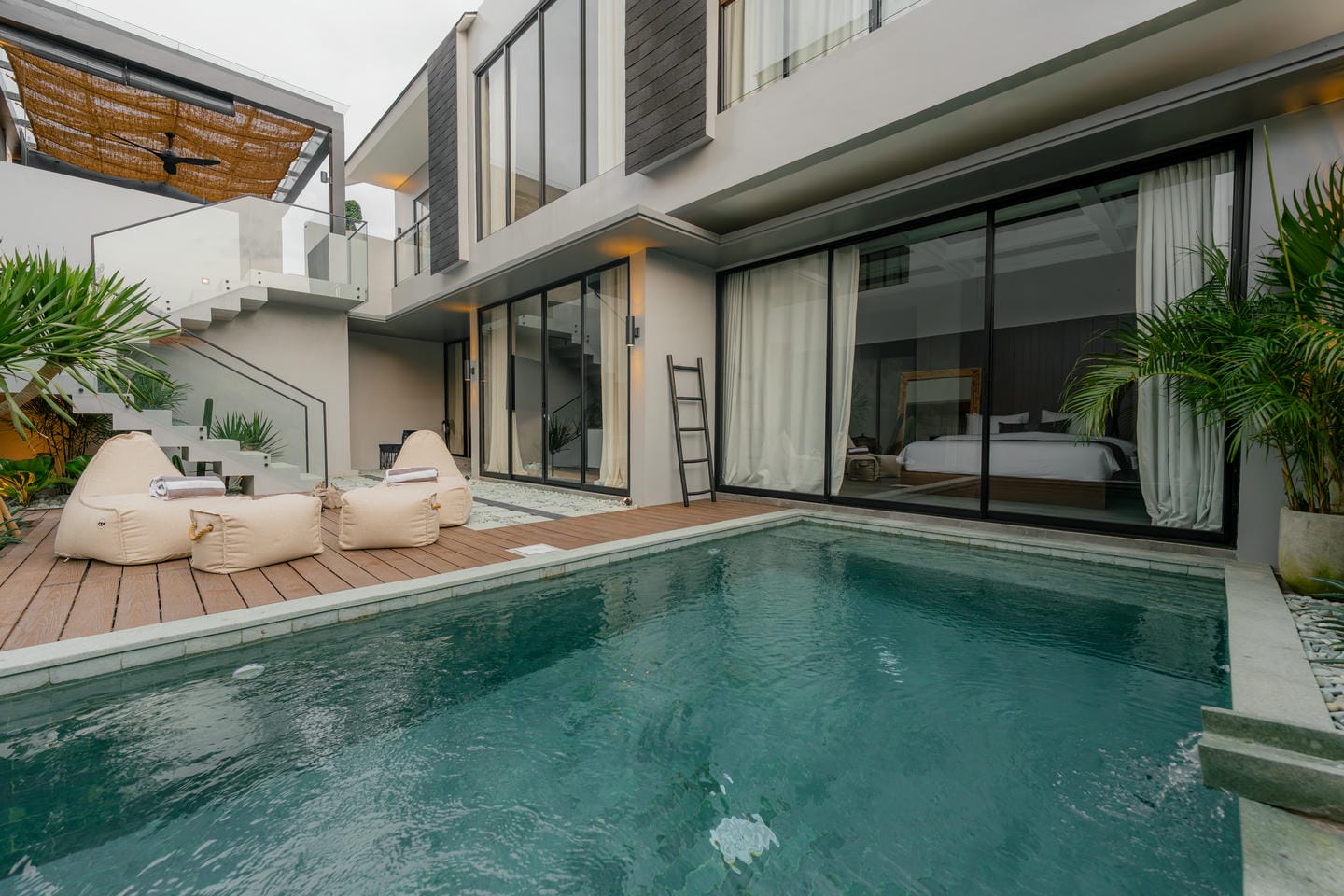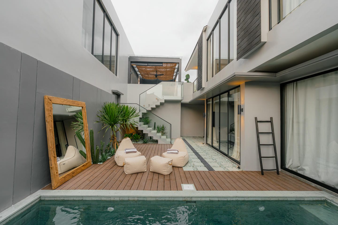 This outdoor area features a private swimming pool with a spacious deck, creating a comfortable space to relax and enjoy the outdoor atmosphere.