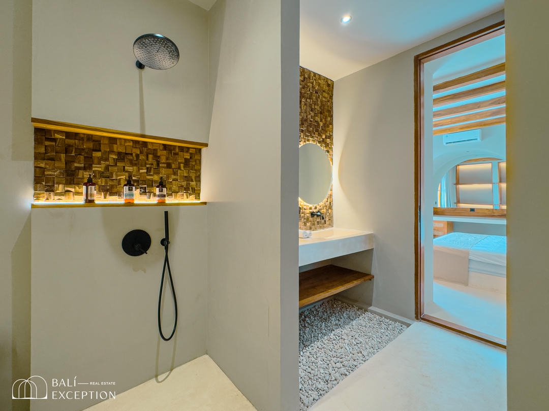 Step outside to a welcoming area featuring a private swimming pool and an outdoor shower, surrounded by a small garden with lush tropical plants that create a serene tropical ambiance.