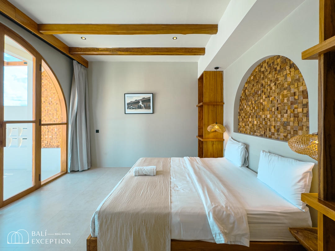 This fully furnished villa showcases a modern Mediterranean style and spans two storeys. The kitchen is seamlessly connected to the living room, offering a view of the swimming pool through large windows that allow abundant natural light to flood the space. The villa features three bedrooms with ensuite bathrooms—one located on the ground floor with direct access to the outdoor swimming pool area, and two on the upper floor with access to a private balcony. The master bedroom includes a luxurious jacuzzi and Sofa on the balcony for added comfort and relaxation.