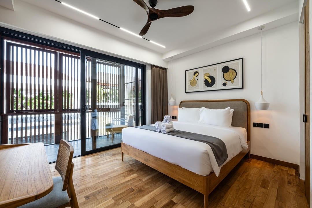 This ready villa offers another available units of 3 or 7 bedrooms, each with an enclosed living room featuring high ceiling windows and a guest toilet. It comes fully furnished with a modern, fully equipped kitchen and a comfortable dining area.